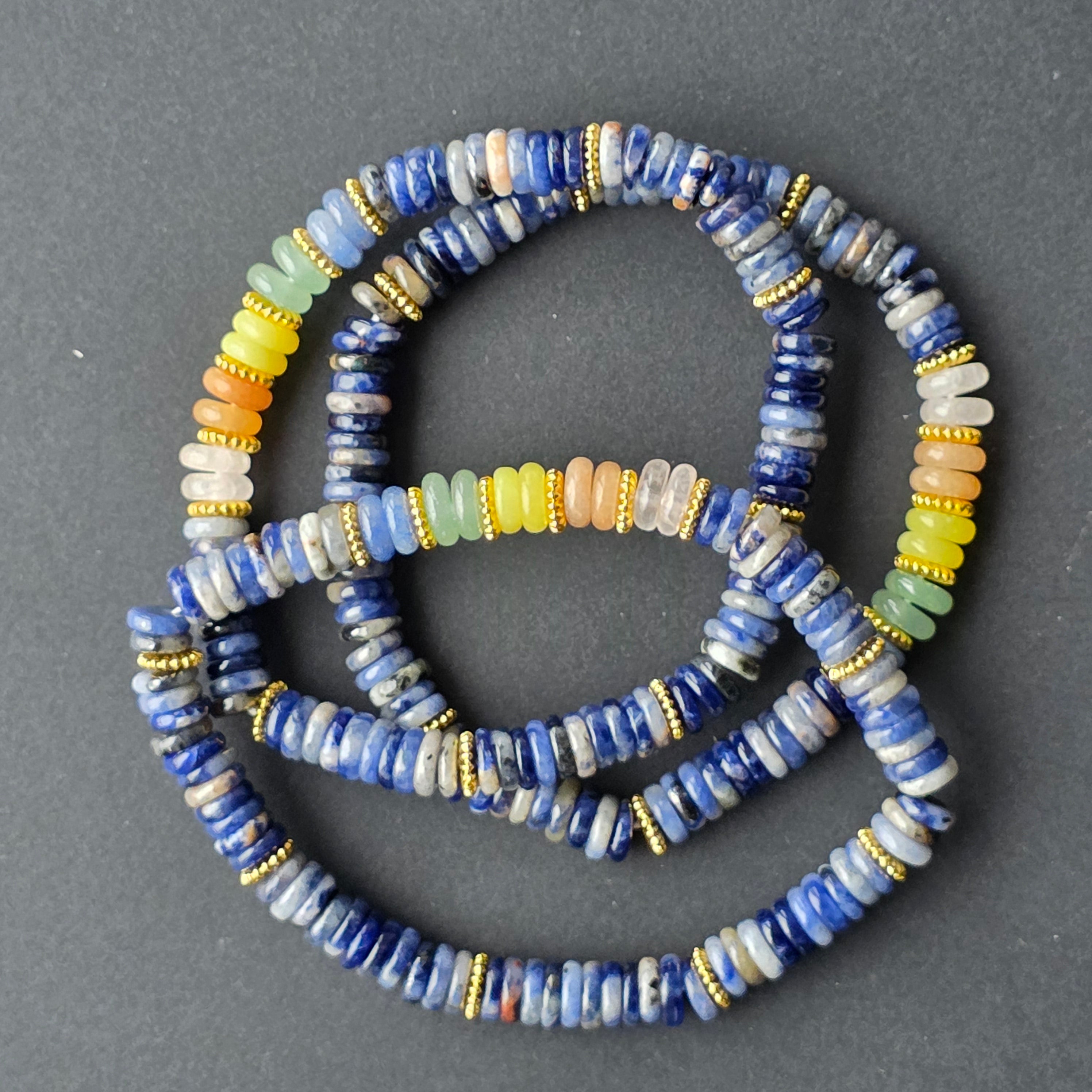 Această brățară din sodalit natural combină eleganța albastrului profund cu vibrația luminoasă a segmentului „7 chakre”, creând o piesă care se simte atât minimalistă, cât și plină de personalitate. Discurile fine, atent șlefuite, poartă nuanțele distinctive ale sodalitului — un albastru marin presărat cu fire albe, ca o mare stârnită de lumină.