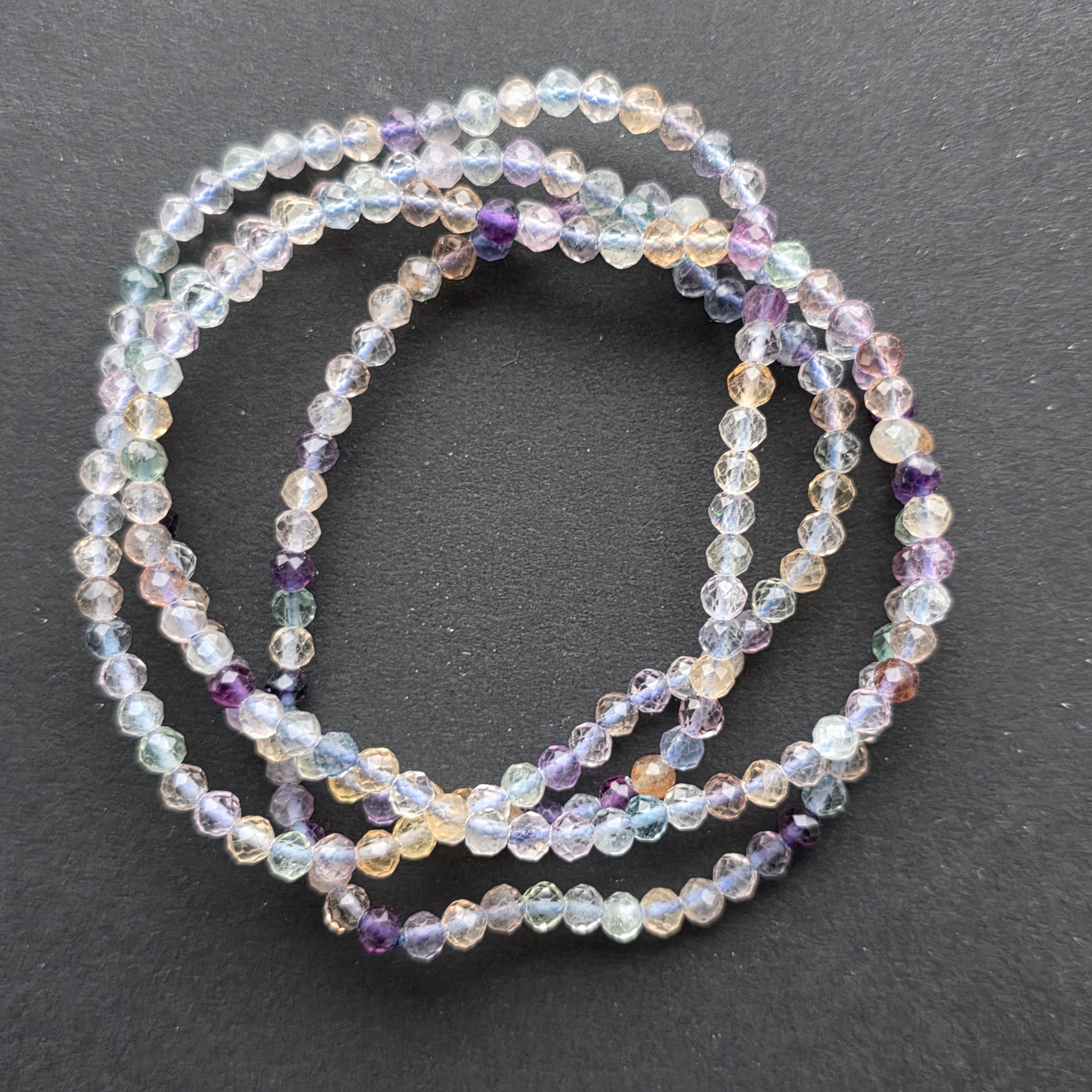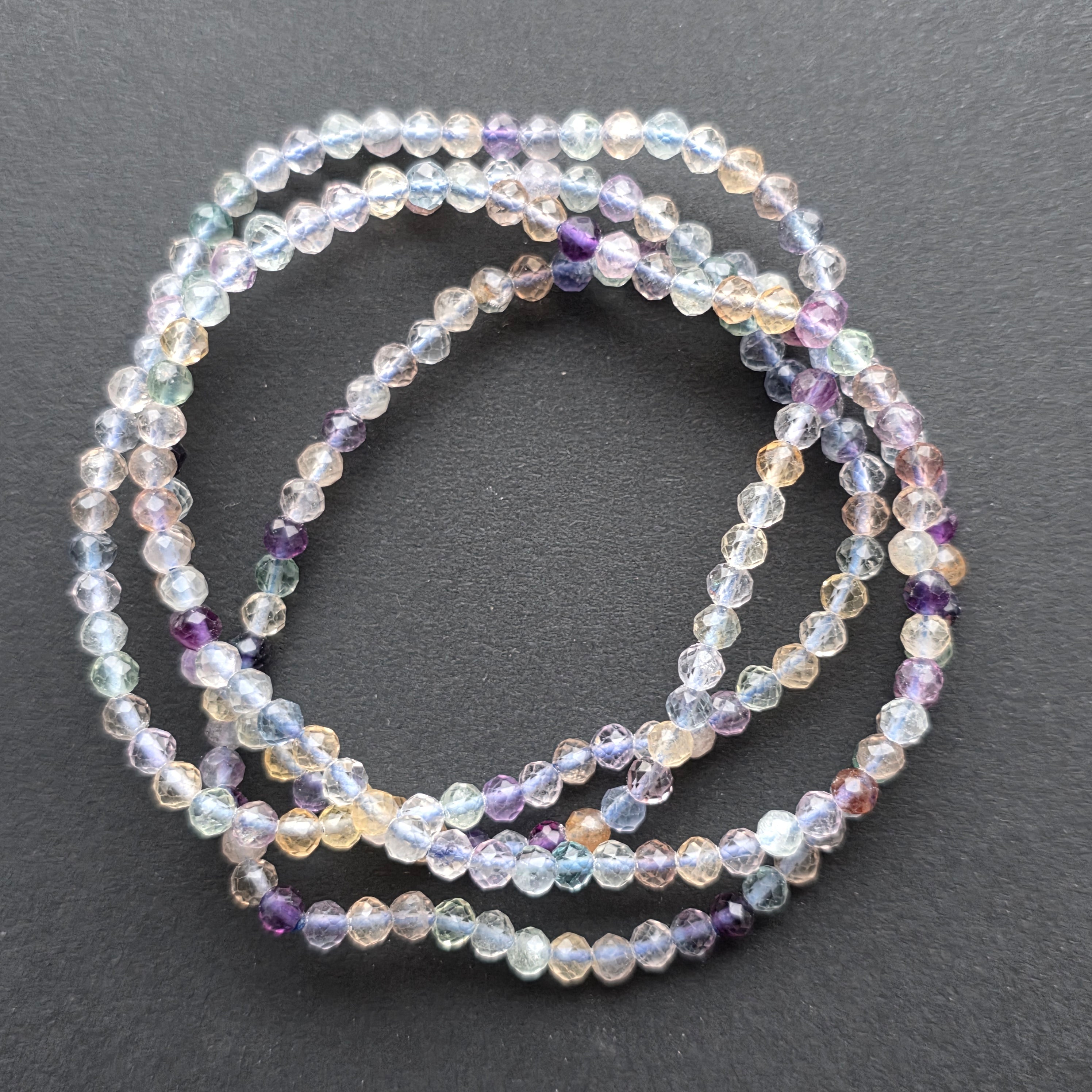 Brățara din fluorină mov este o bijuterie delicată, în care lumina pare să circule liber printre nuanțe de violet pal, mov intens și mici accente mai închise. Pietrele sunt naturale, fiecare cu propria transparență, propriul joc de reflexii și propria amprentă subtilă lăsată de natură.