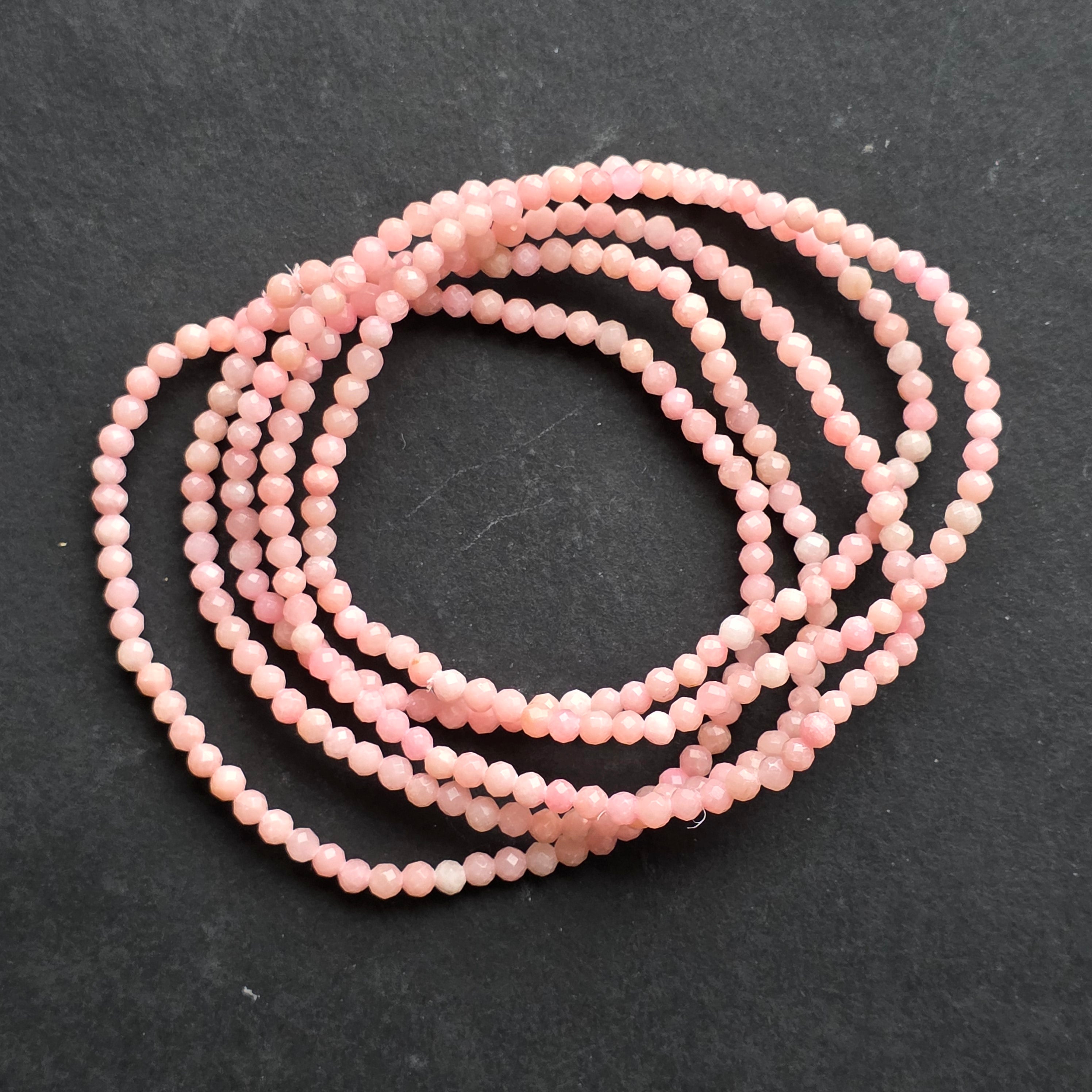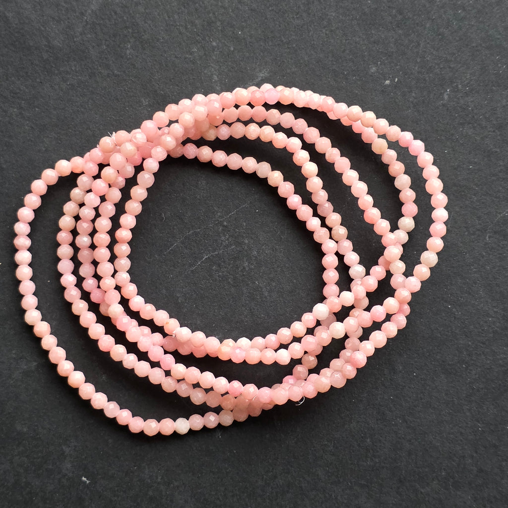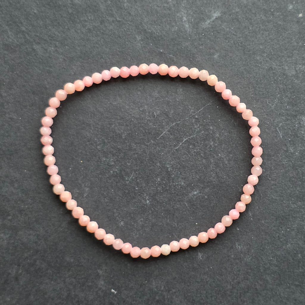O brățară delicată ca o promisiune de lumină. Mărgelele fațetate de opal roz natural, cu diametrul de 3 mm, strălucesc în nuanțe diafane de roz pal, crem și bej cald, formând un joc subtil de culori ce emană feminitate și armonie. Este o bijuterie fină, cu o energie calmă și protectoare, menită să aducă liniște inimii și încredere în propriul drum.