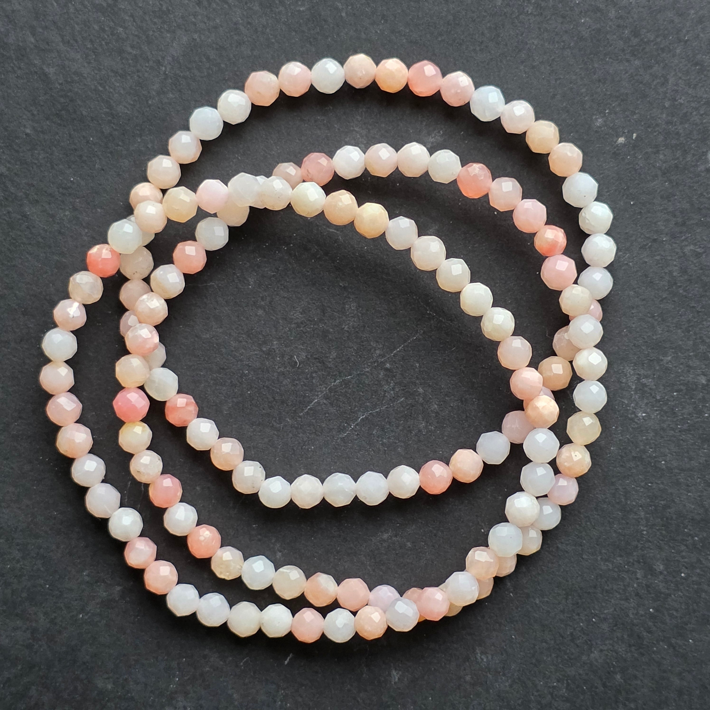 O brățară delicată ca o promisiune de lumină. Mărgelele fațetate de opal roz natural, cu diametrul de 4 mm, strălucesc în nuanțe diafane de roz pal, crem și bej cald, formând un joc subtil de culori ce emană feminitate și armonie. Este o bijuterie fină, cu o energie calmă și protectoare, menită să aducă liniște inimii și încredere în propriul drum.