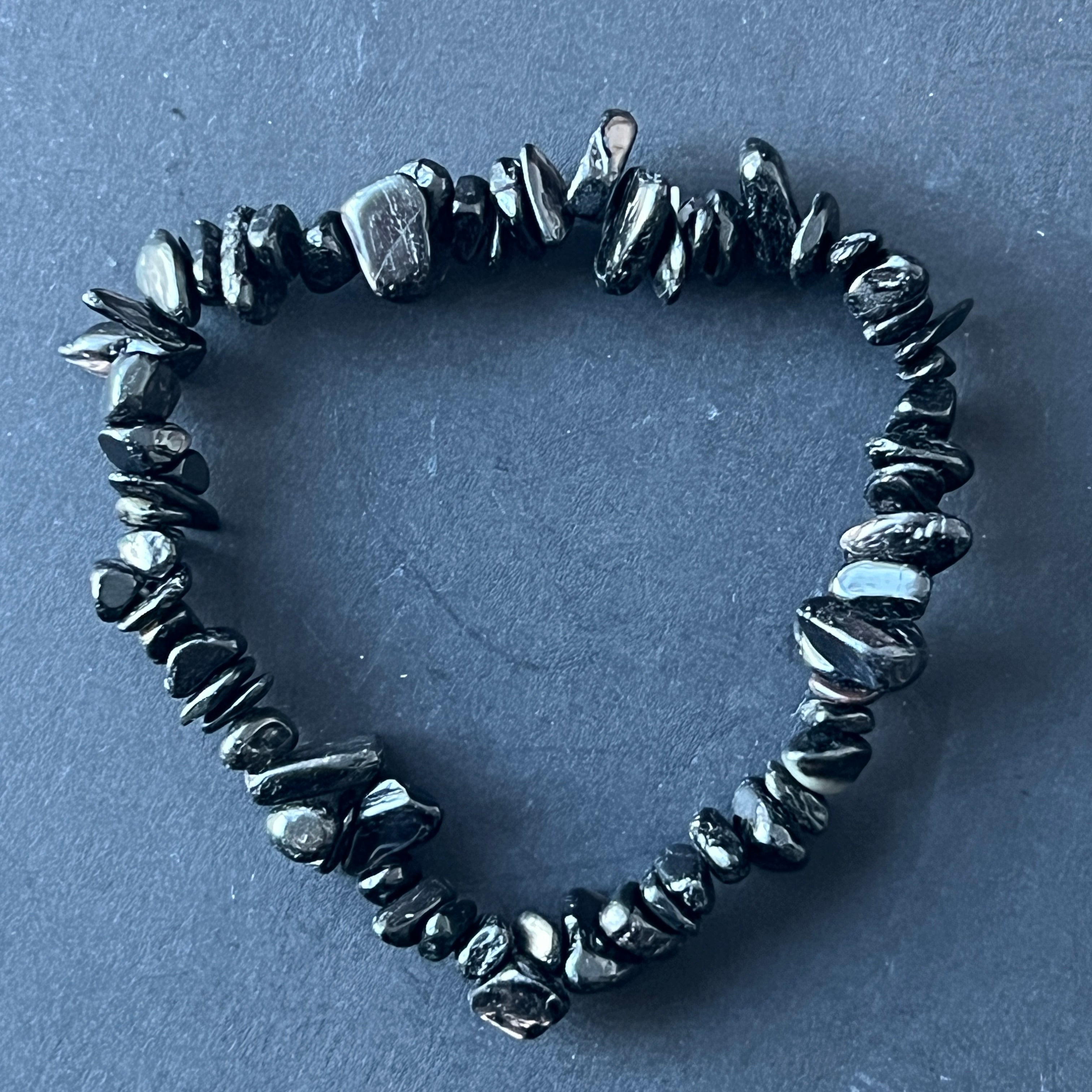 Această brățară din hipersten dezvăluie o frumusețe tăcută și sofisticată, cu reflexe sidefate care se mișcă subtil odată cu lumina. Fiecare fragment neregulat de piatră poartă urmele Pământului antic din care s-a născut, emanând o energie calmă, profundă și centrată.