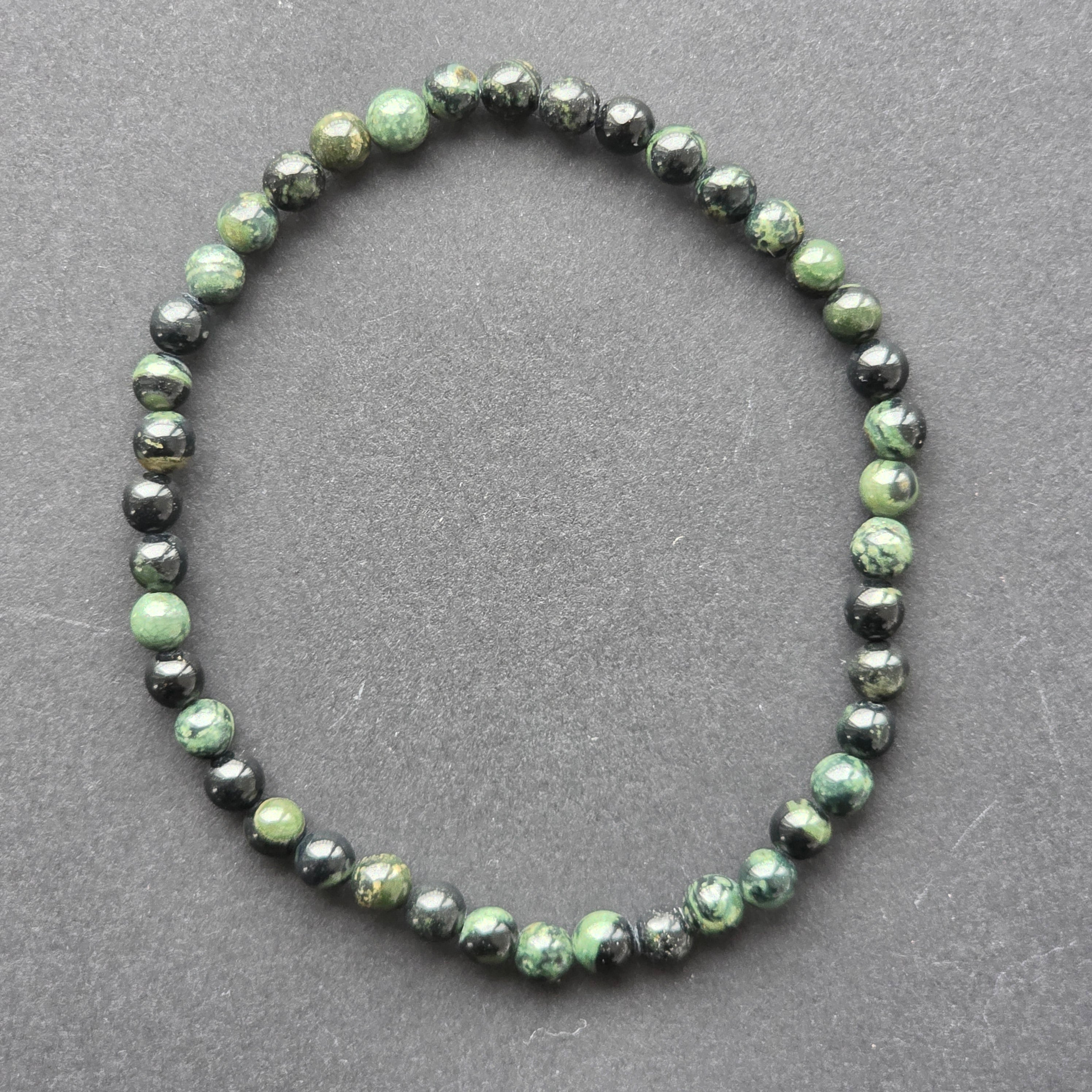 Brățara din jasp kambaba poartă în ea liniștea adâncimilor, culorile pădurilor tropicale și misterul pietrelor vechi de milioane de ani. Textura sa organică, verde-închis combinat cu negru catifelat, pare sculptată de timp și de natură, ca o hartă subtilă a lumilor ascunse sub scoarța Pământului.