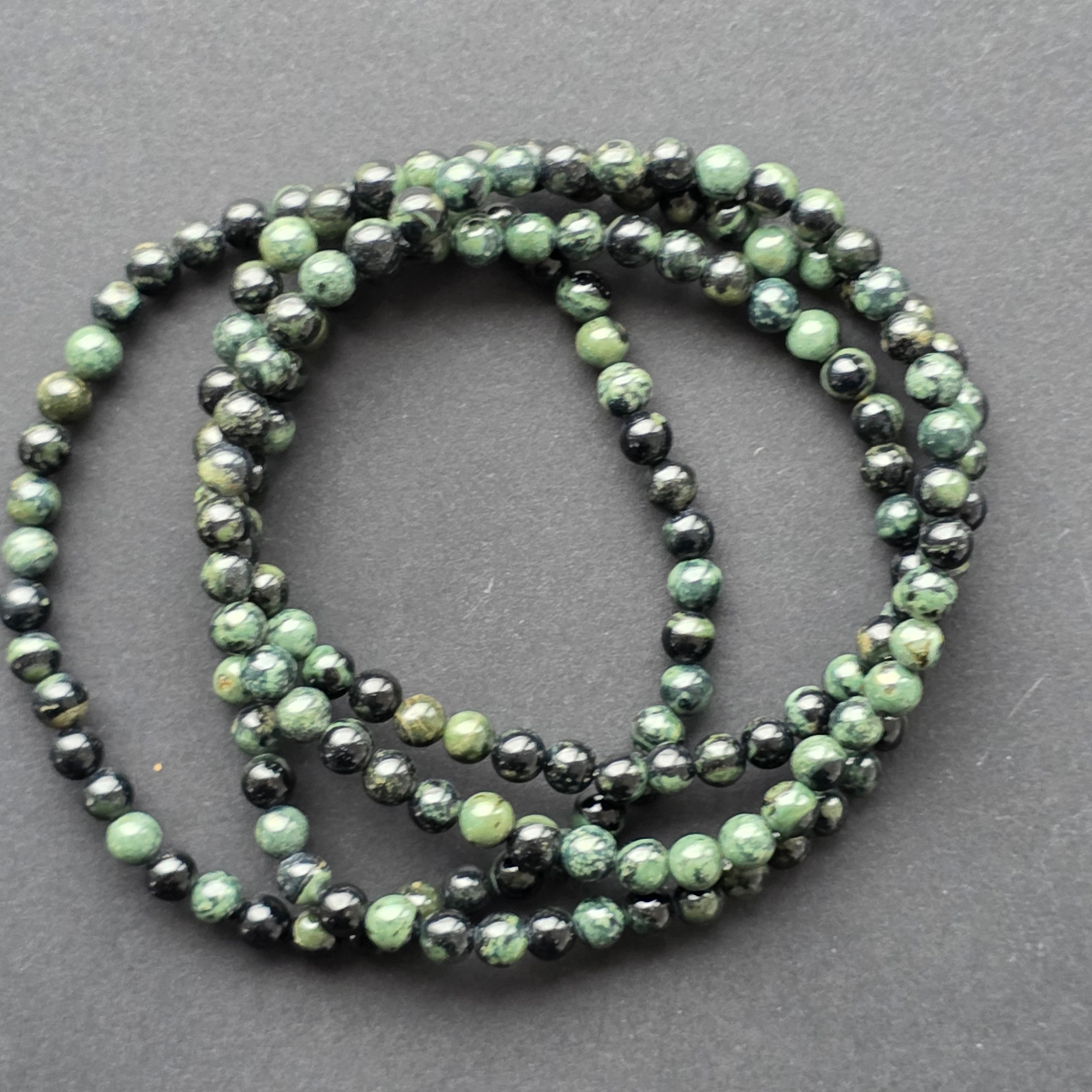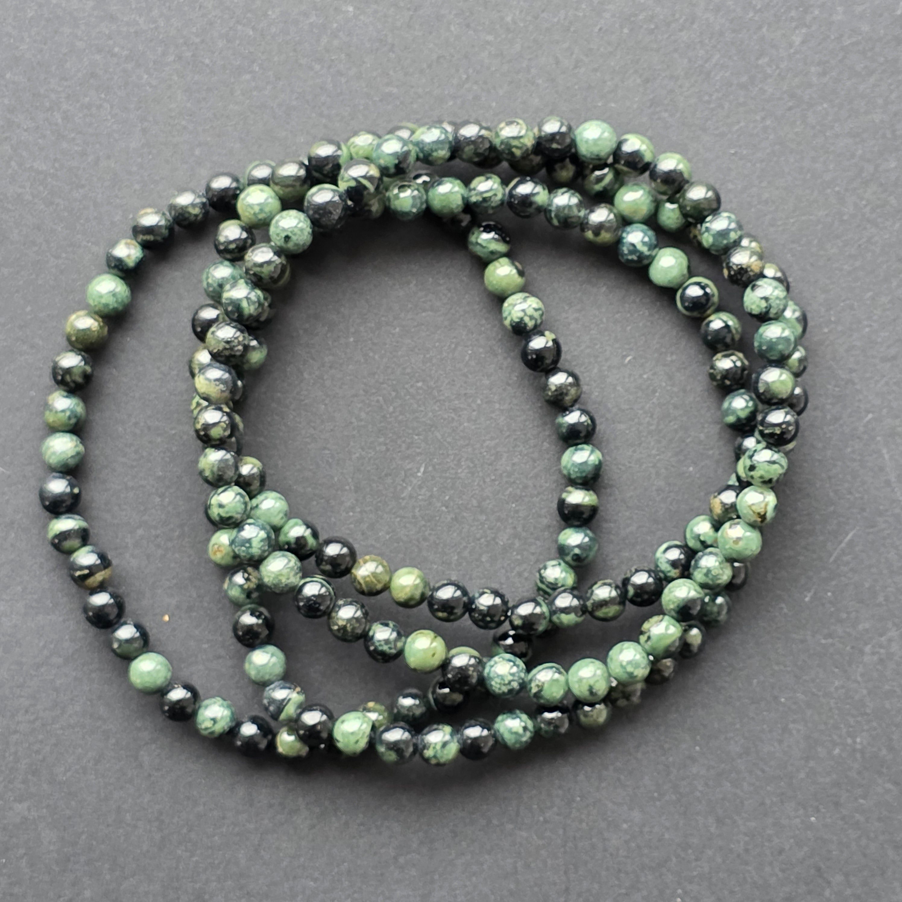 Fiecare mărgea este o mică lume: unele sunt mai întunecate, aproape negre, altele dezvăluie cercuri verzi, structuri naturale și modele care nu se repetă niciodată. Această varietate discretă este caracteristică jaspului kambaba, un mineral apreciat de colecționari și de cei care iubesc pietrele cu personalitate profundă.