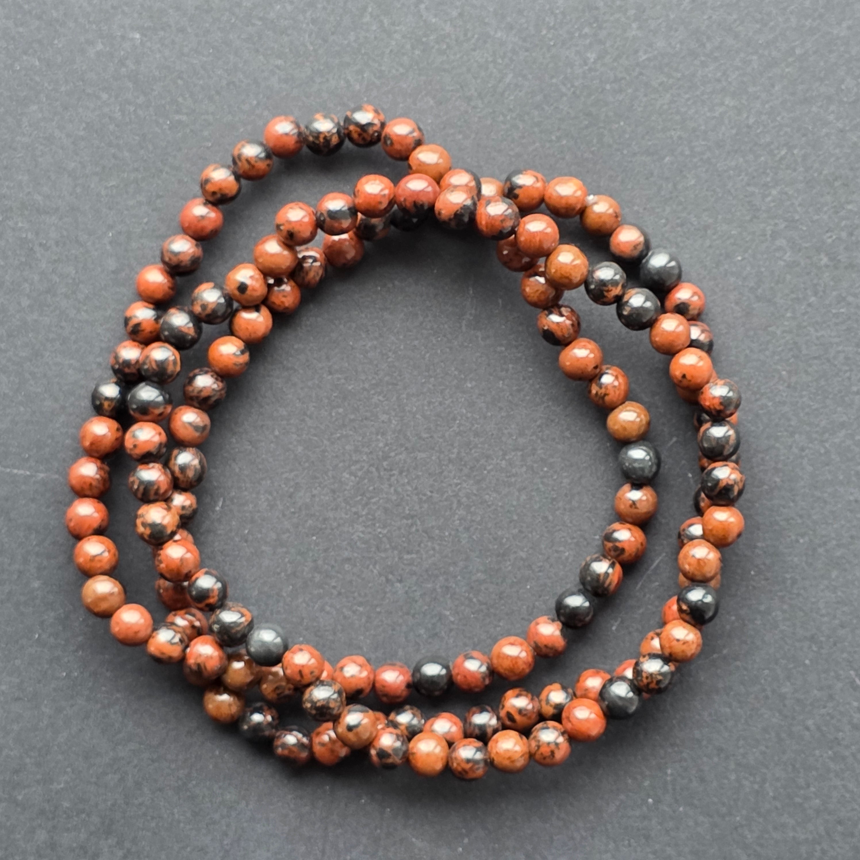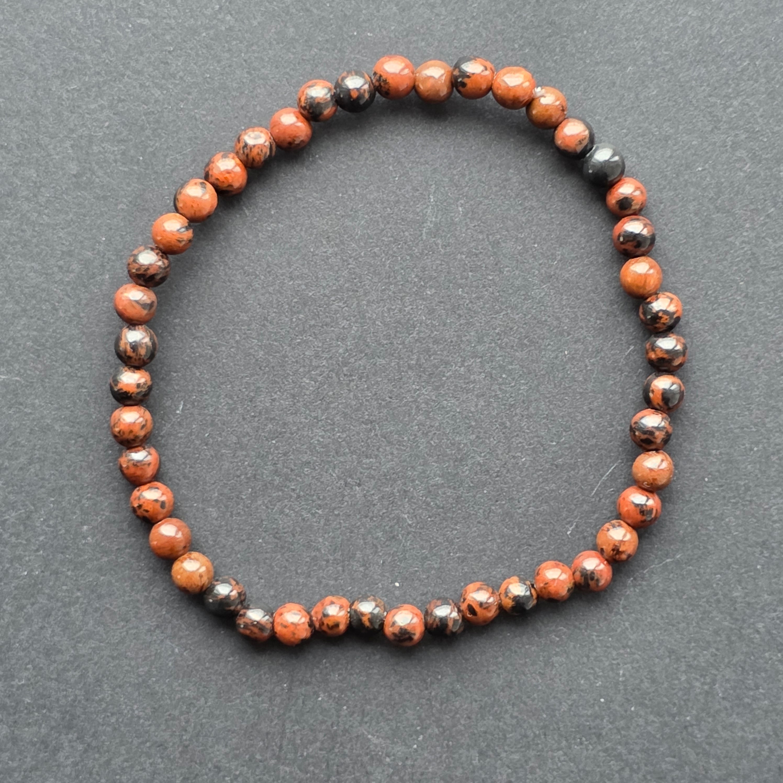 Brățara din obsidian mahogany este o piesă cu o estetică caldă, pământie, care combină nuanțele de maro ciocolatiu cu umbre negre adânci, într-un contrast organic specific acestui tip de obsidian. Fiecare mărgea este un mic fragment de lavă solidificată, purtând în interiorul ei urme de foc îmblânzit și structură naturală.