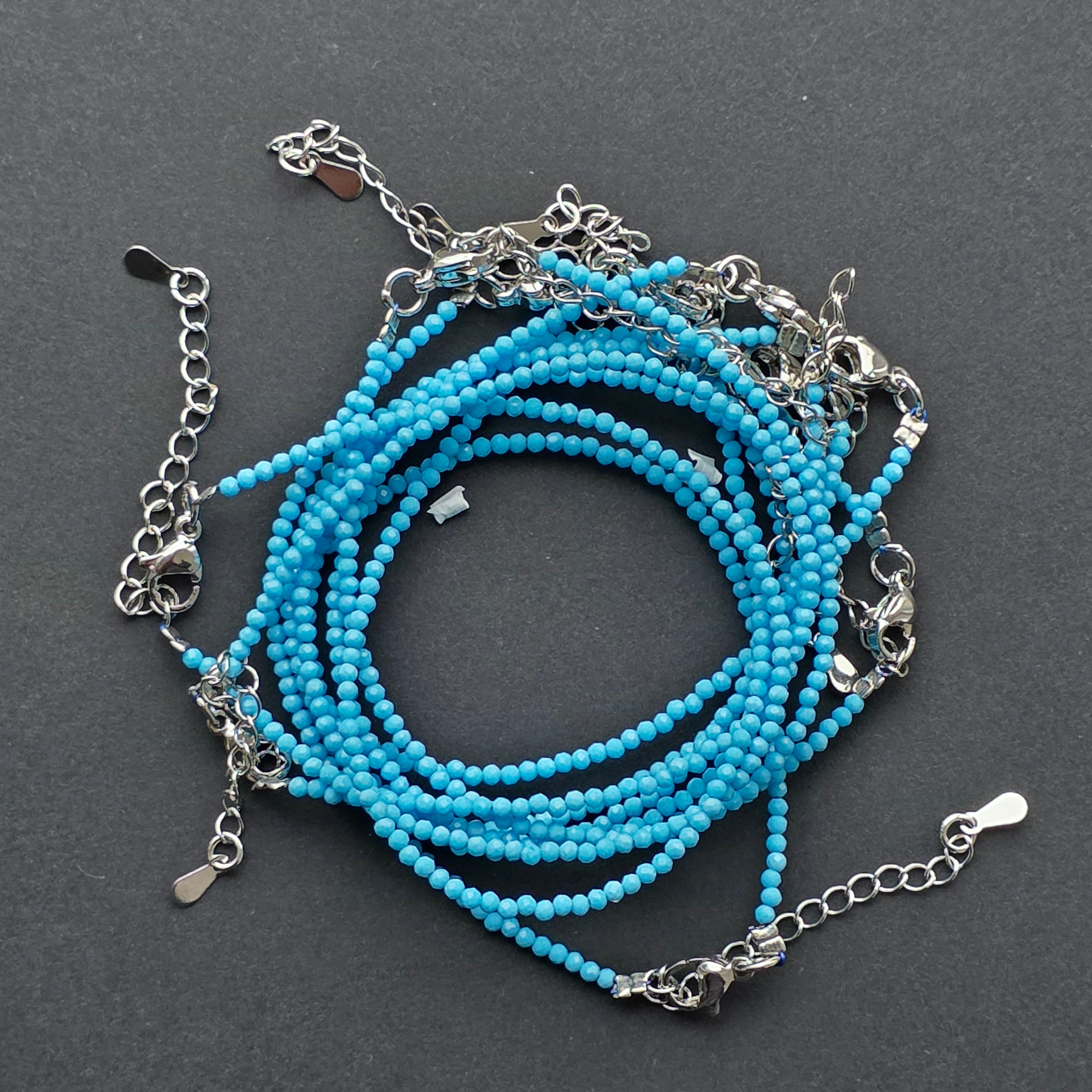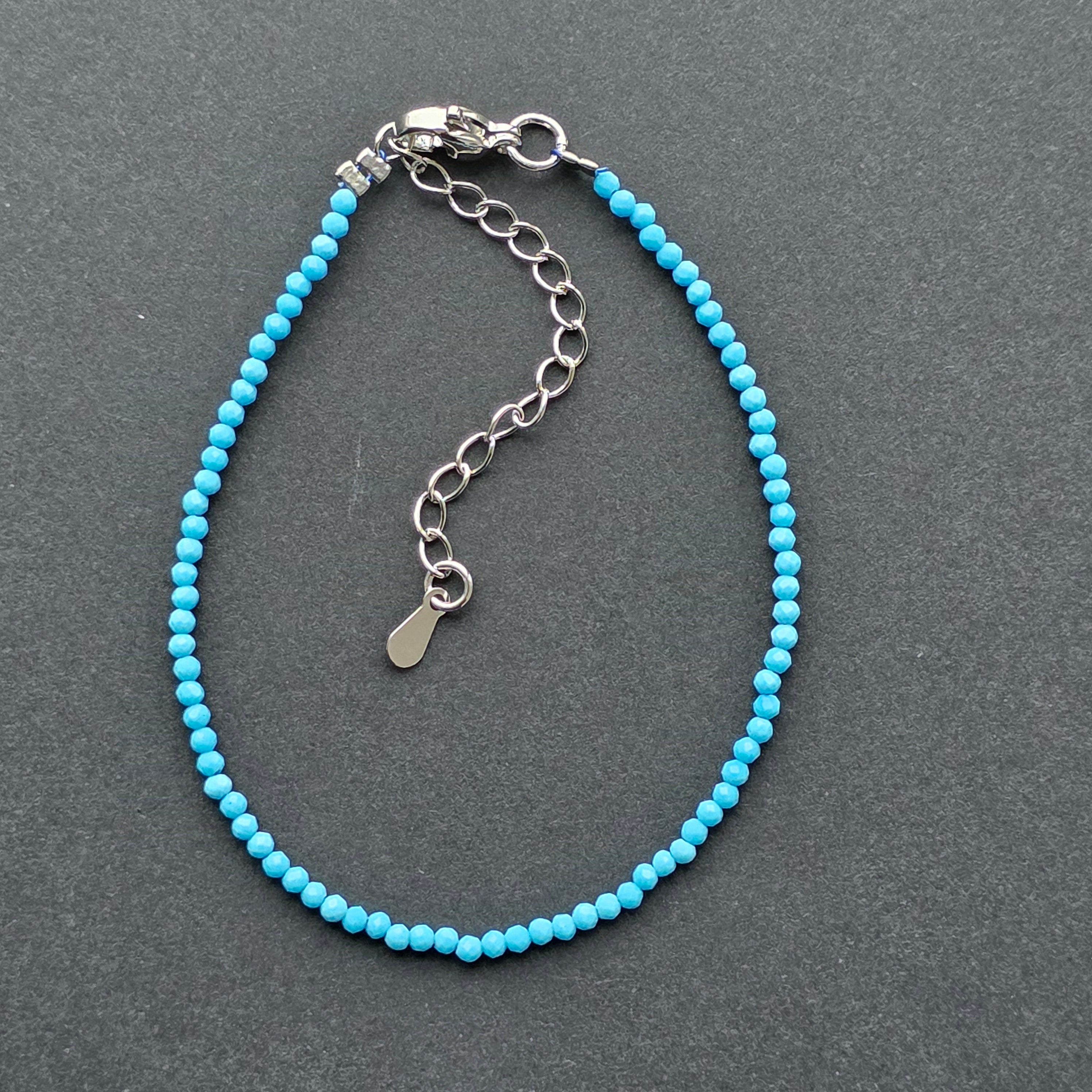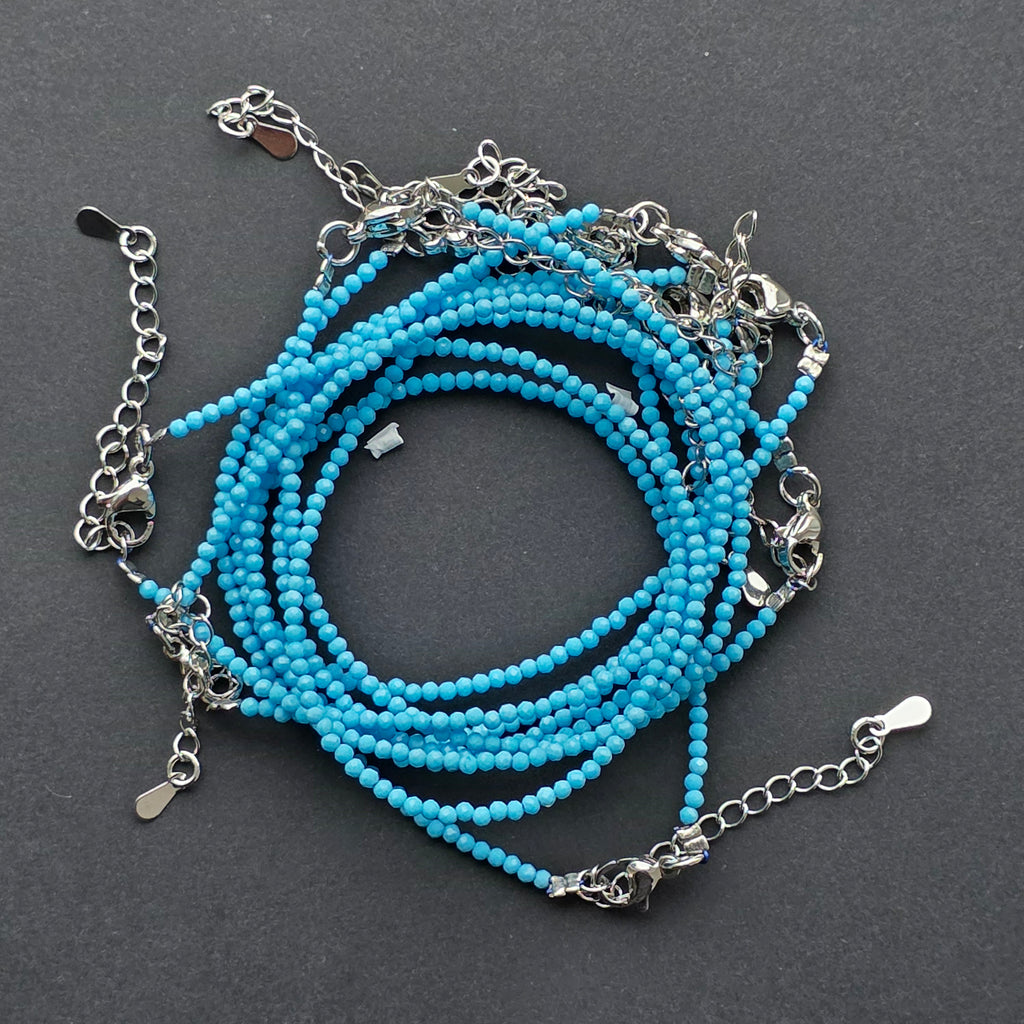 Există piese care aduc liniște doar prin culoarea lor, iar această brățară din howlit albastru este una dintre acele bijuterii delicate care par să respire calm și claritate. Mărgelele minuscule de 2 mm, perfect fațetate, surprind lumina în reflexii fine, discrete, transformând fiecare mișcare a încheieturii într-un joc subtil de străluciri.