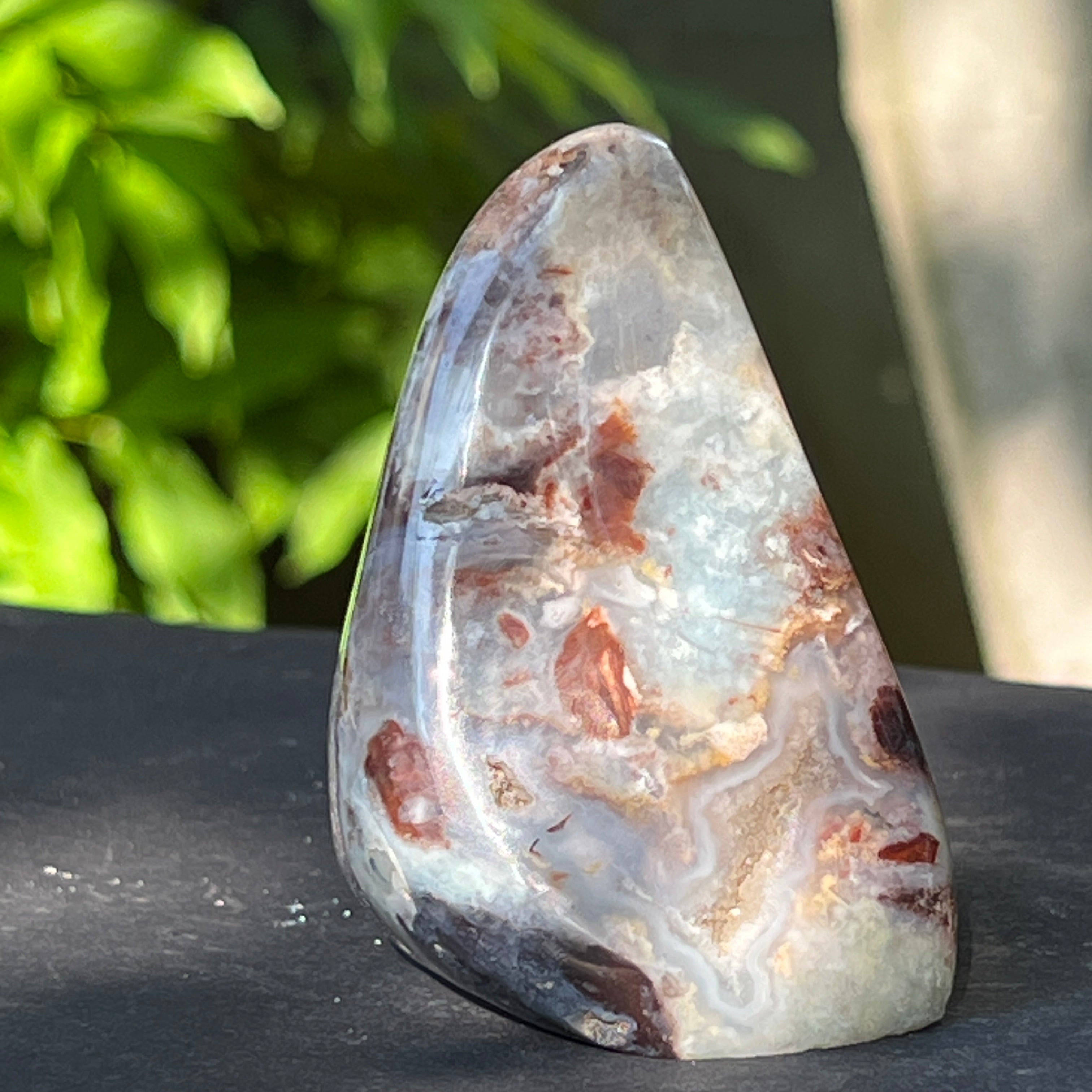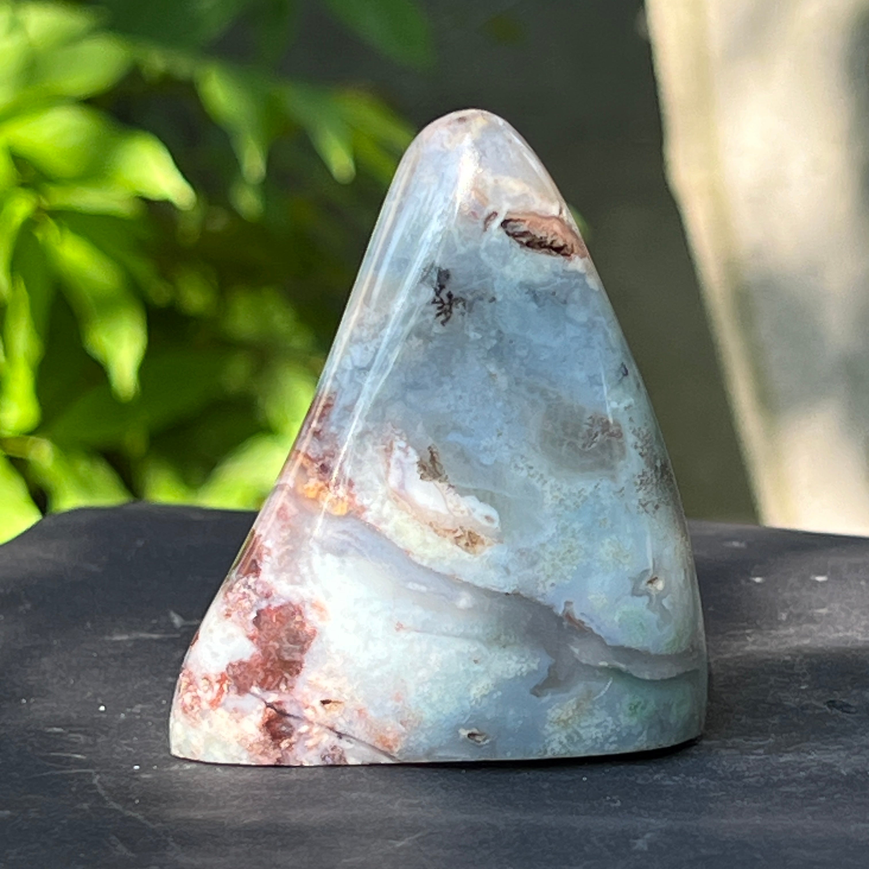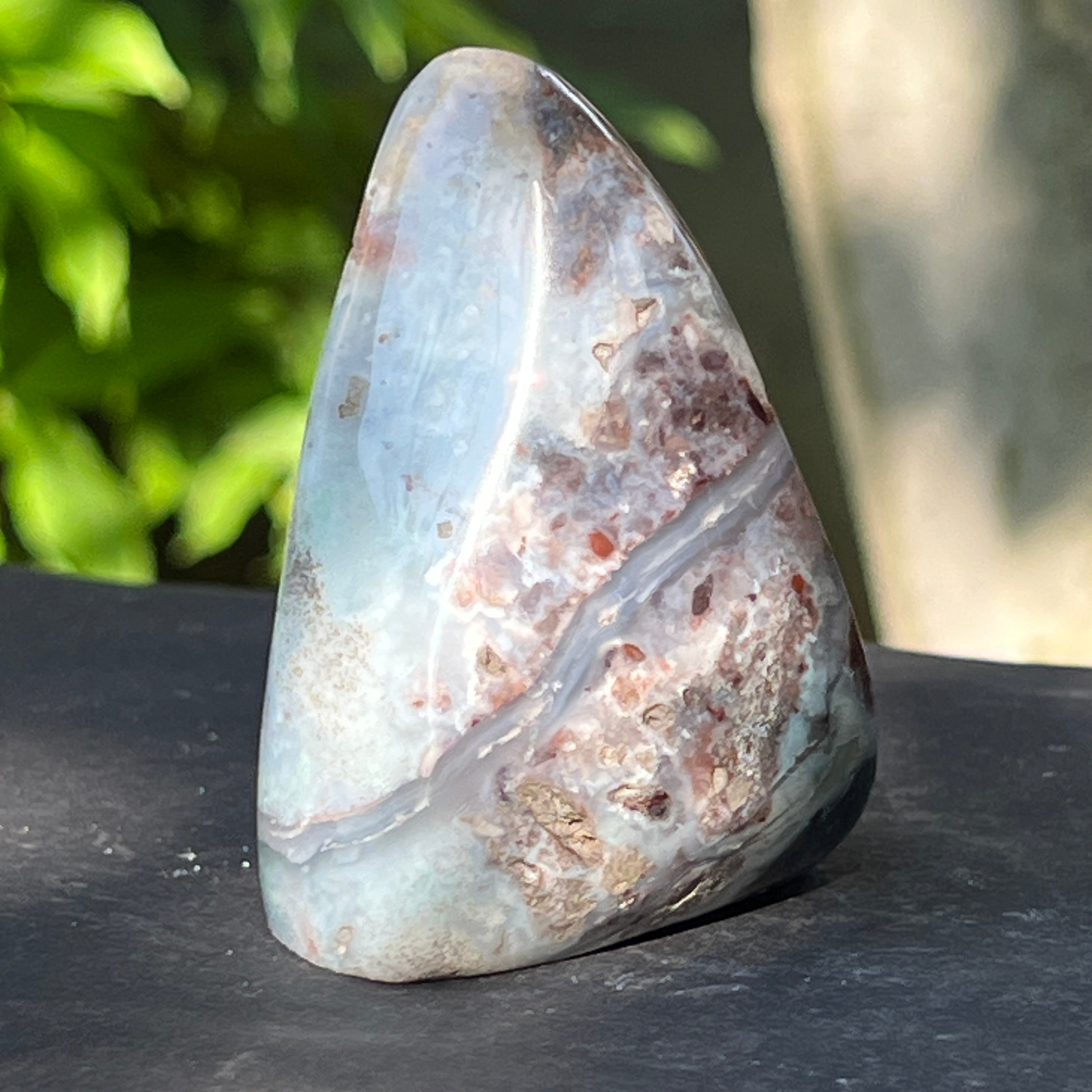 Sa texture est vivante avec des veines de calcedon laiteuses, des tiges discrètes et des taches de rouille matricielles - tous des témoignages d'une formation lente, dans un environnement géologique complexe et plein de tensions.
