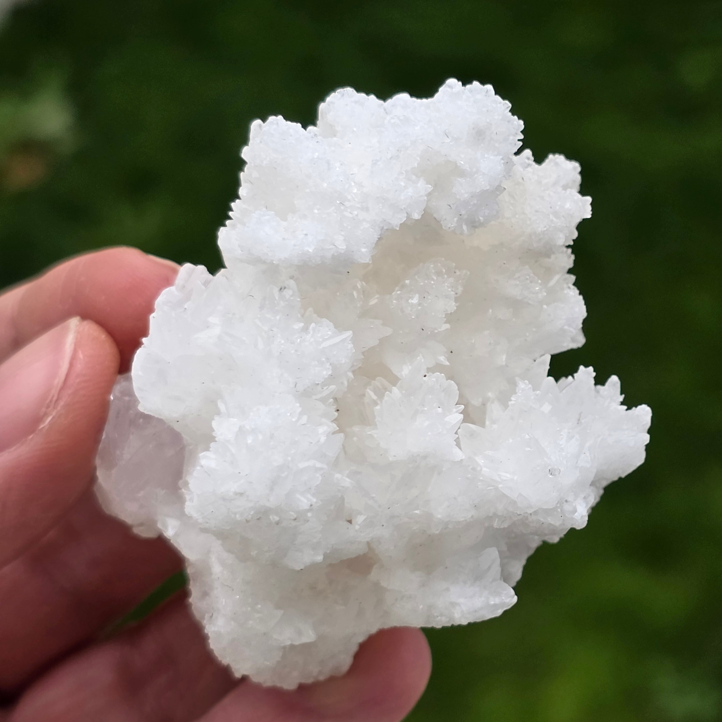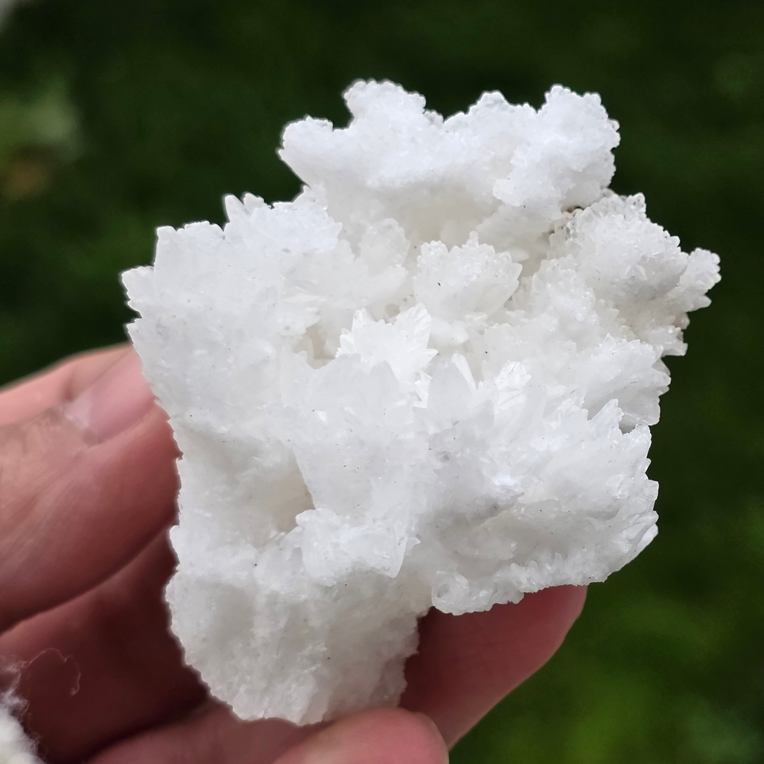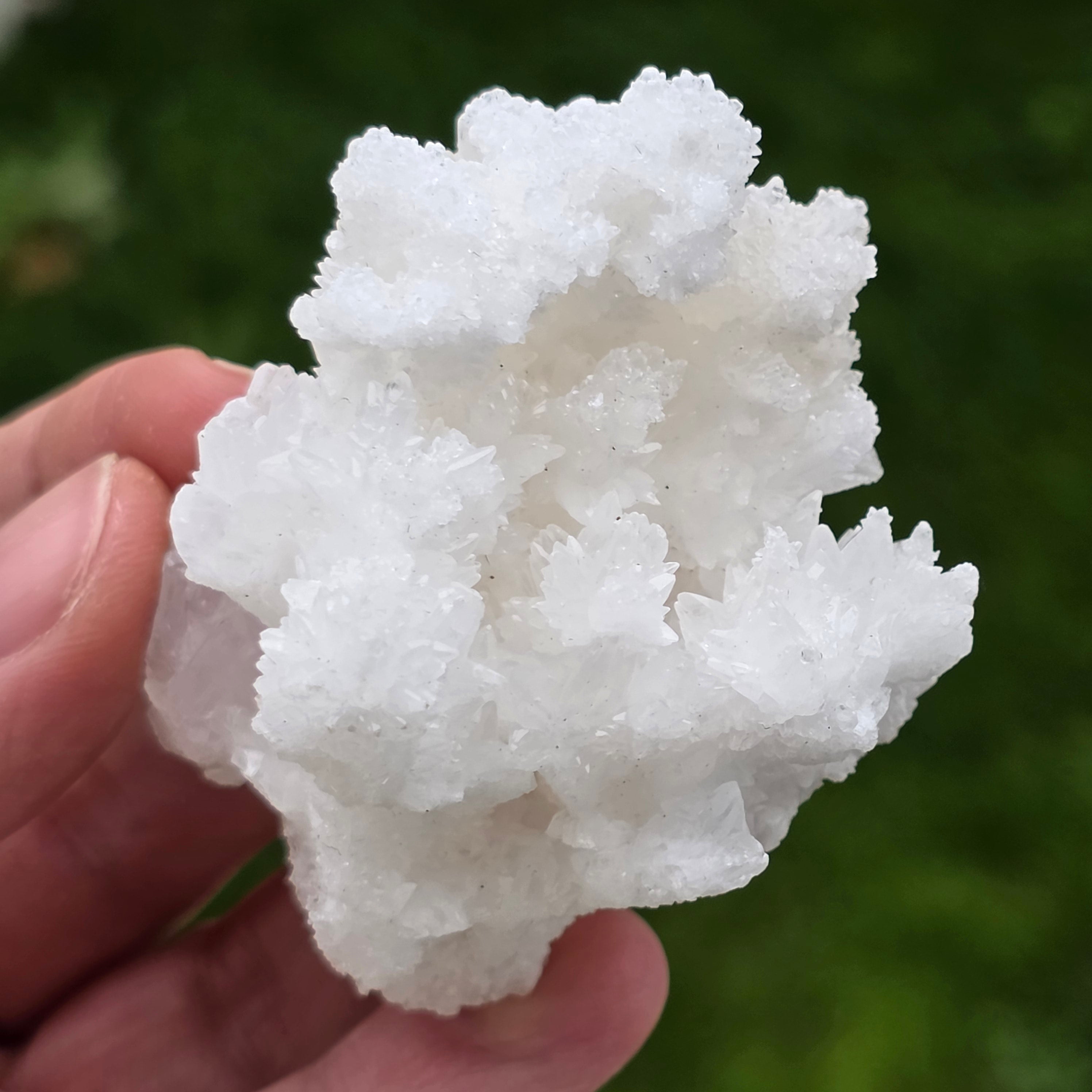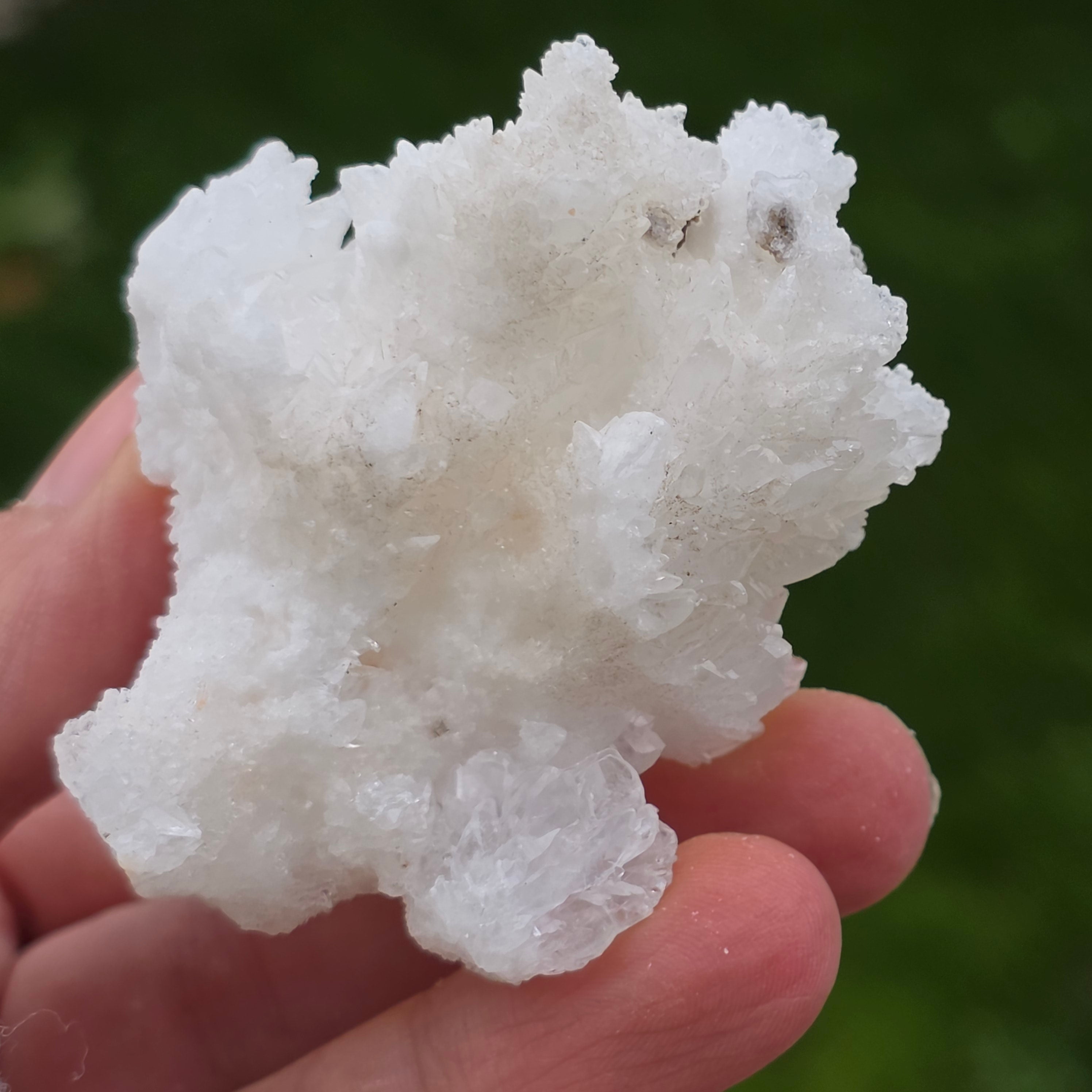 Cristalele sunt dispuse în structuri neregulate, rotunjite, cu suprafețe ușor sclipitoare, amintind de formațiuni întâlnite în interiorul peșterilor. Textura bogată și volumul bine definit conferă fiecărui exemplar un caracter autentic și expresiv, foarte apreciat în colecțiile de minerale și ca piesă decorativă naturală.