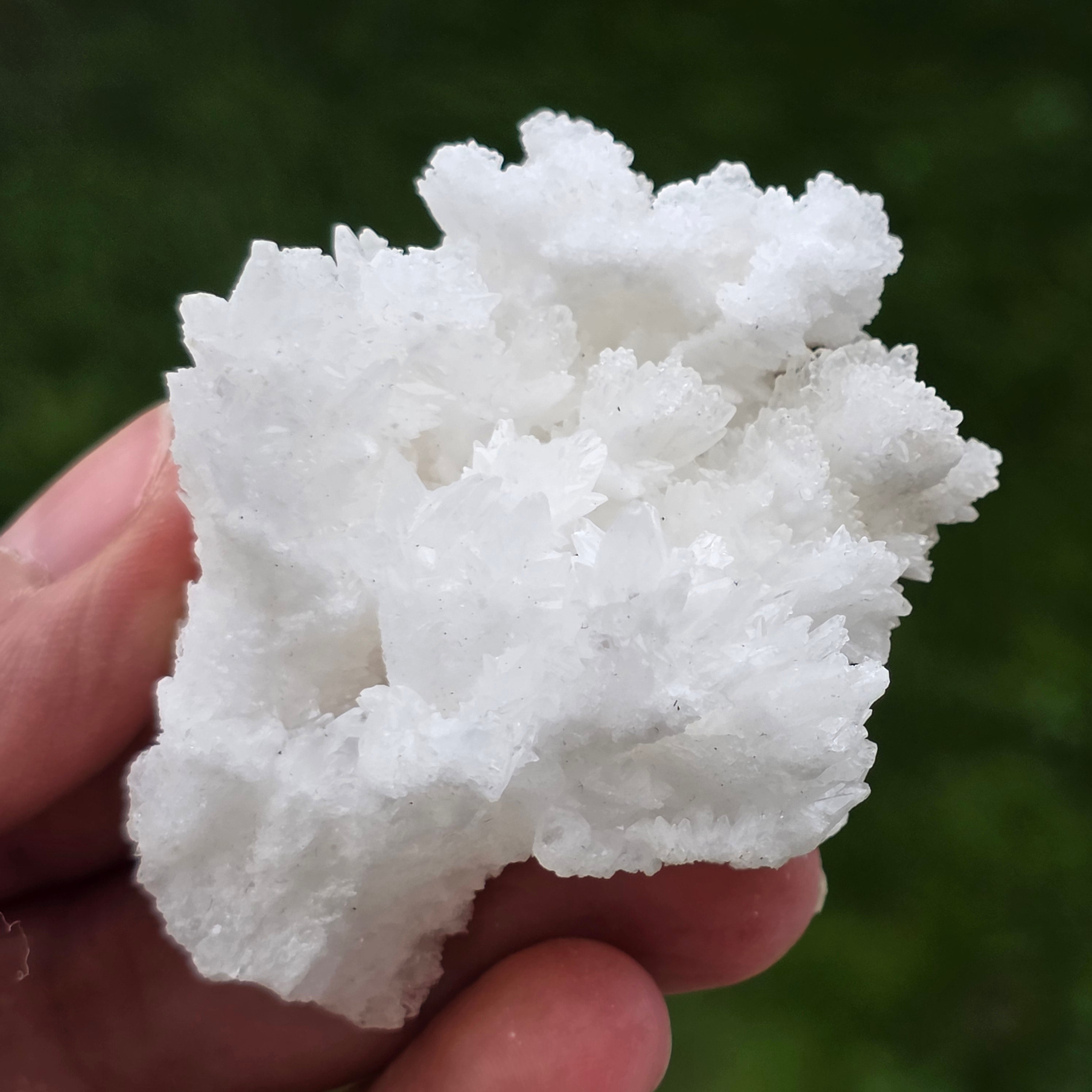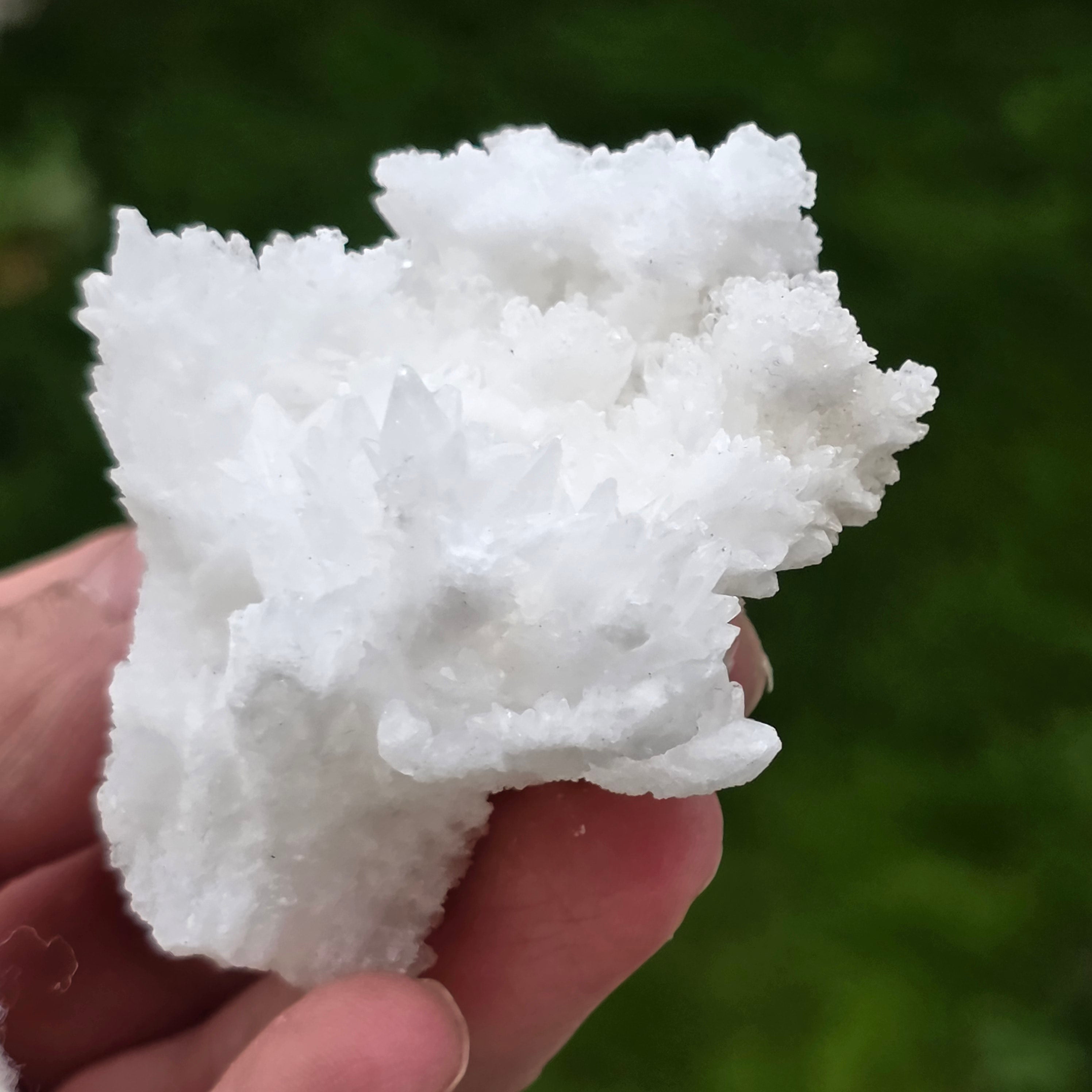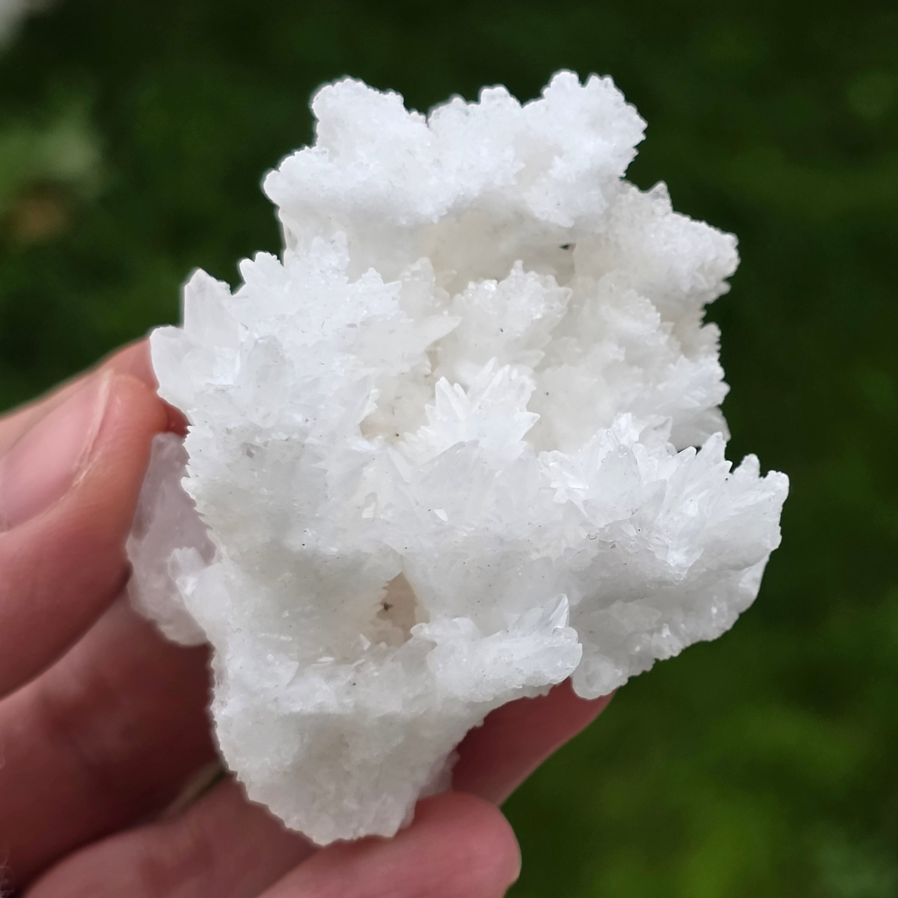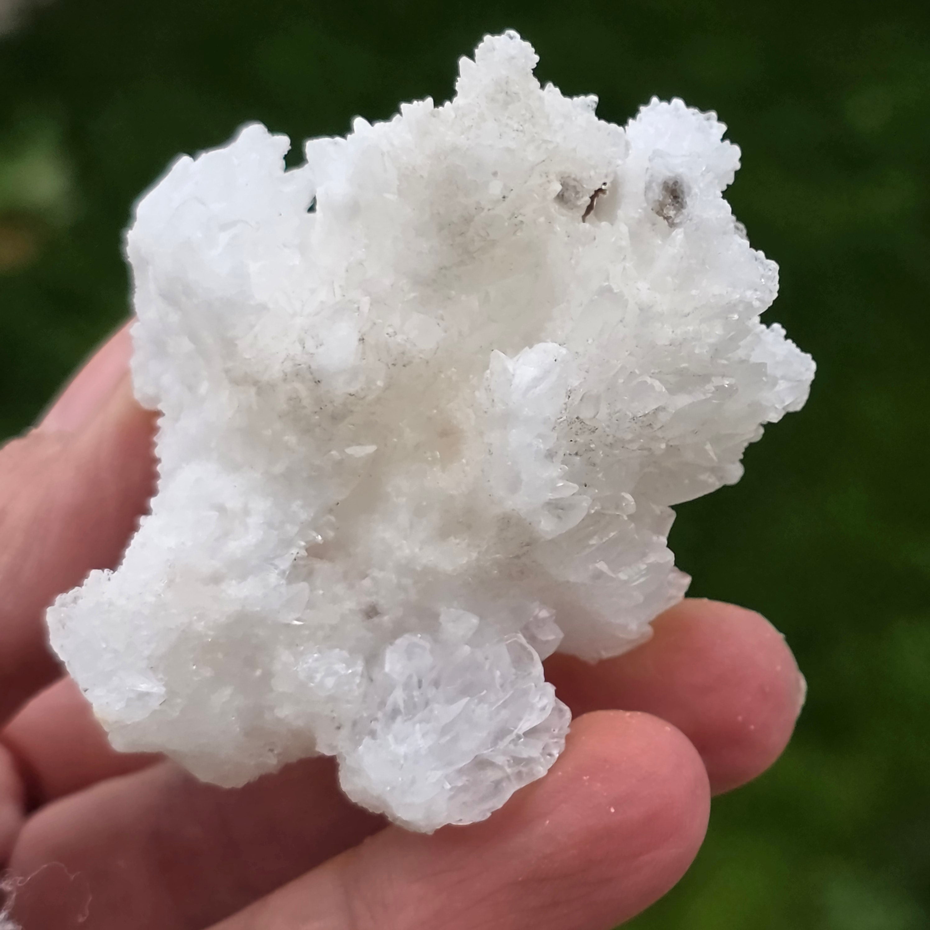 Cristalele sunt dispuse în structuri neregulate, rotunjite, cu suprafețe ușor sclipitoare, amintind de formațiuni întâlnite în interiorul peșterilor. Textura bogată și volumul bine definit conferă fiecărui exemplar un caracter autentic și expresiv, foarte apreciat în colecțiile de minerale și ca piesă decorativă naturală.