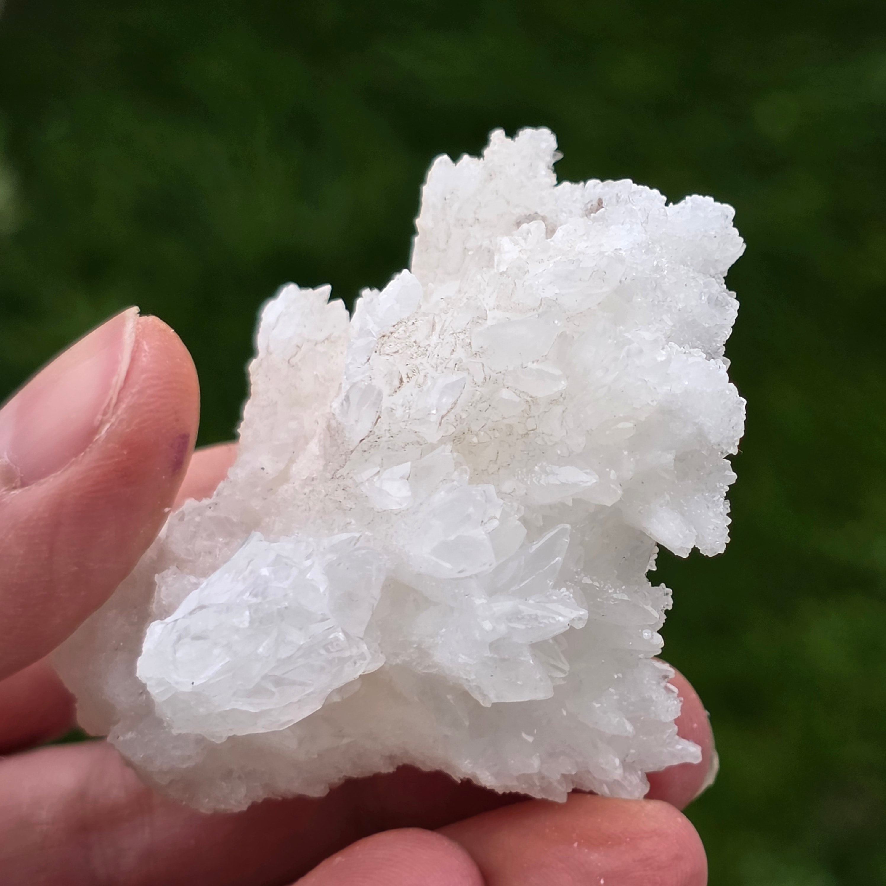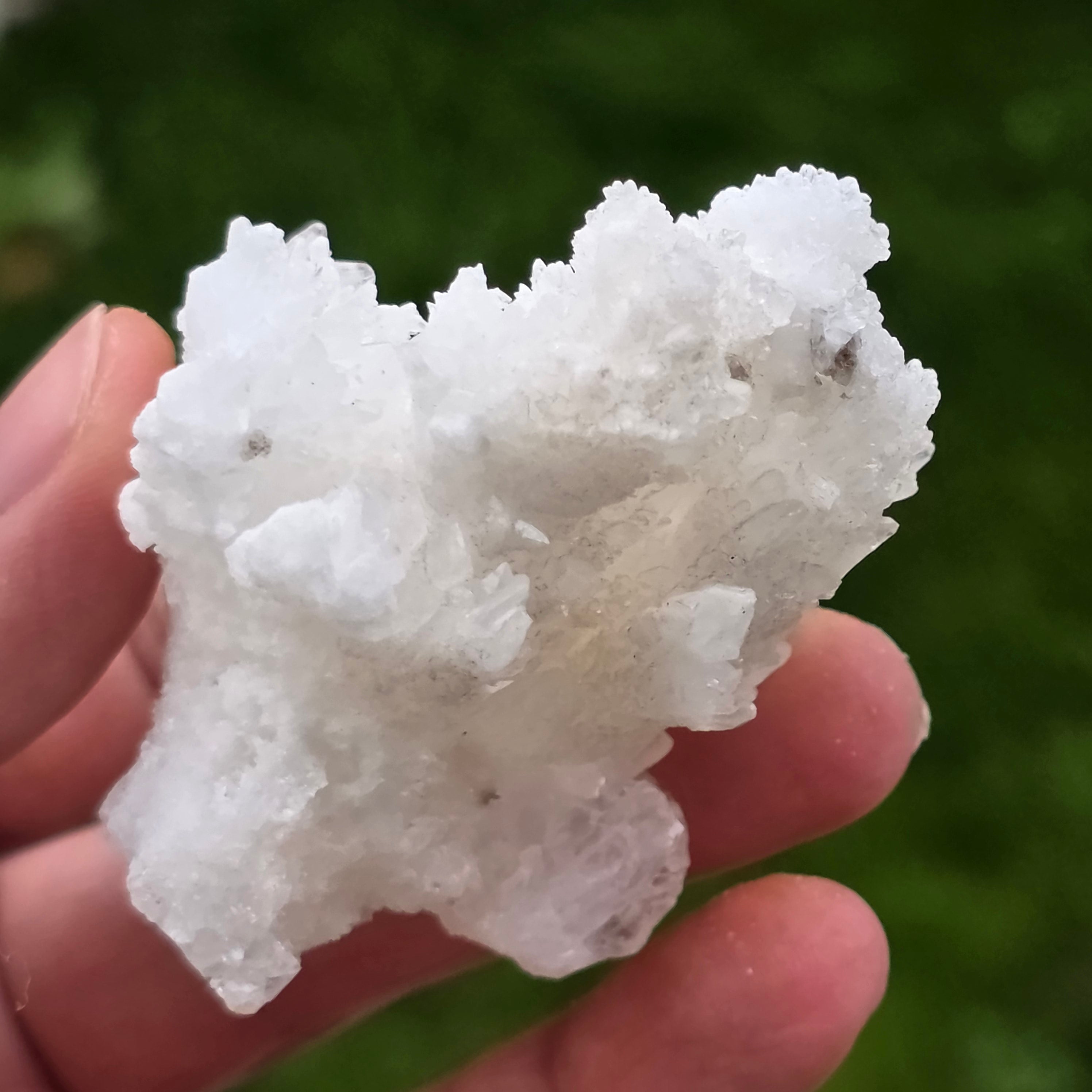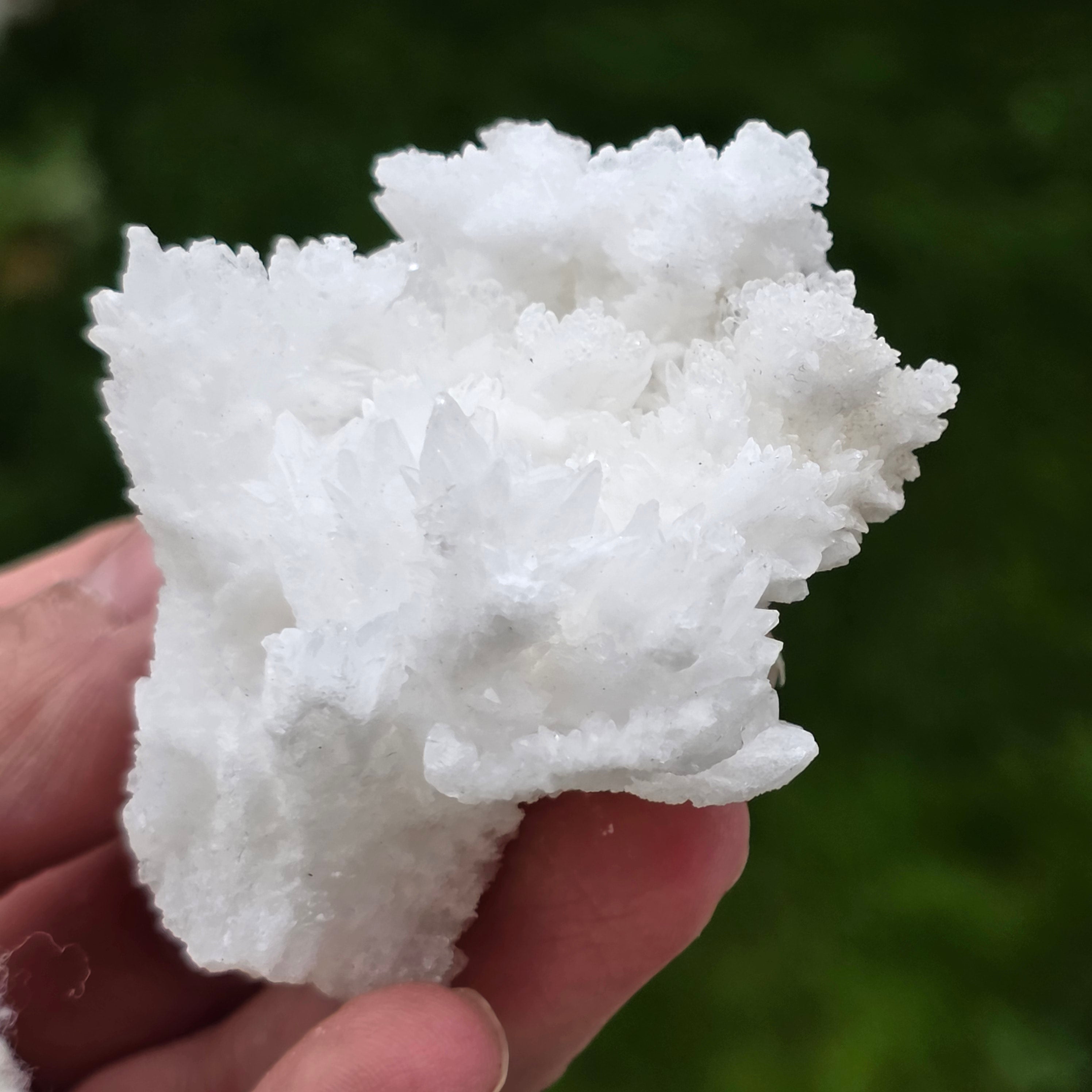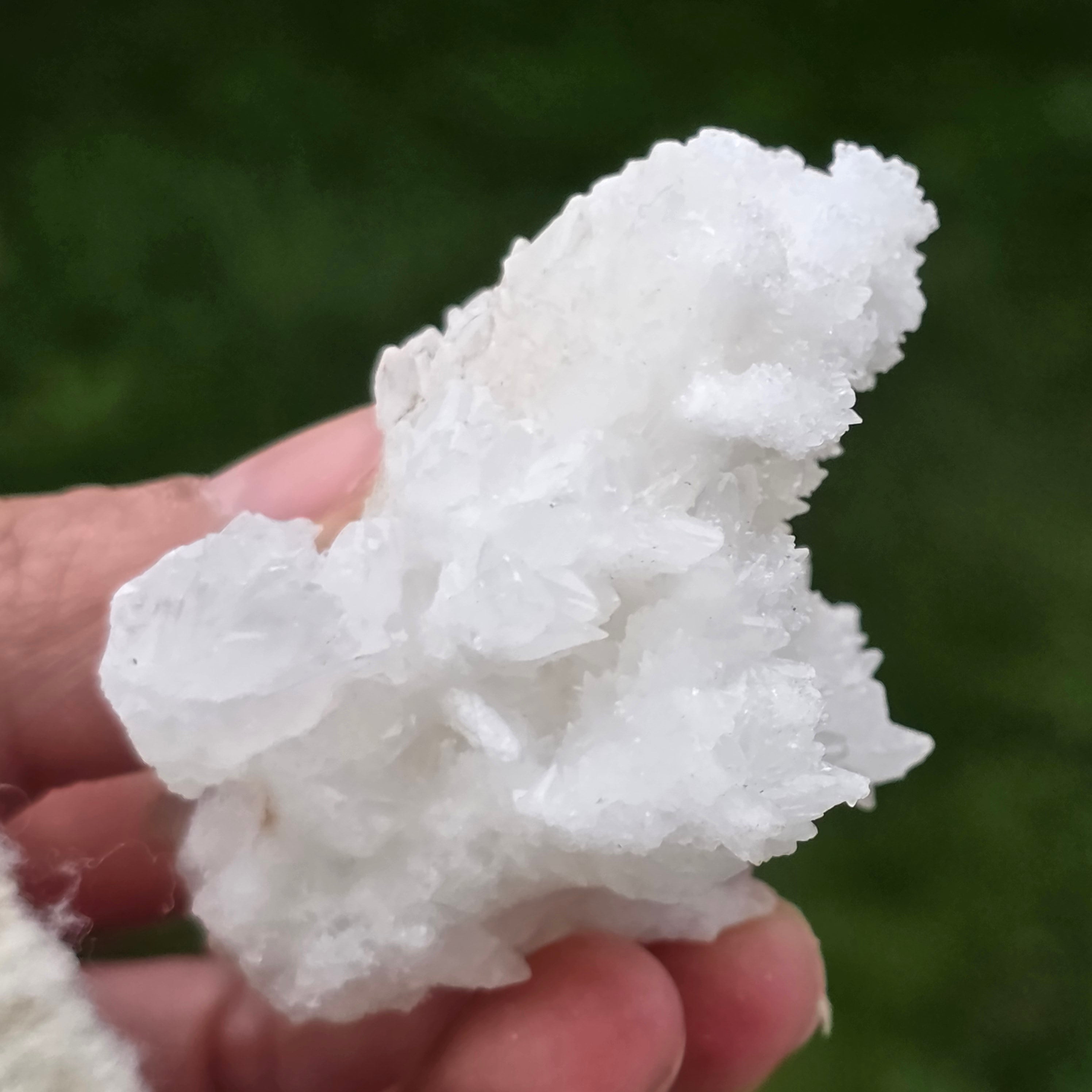 Cristalele sunt dispuse în structuri neregulate, rotunjite, cu suprafețe ușor sclipitoare, amintind de formațiuni întâlnite în interiorul peșterilor. Textura bogată și volumul bine definit conferă fiecărui exemplar un caracter autentic și expresiv, foarte apreciat în colecțiile de minerale și ca piesă decorativă naturală.