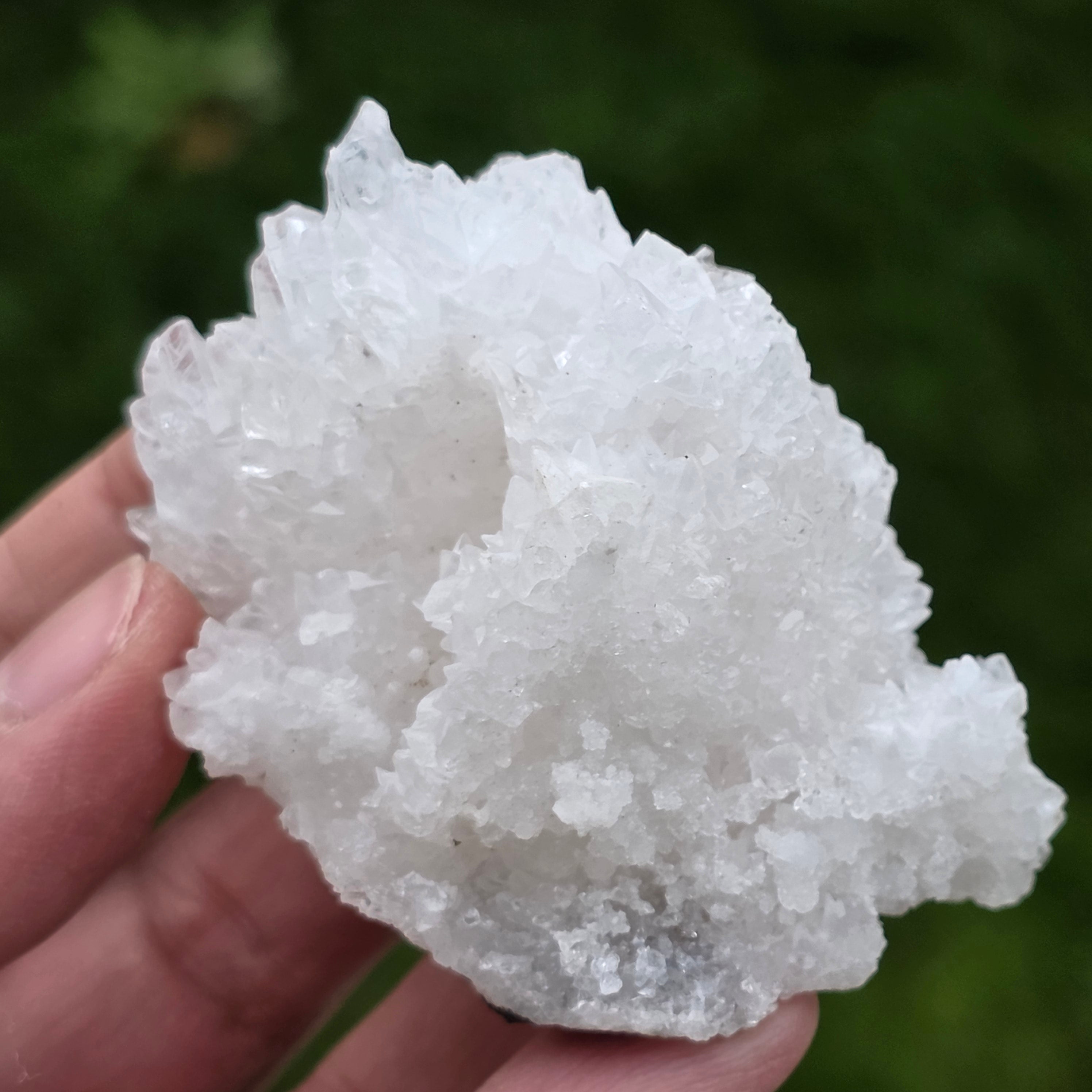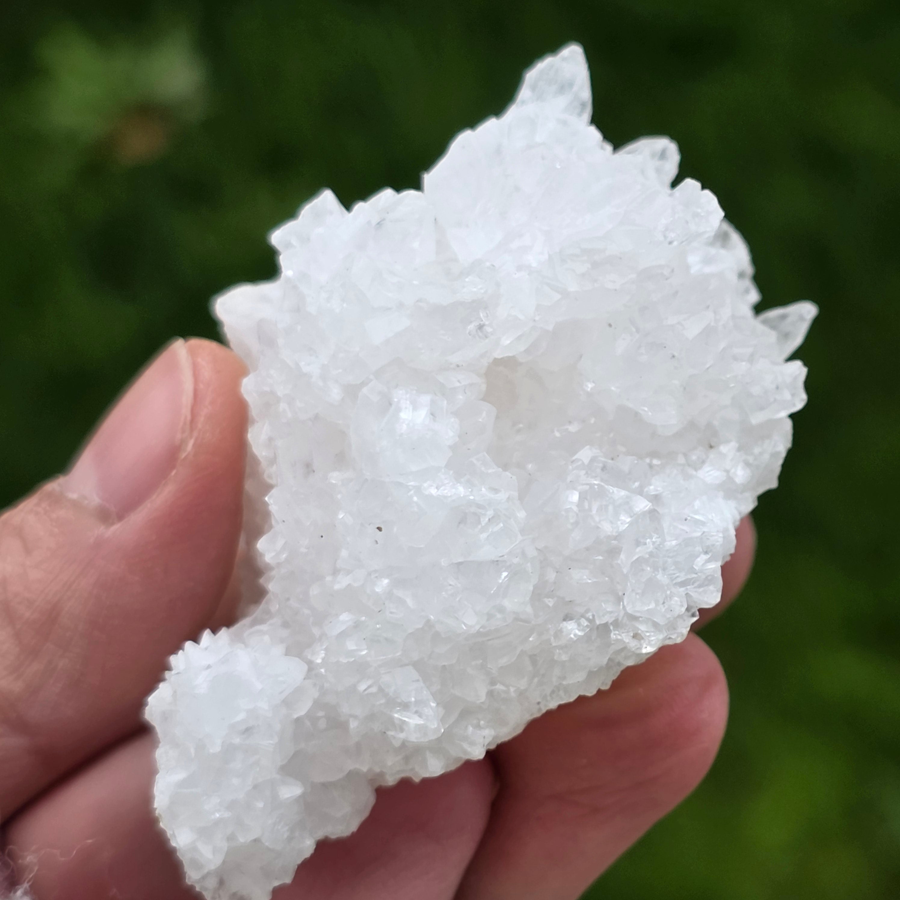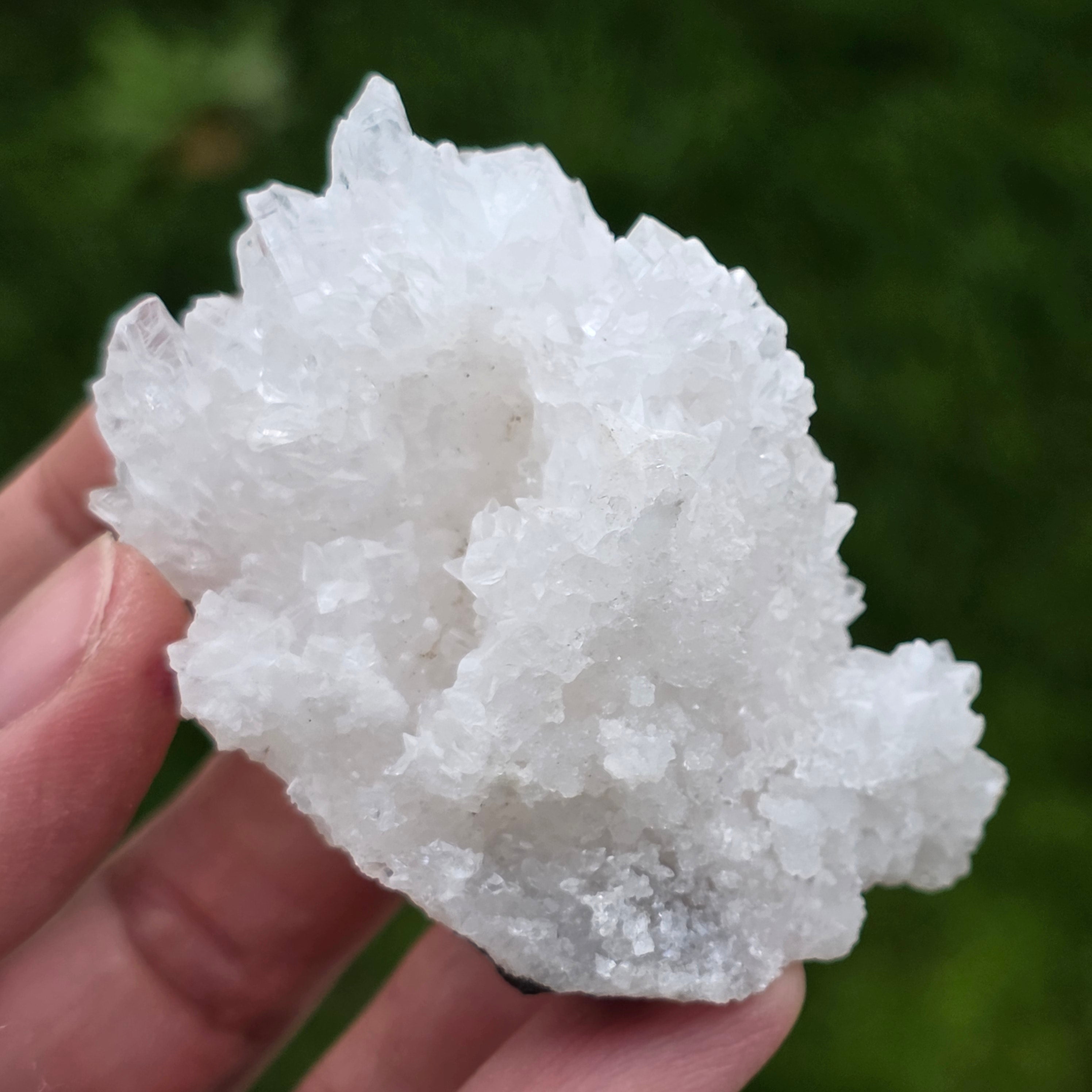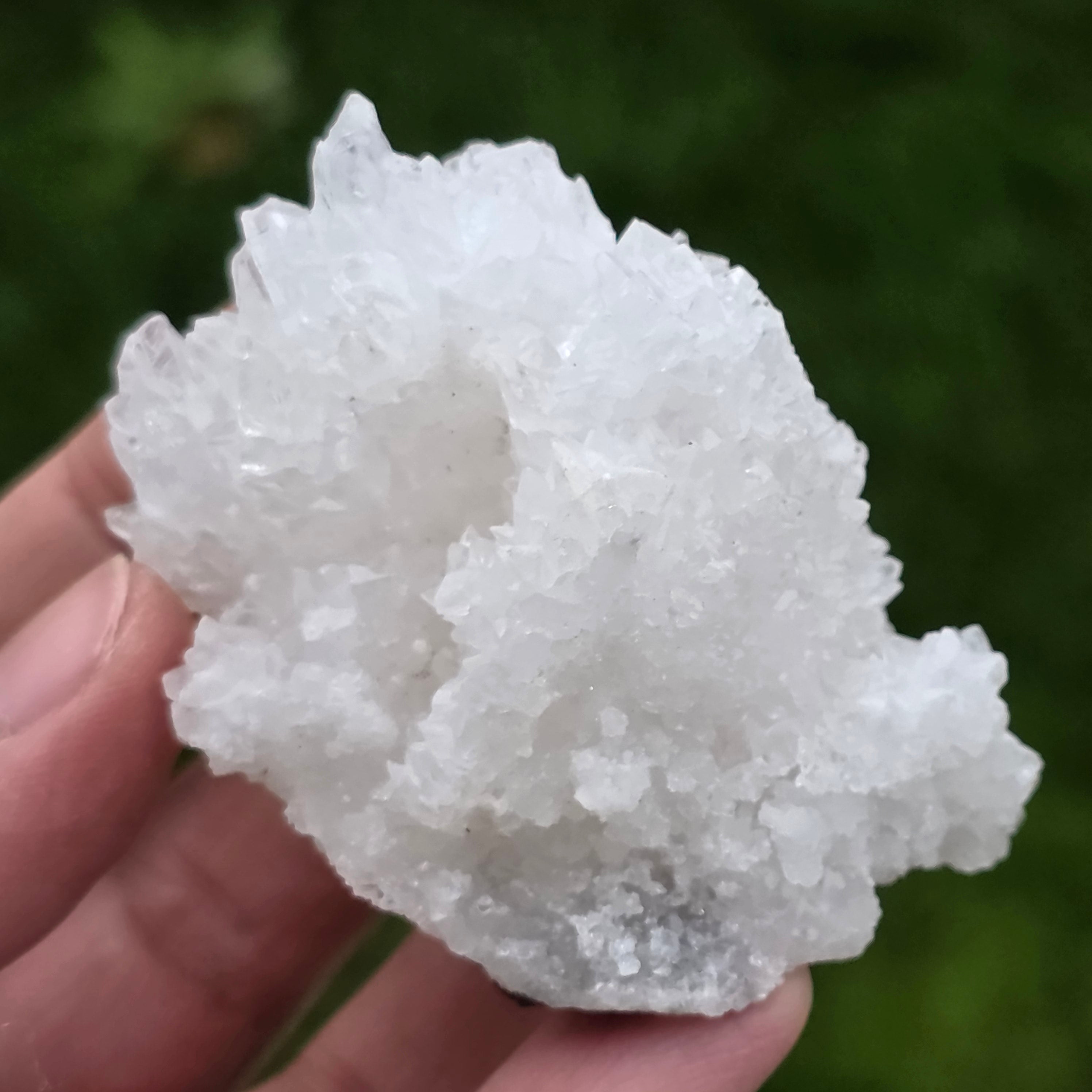 Cristalele sunt dispuse în structuri neregulate, rotunjite, cu suprafețe ușor sclipitoare, amintind de formațiuni întâlnite în interiorul peșterilor. Textura bogată și volumul bine definit conferă fiecărui exemplar un caracter autentic și expresiv, foarte apreciat în colecțiile de minerale și ca piesă decorativă naturală.