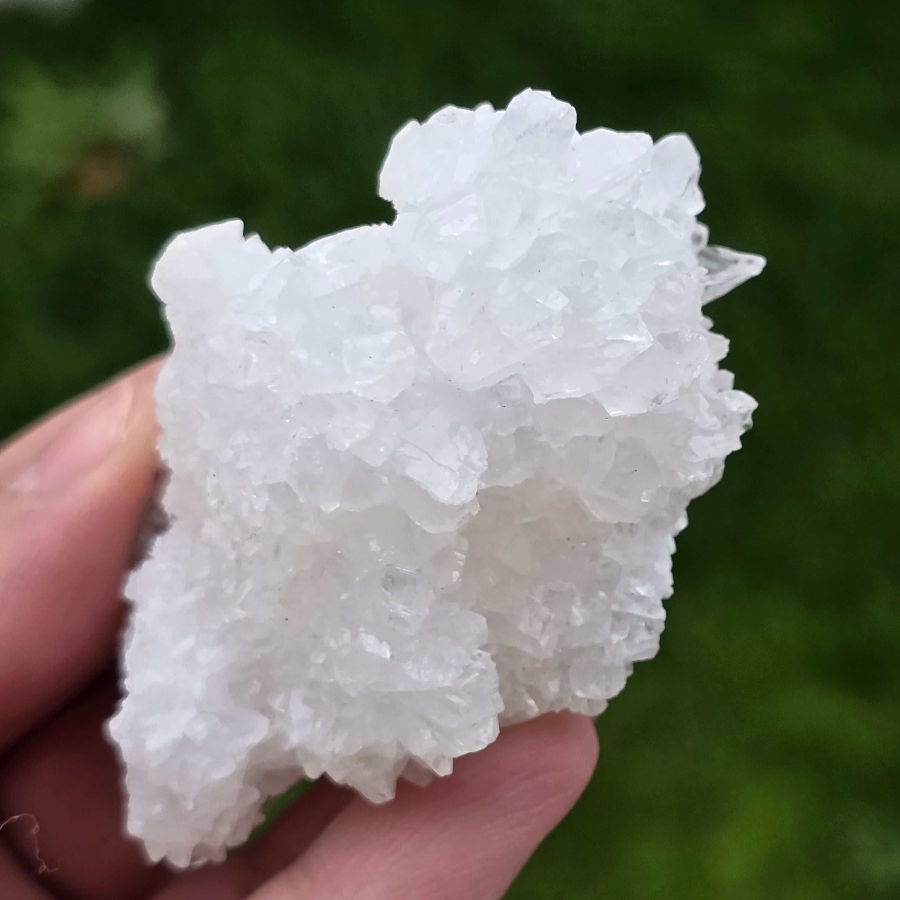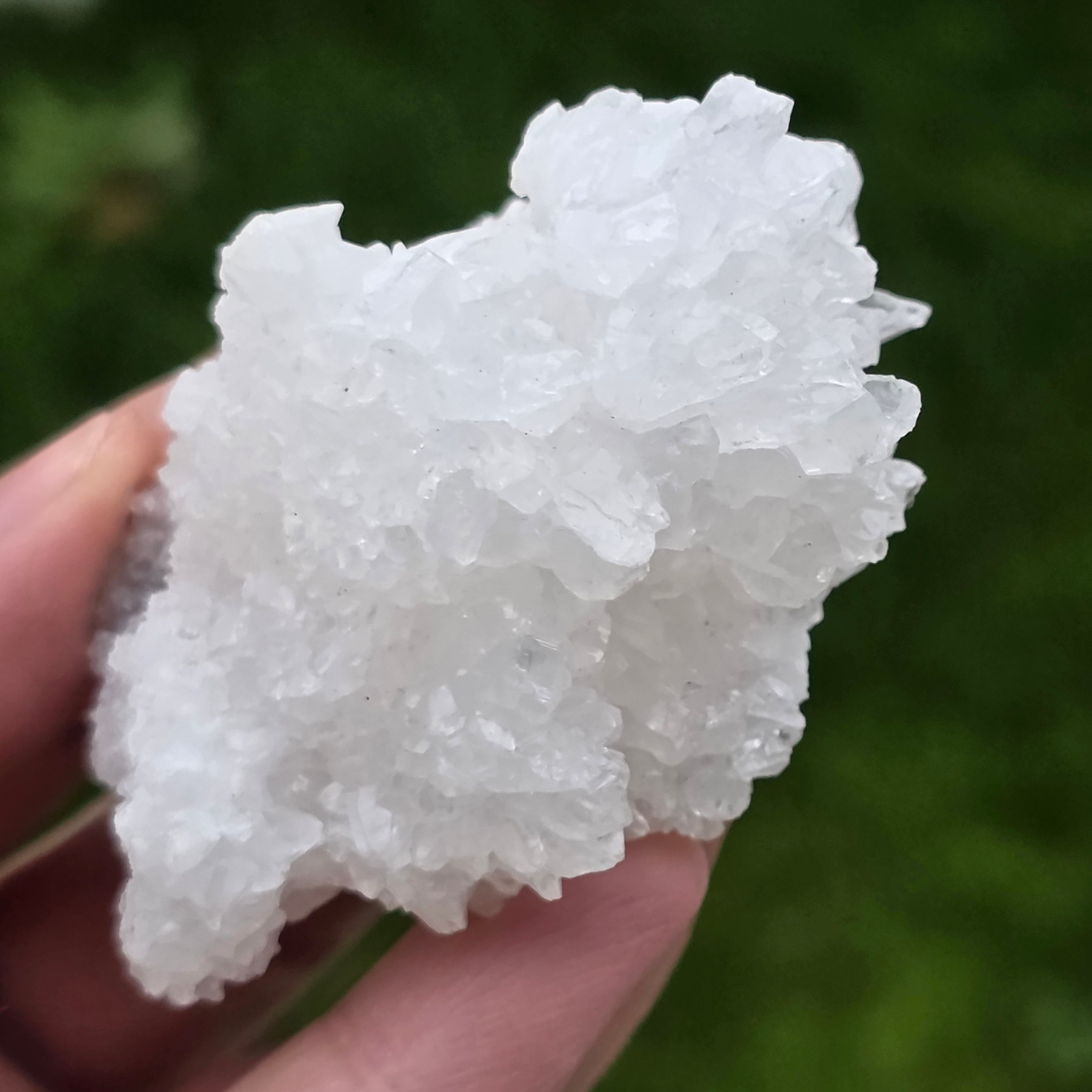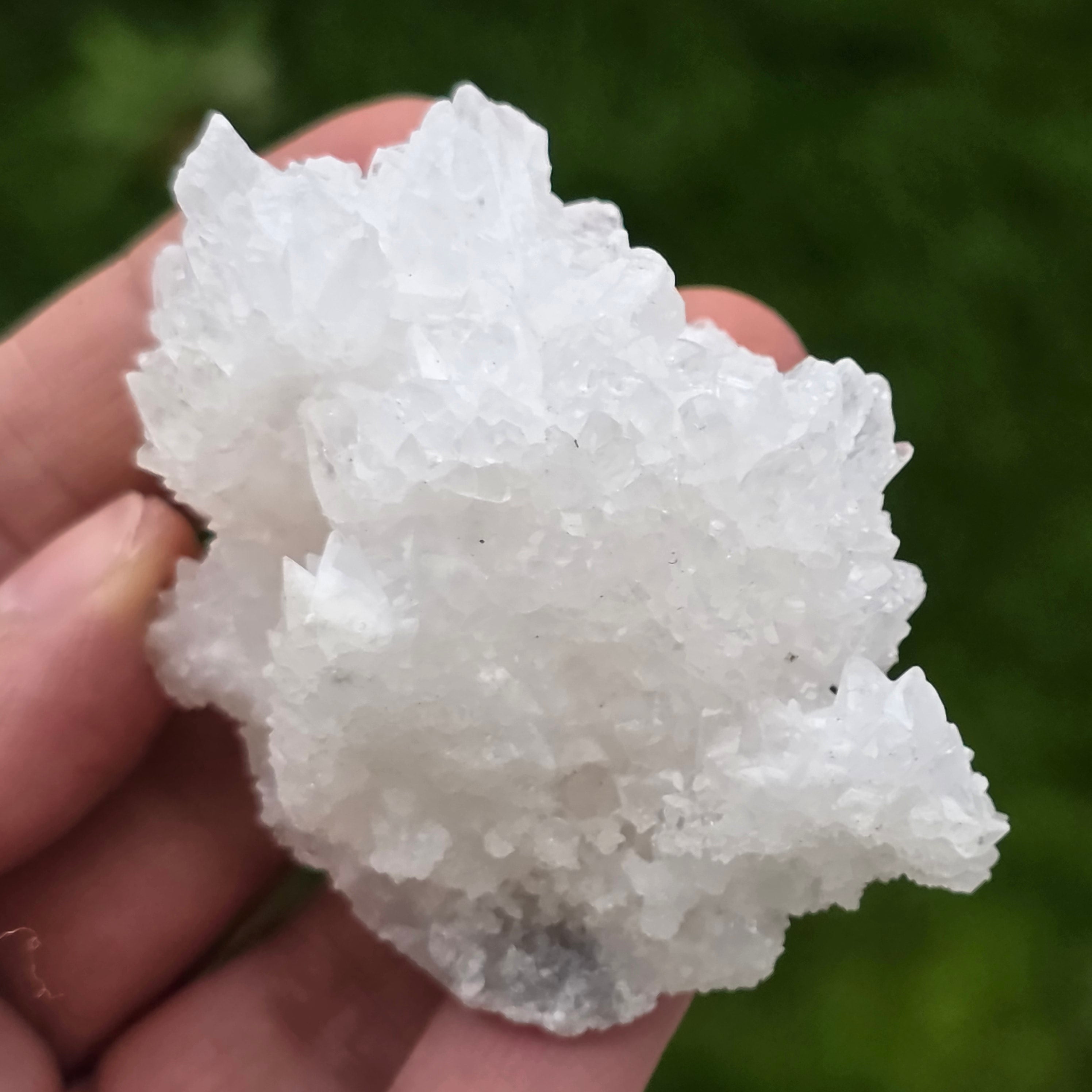 Cristalele sunt dispuse în structuri neregulate, rotunjite, cu suprafețe ușor sclipitoare, amintind de formațiuni întâlnite în interiorul peșterilor. Textura bogată și volumul bine definit conferă fiecărui exemplar un caracter autentic și expresiv, foarte apreciat în colecțiile de minerale și ca piesă decorativă naturală.