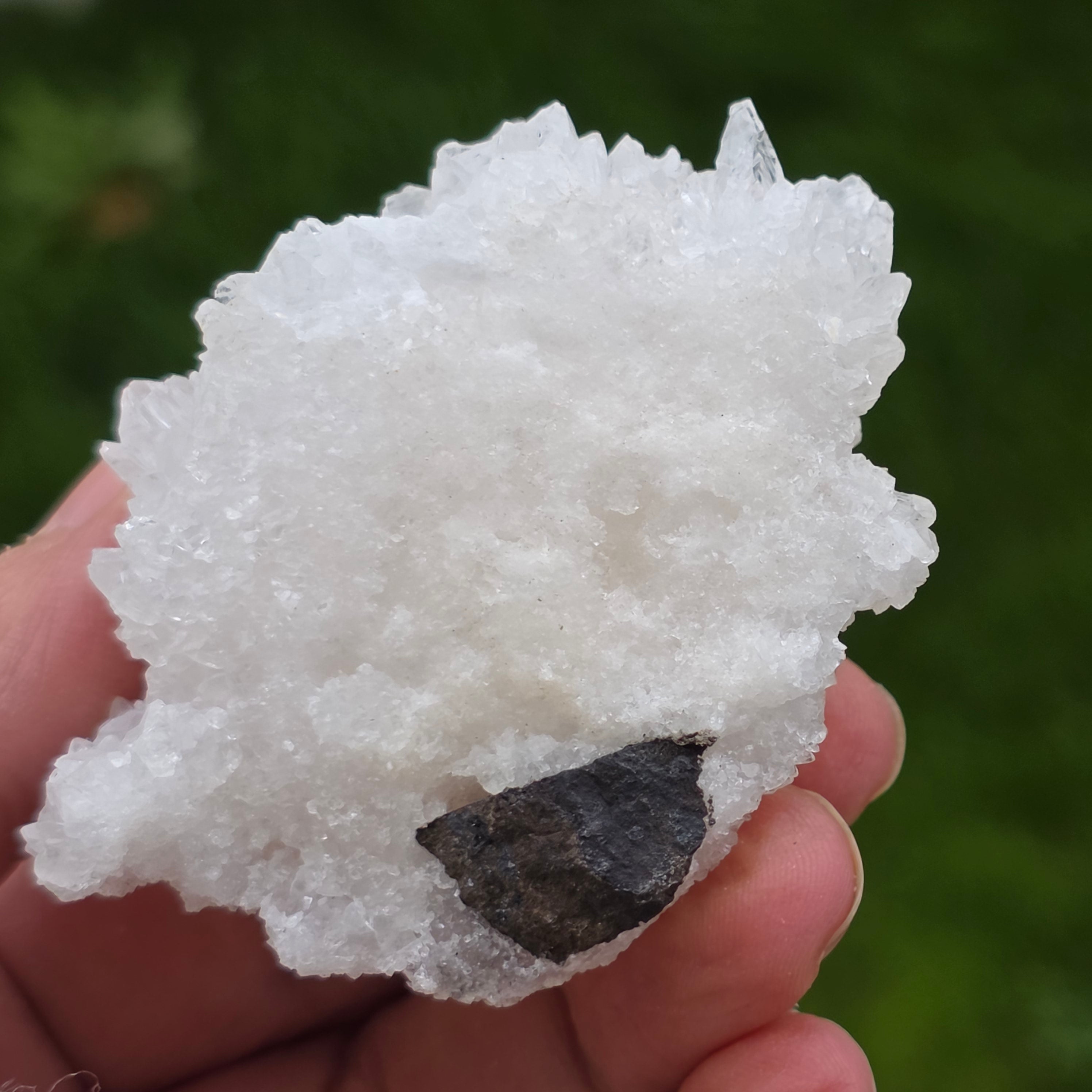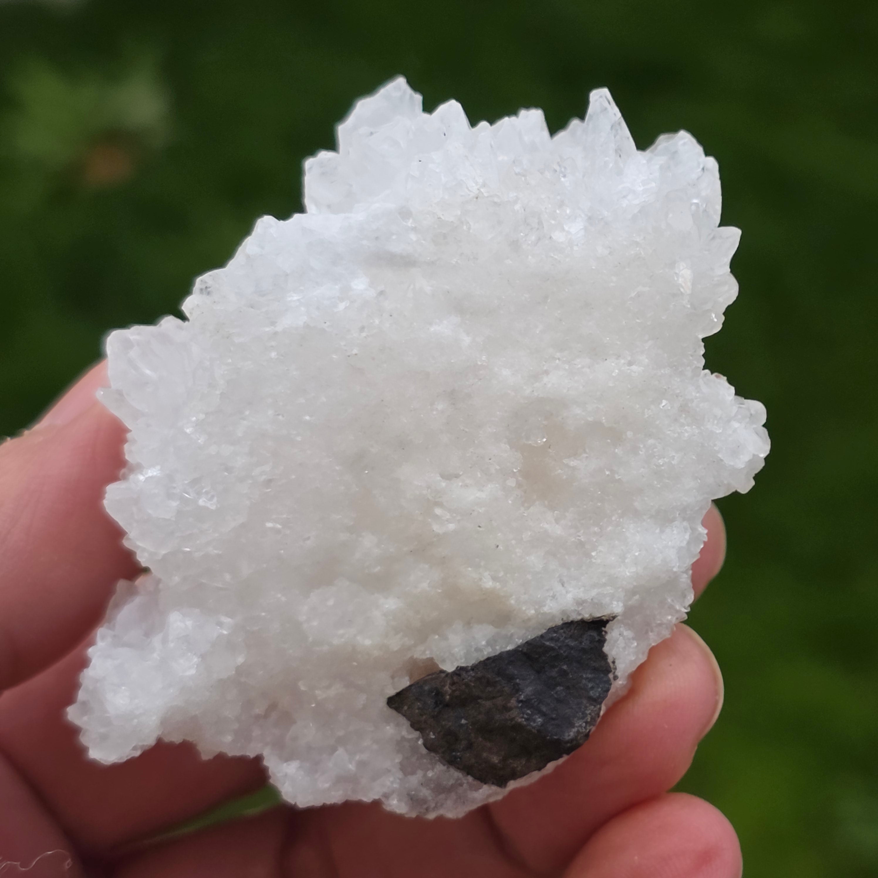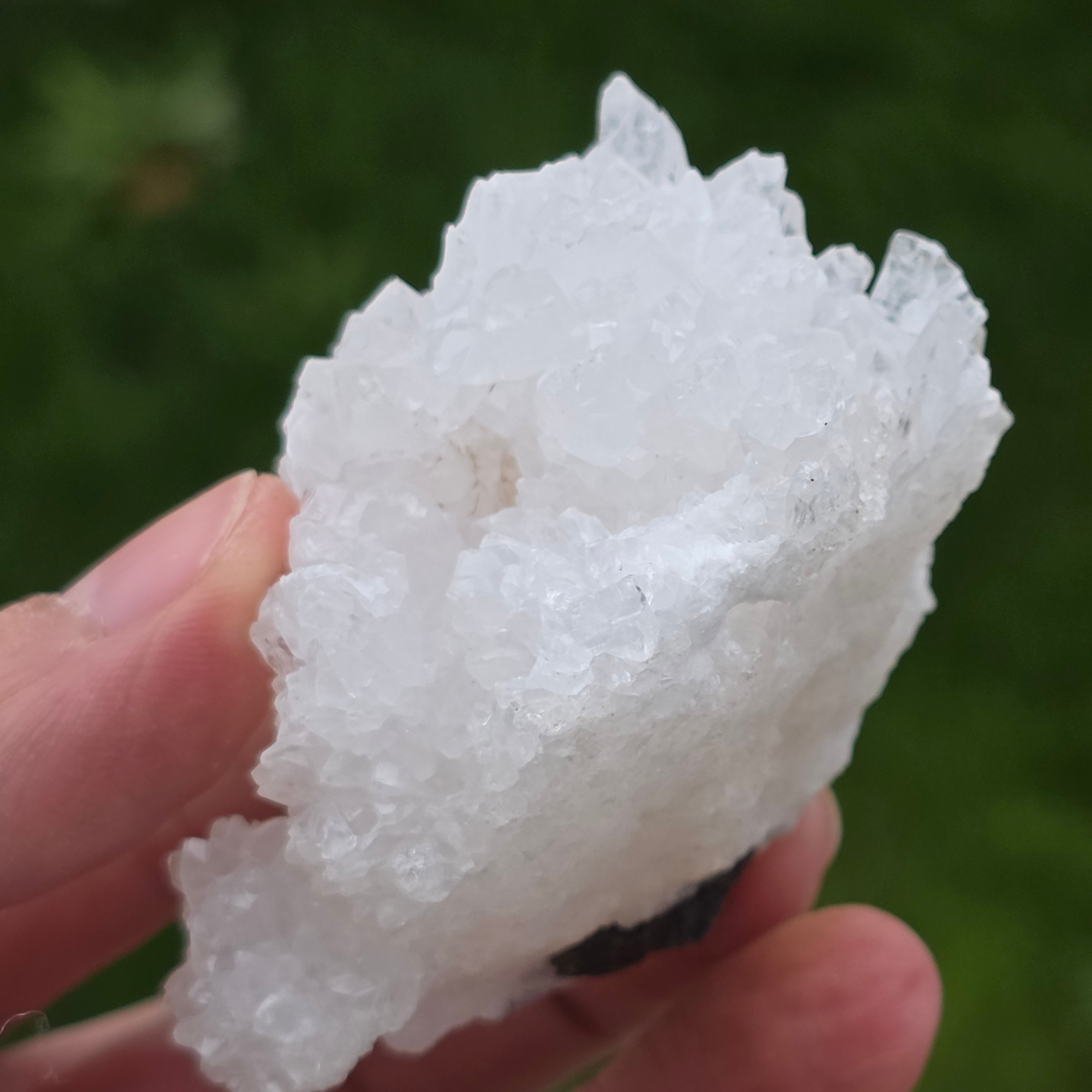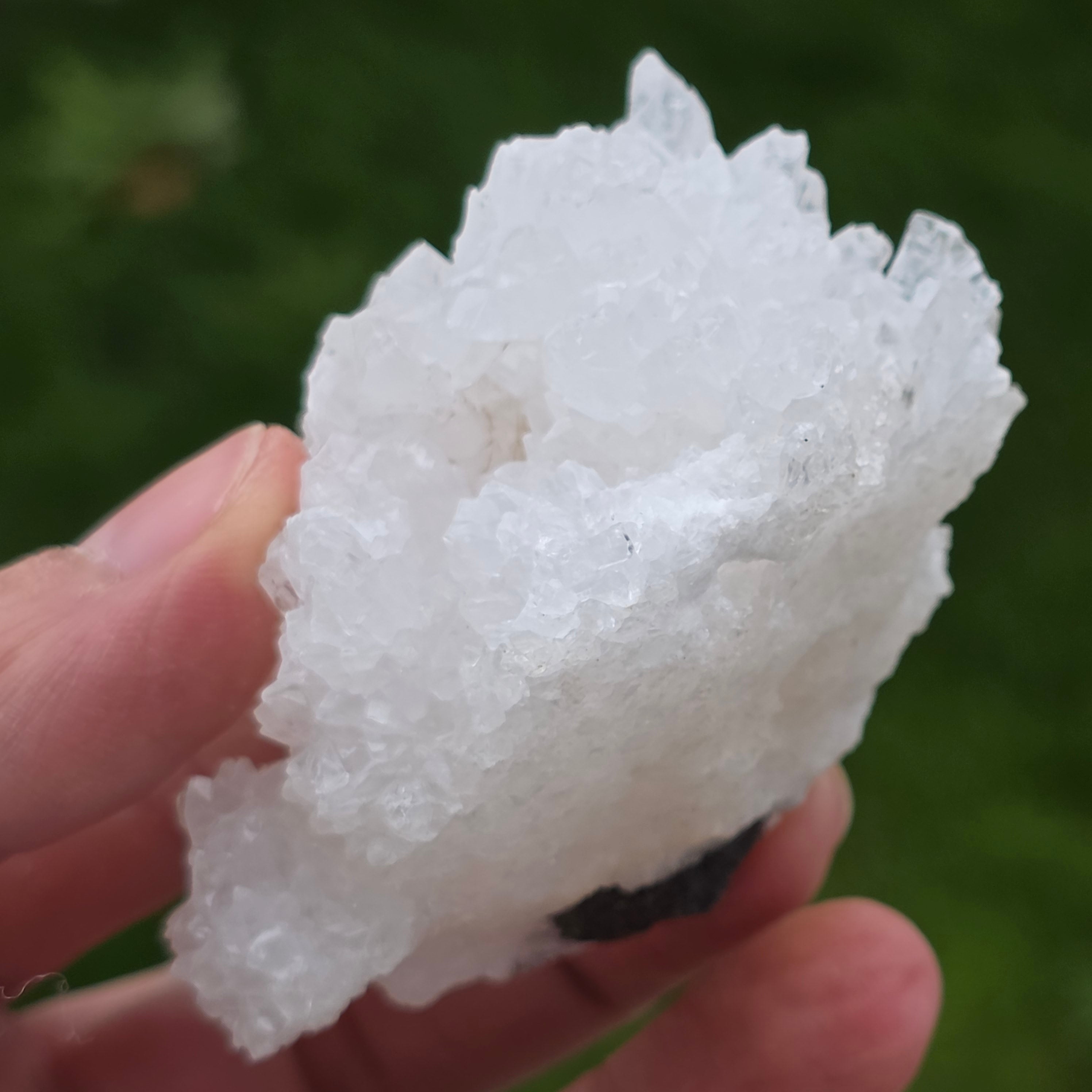 Cristalele sunt dispuse în structuri neregulate, rotunjite, cu suprafețe ușor sclipitoare, amintind de formațiuni întâlnite în interiorul peșterilor. Textura bogată și volumul bine definit conferă fiecărui exemplar un caracter autentic și expresiv, foarte apreciat în colecțiile de minerale și ca piesă decorativă naturală.