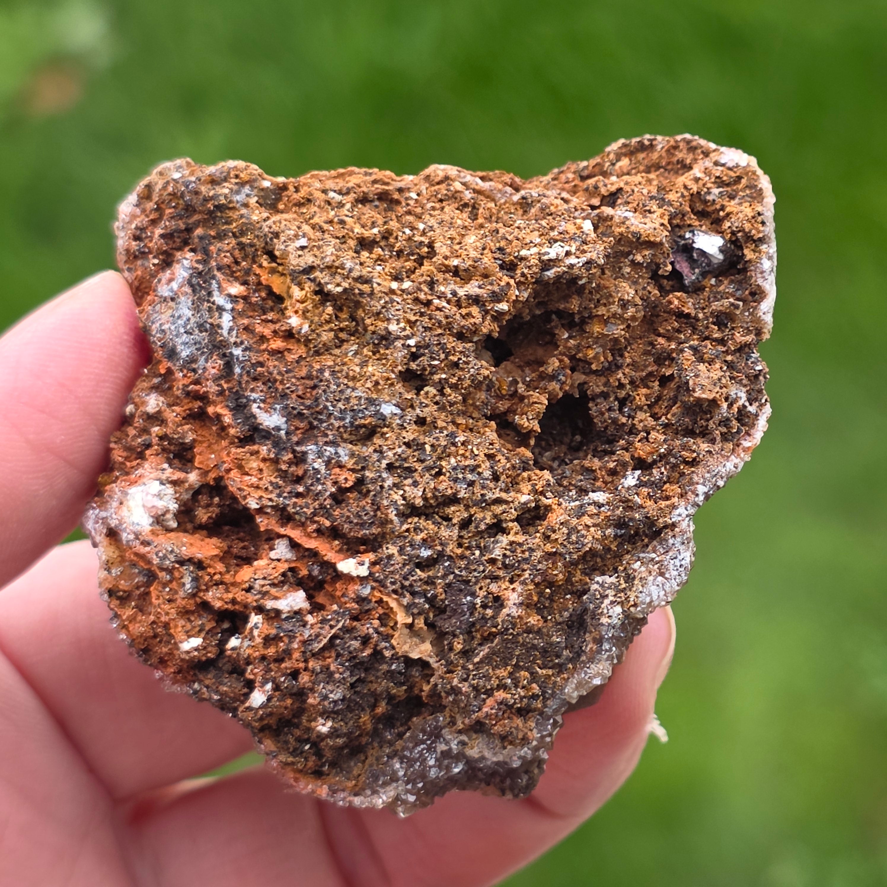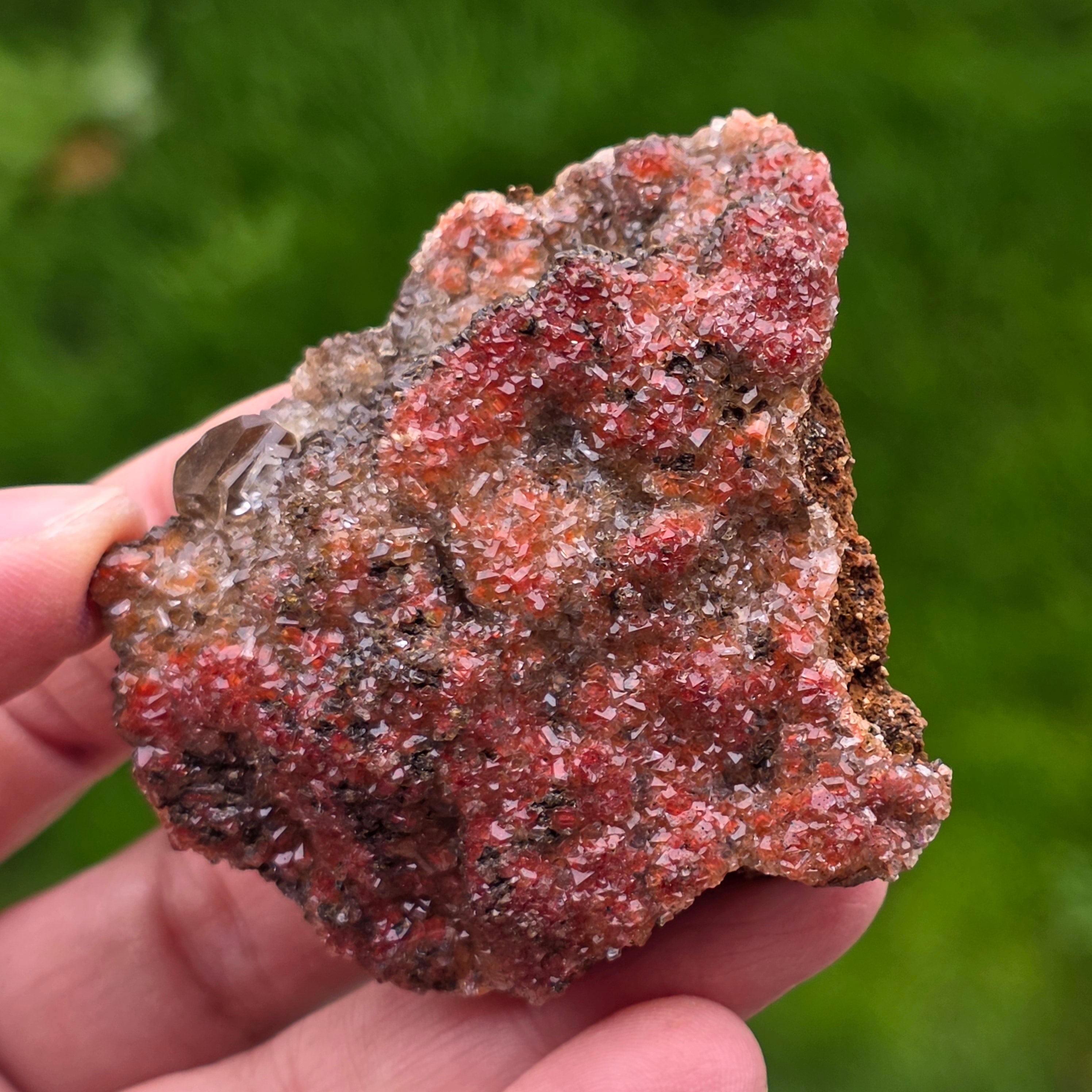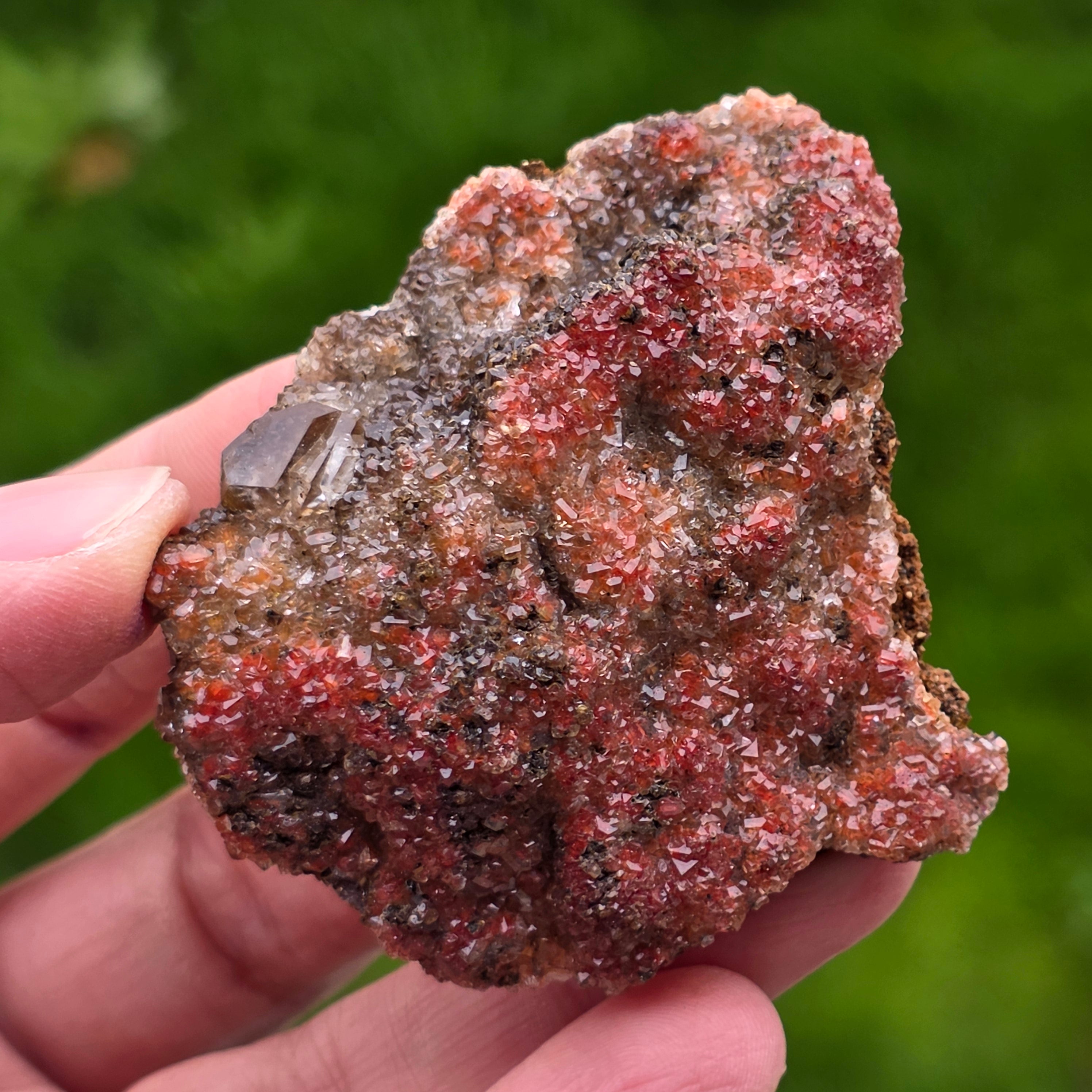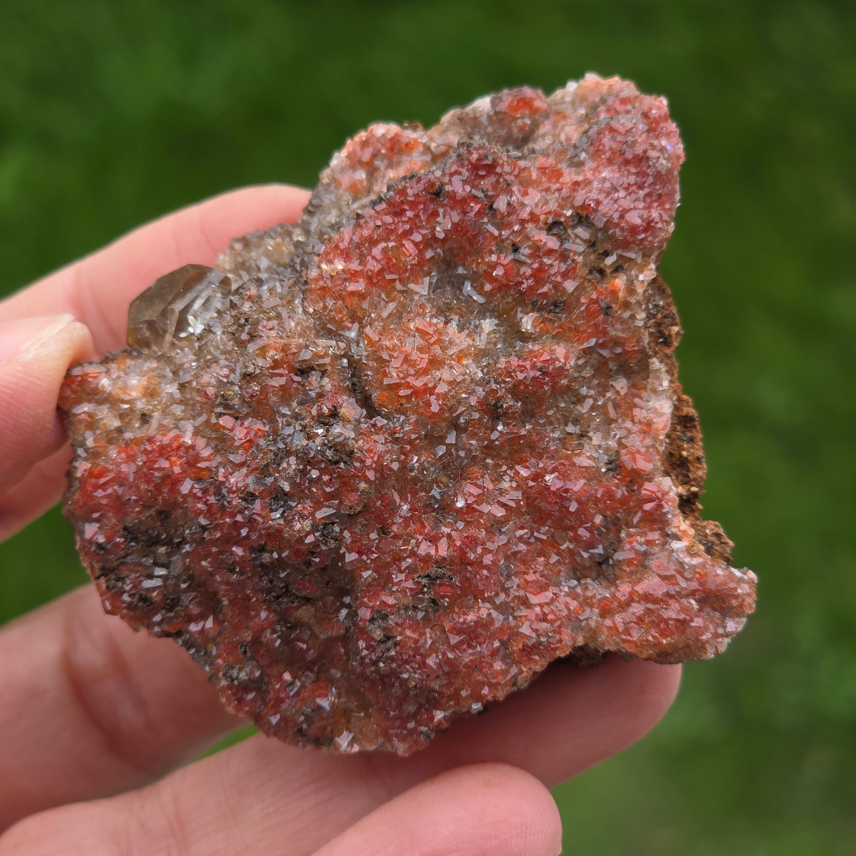 Cristalele de calcit prezintă habitul specific numit „diamond calcite”, caracterizat prin terminații bine definite și fețe strălucitoare, care reflectă lumina într-un mod subtil, dar expresiv. Dispunerea compactă a cristalelor creează o suprafață sclipitoare, cu textură bogată, fiecare piesă fiind diferită ca formă, intensitate a culorii și distribuție a cristalelor.