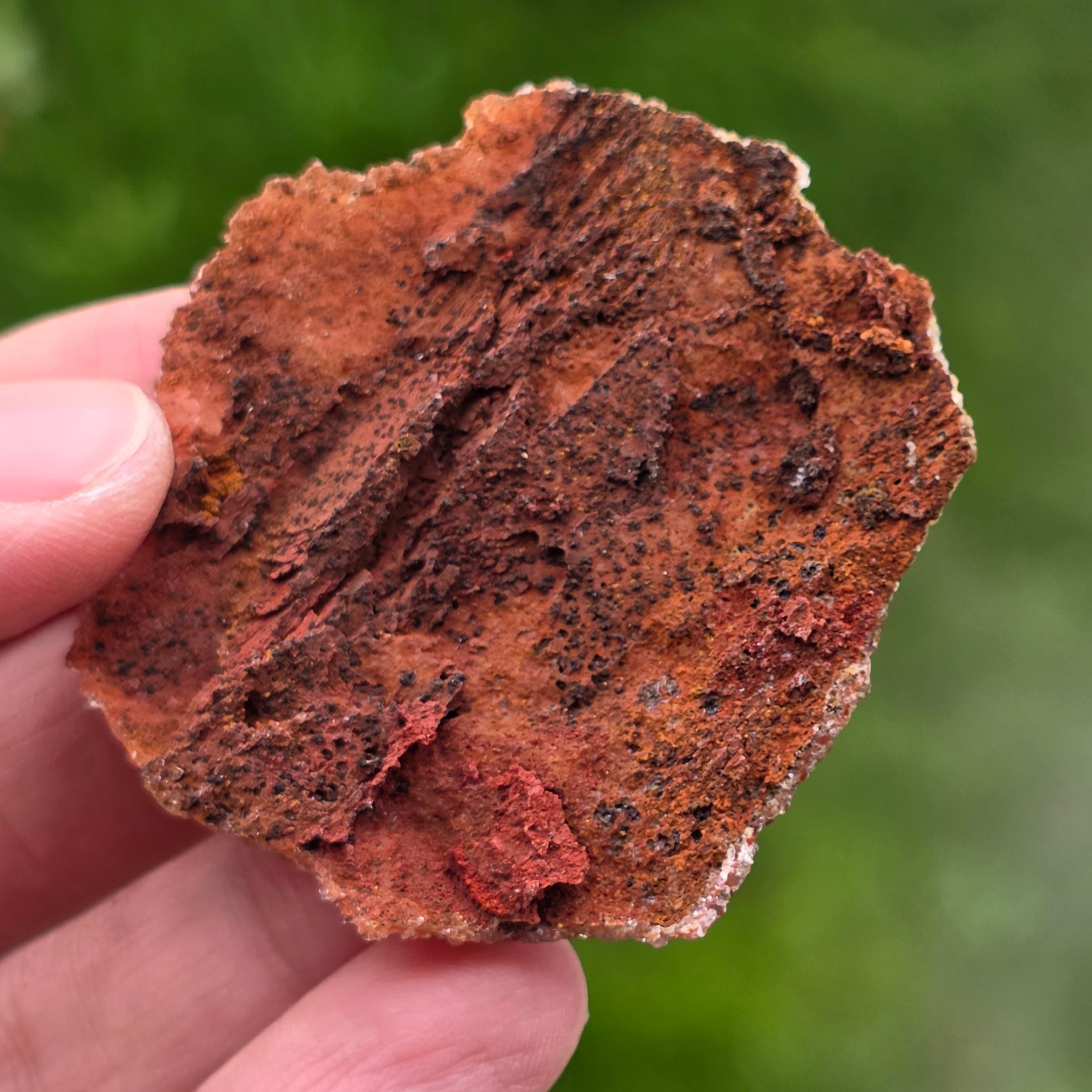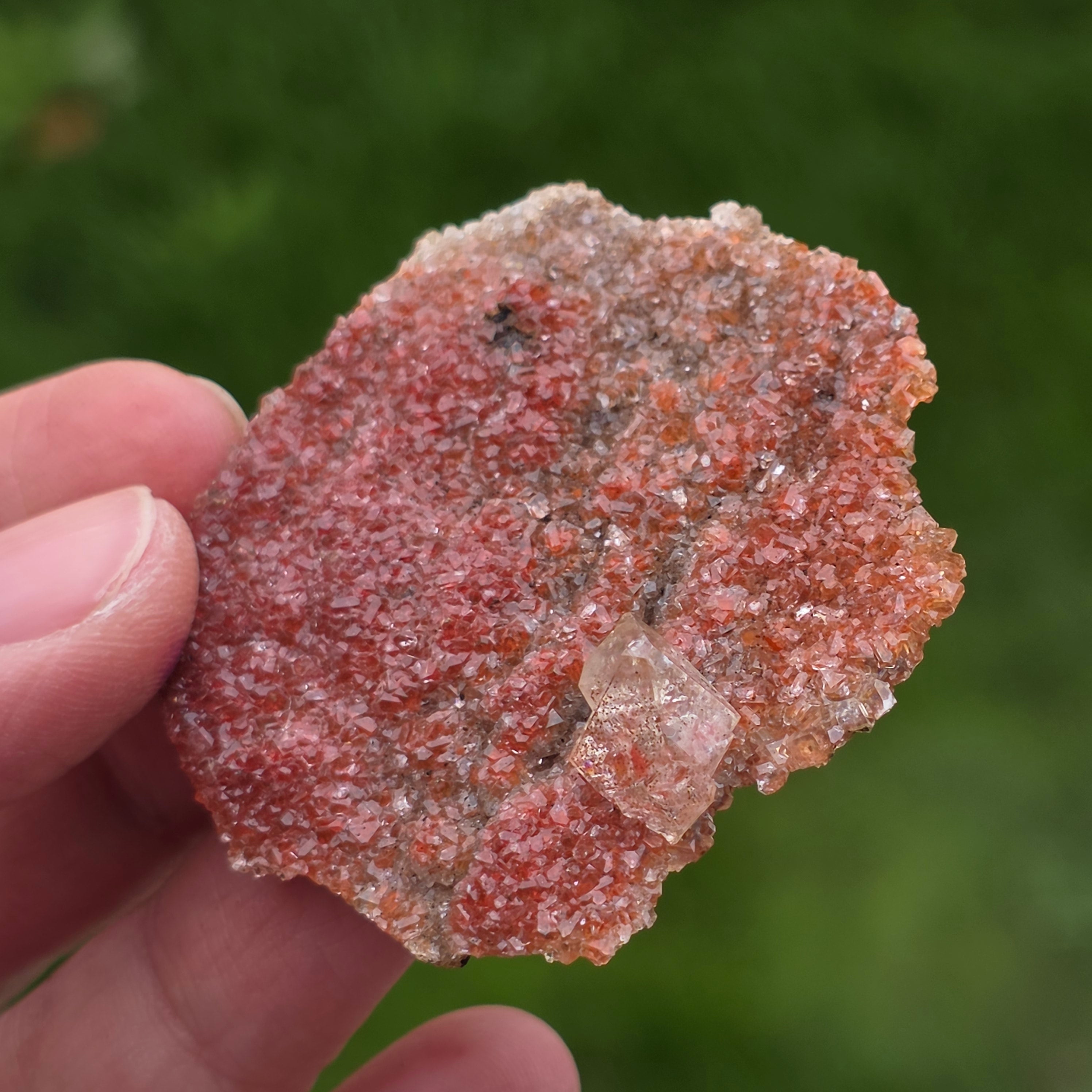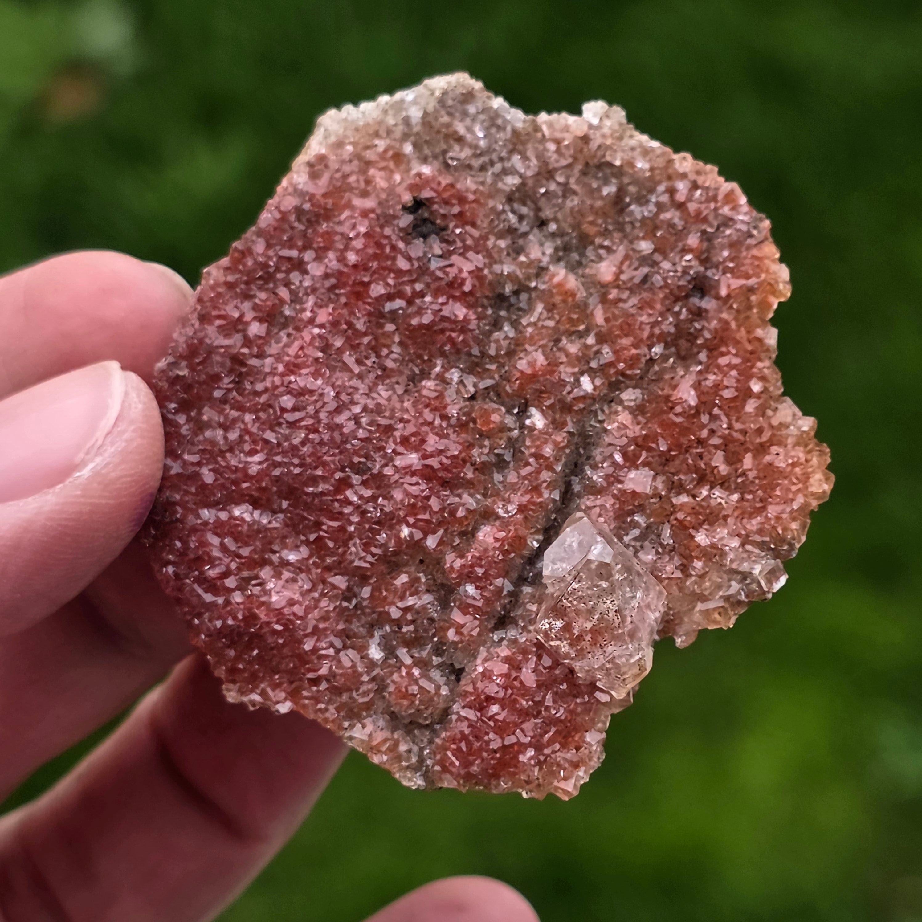 Cristalele de calcit prezintă habitul specific numit „diamond calcite”, caracterizat prin terminații bine definite și fețe strălucitoare, care reflectă lumina într-un mod subtil, dar expresiv. Dispunerea compactă a cristalelor creează o suprafață sclipitoare, cu textură bogată, fiecare piesă fiind diferită ca formă, intensitate a culorii și distribuție a cristalelor.