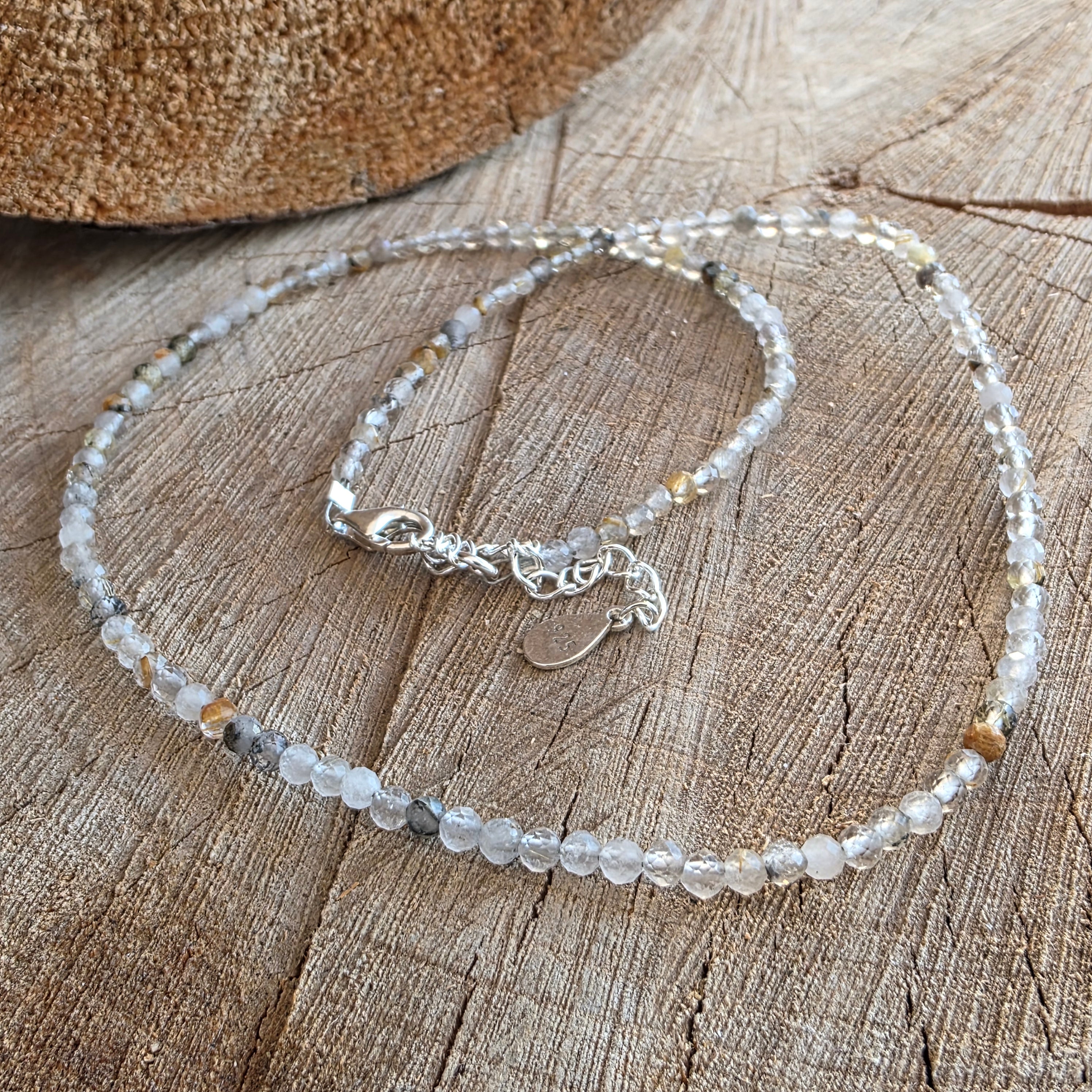 Le fil est composé de perles fabriquées par 3 mm, chacun d'eux gardant un monde entier à l'intérieur. Cette variété de quartz rare contient des aiguilles de rutyle fines - les fils dorés ou le cuivre suspendu en cuivre, comme les filaments solaires attachés au cristal. Ses réflexes discrets attrapent la lumière sous des angles subtils, créant une impression de mouvement vivant mais calme.