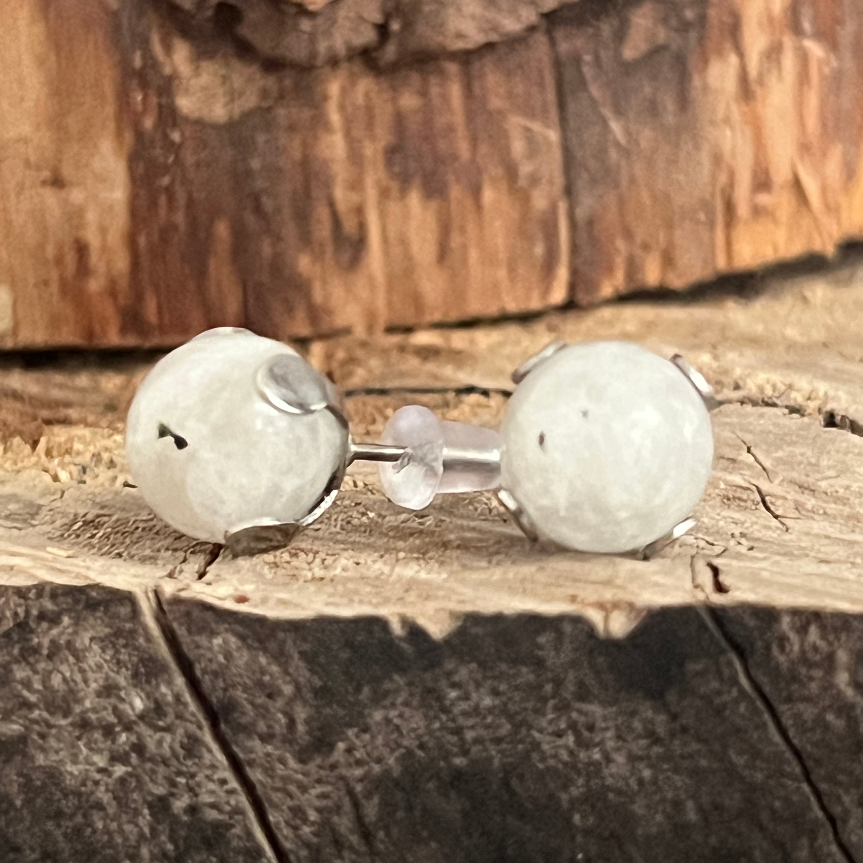 Acești cercei stud din Piatra Lunii par modelați dintr-o rază de lumină — sfere perfect rotunde care reflectă blând nuanțe sidefii și irizații albastre, asemenea reflexului unei nopți senine de vară.