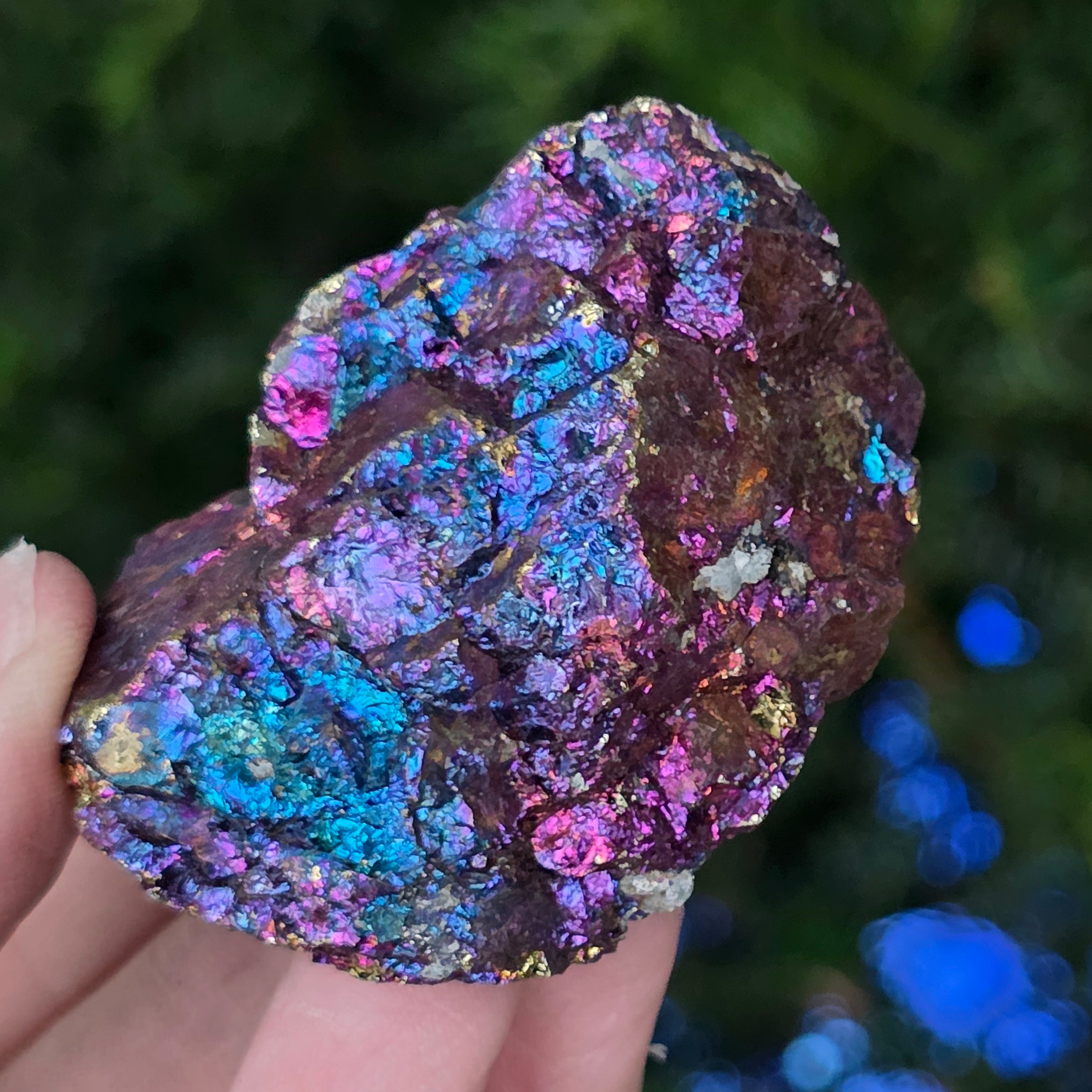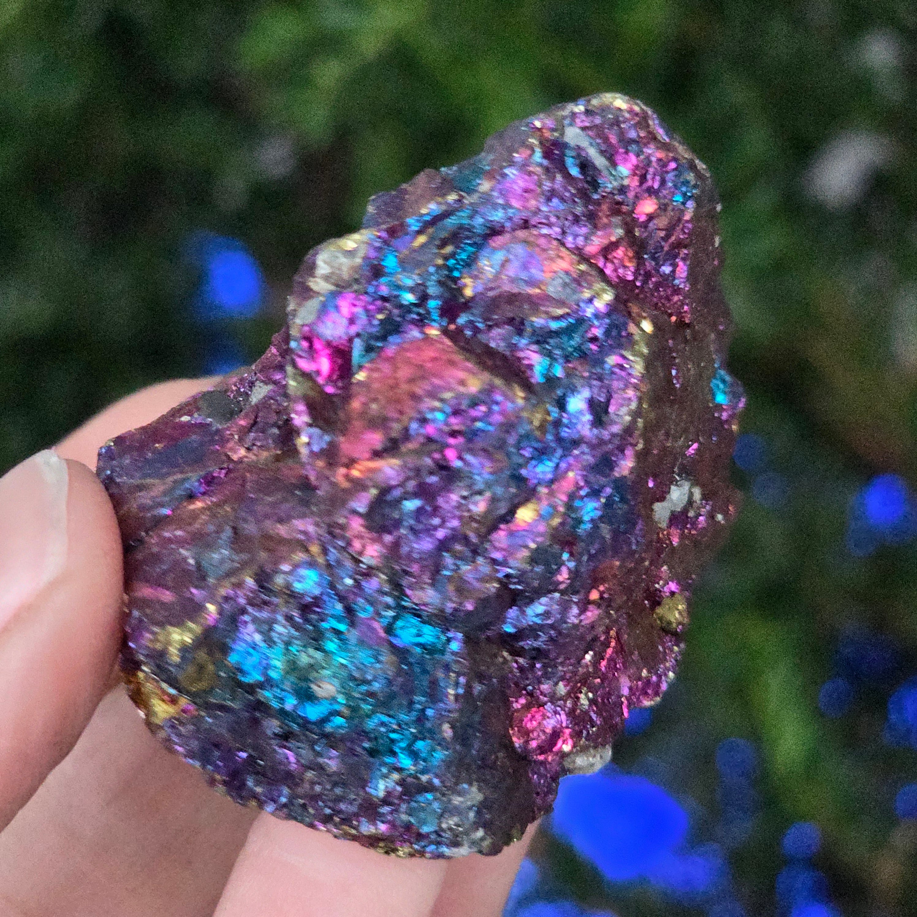 La chalcopyrite bleue, également connue sous le nom de chalcopyrite irisée, est un type de chalcopyrite présentant des teintes brillantes de bleu, violet, vert ou d'autres couleurs iridescentes. Cette irisation est causée par une fine couche d'oxydation à la surface du minéral, un processus naturel qui se produit lorsque la chalcopyrite est exposée à l'air et à l'humidité pendant une longue période.