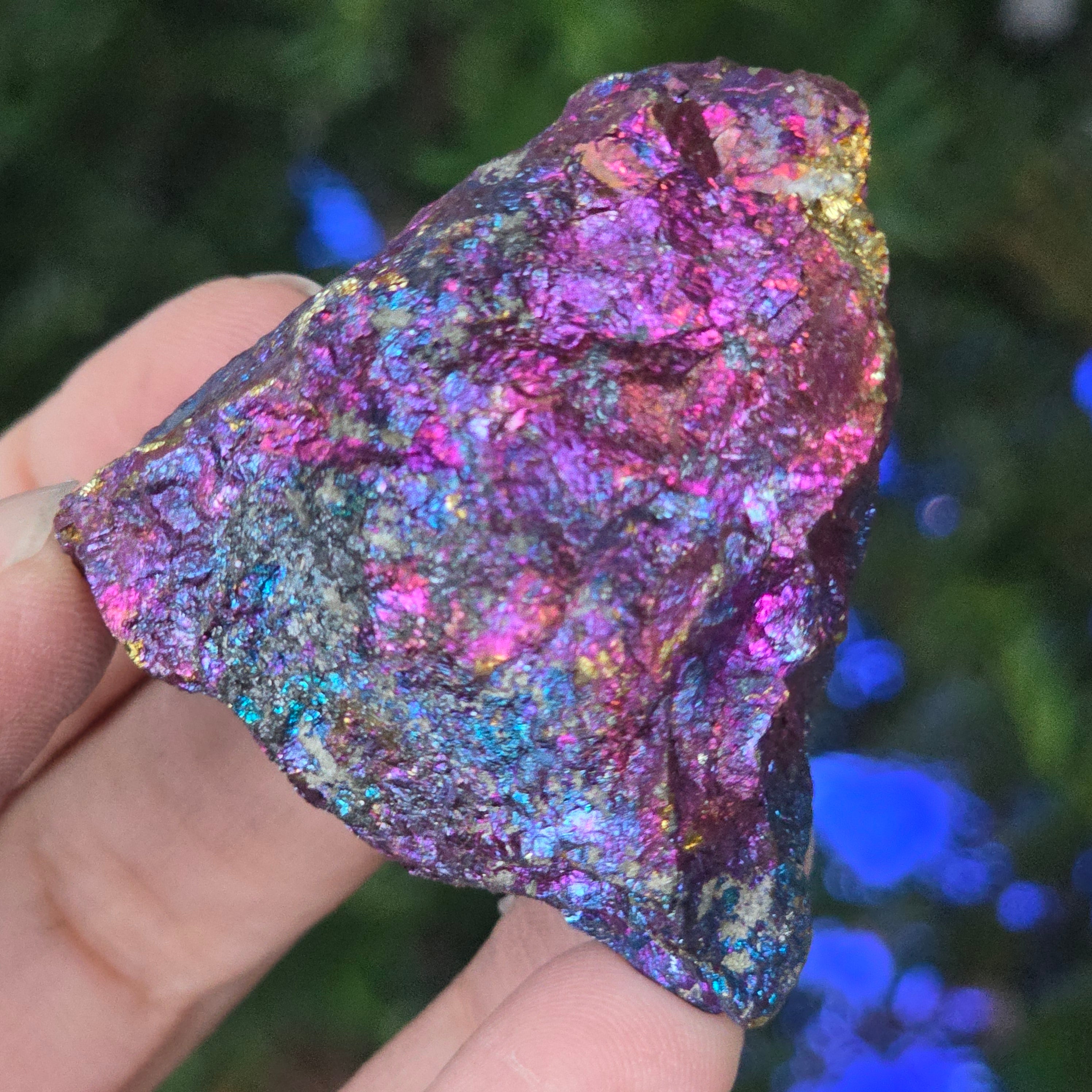 La chalcopyrite bleue, également connue sous le nom de chalcopyrite irisée, est un type de chalcopyrite présentant des nuances brillantes de bleu, violet, vert ou d'autres couleurs irisées. Cette irisation est causée par une fine couche d'oxydation à la surface du minéral, un processus naturel qui se produit lorsque la chalcopyrite est exposée à l'air et à l'humidité pendant une longue période.