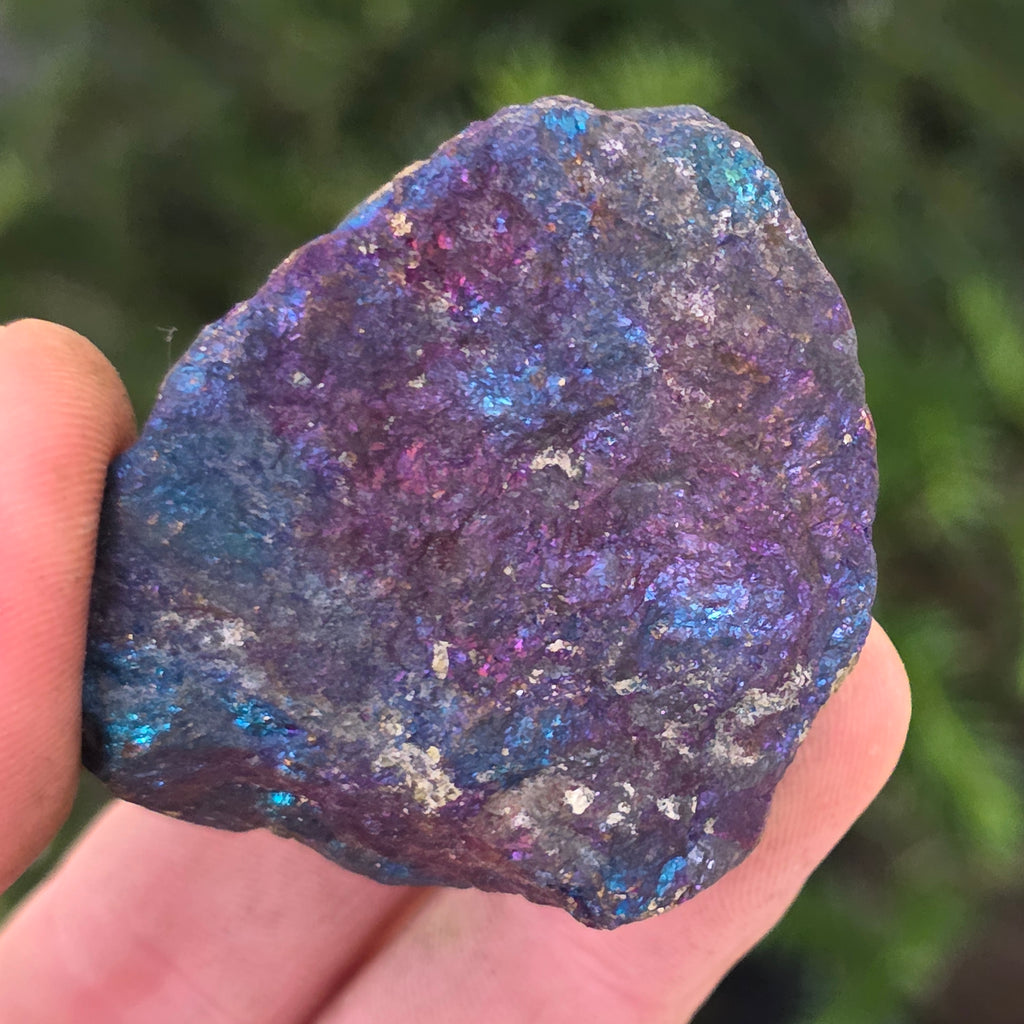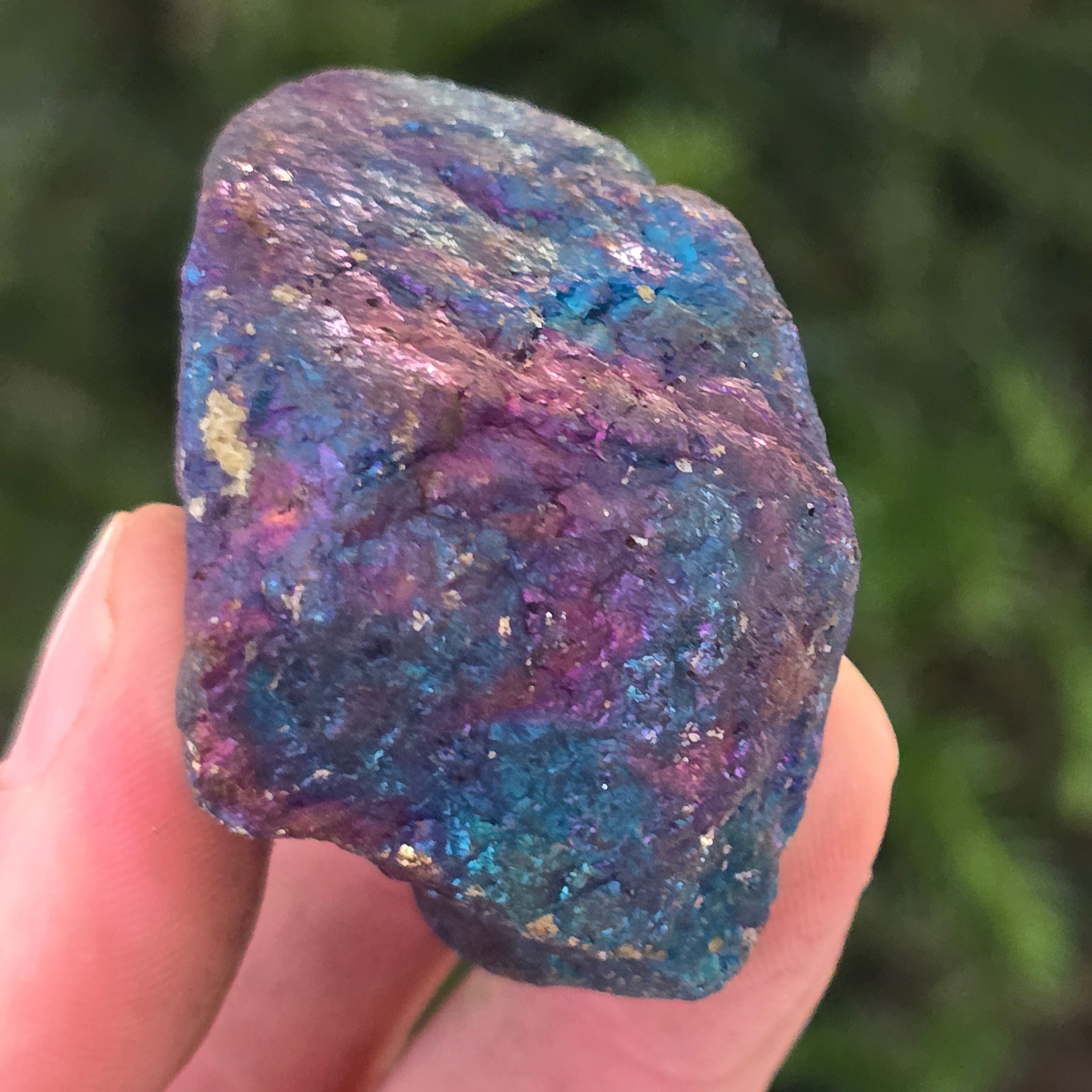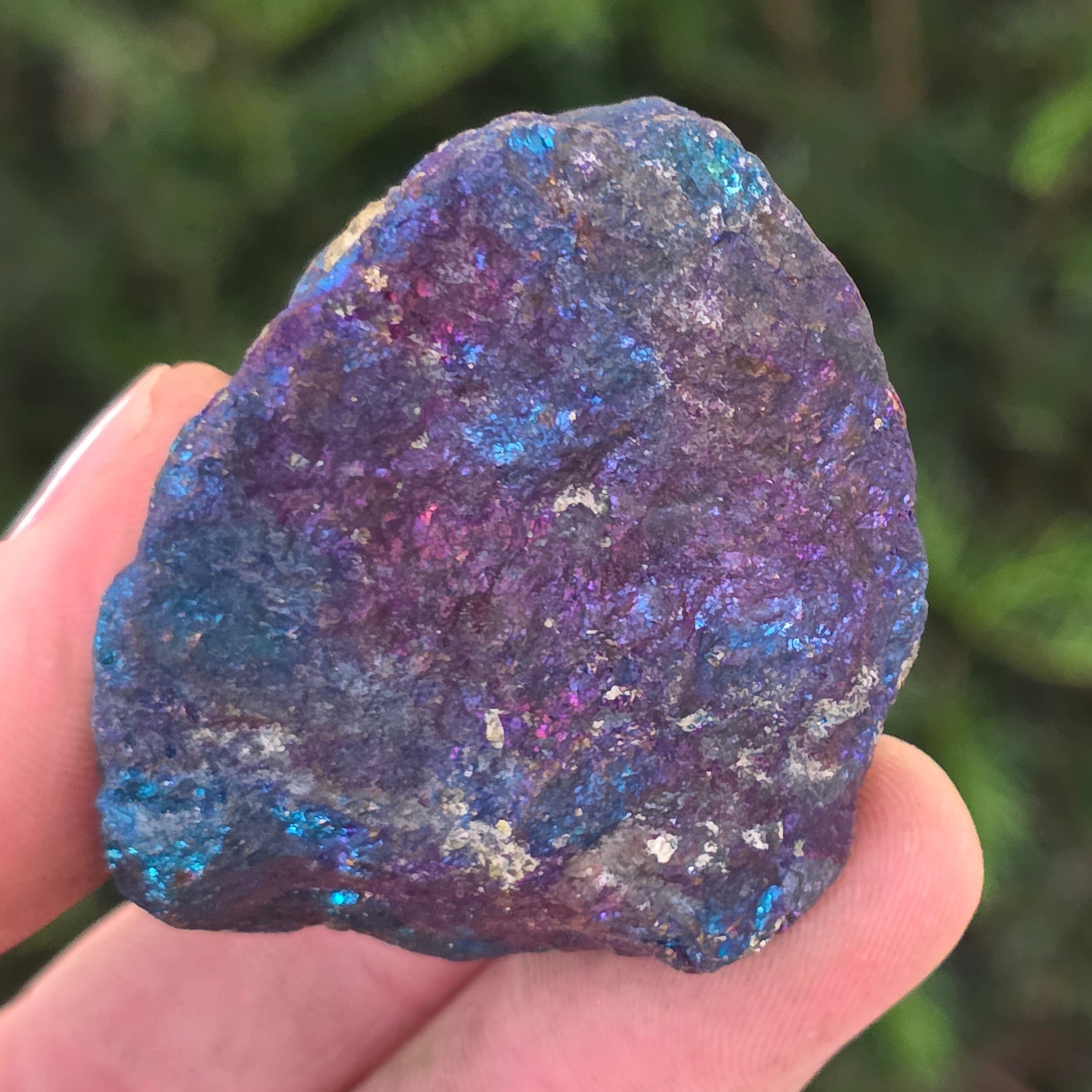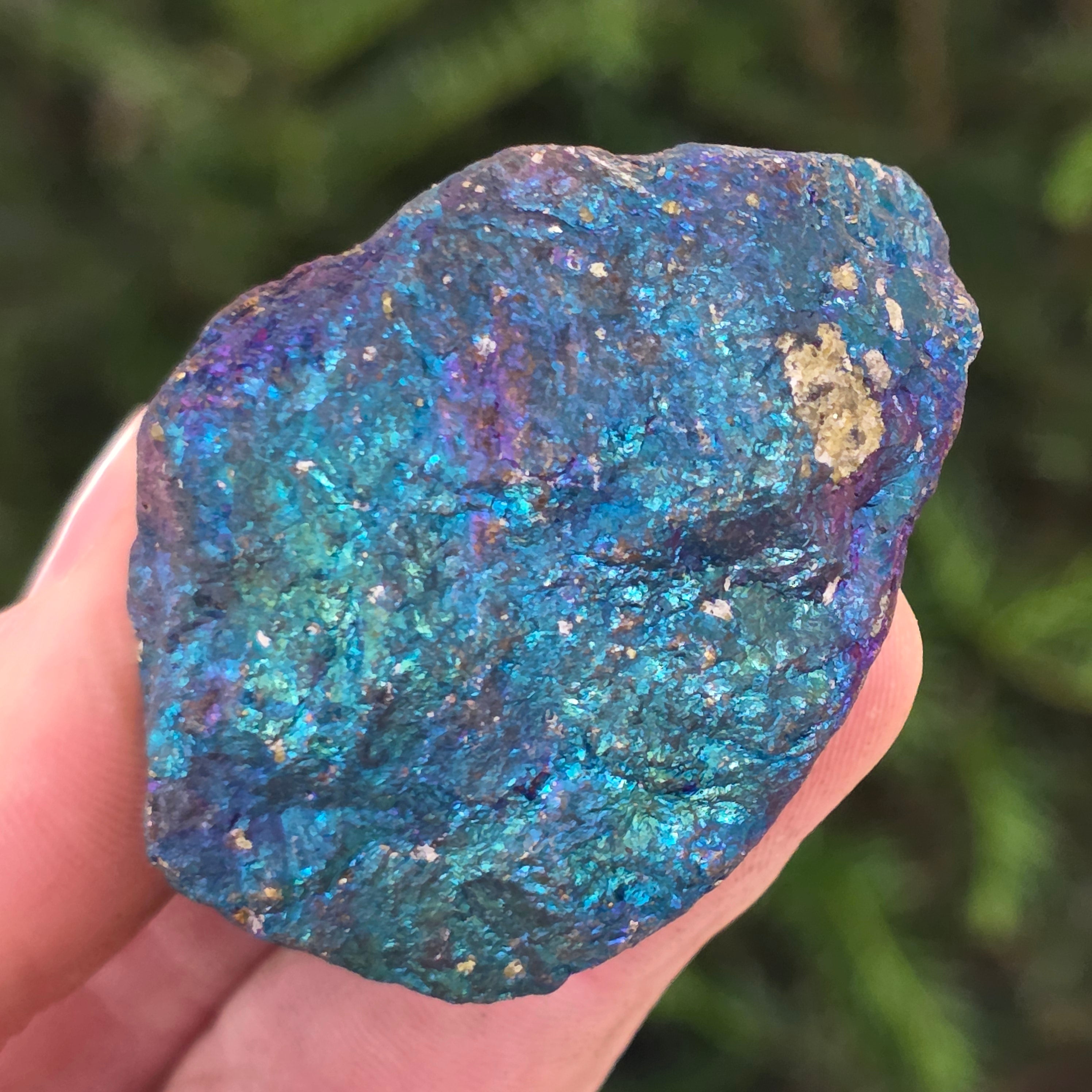 Chalcopyrite bleue, également connue sous le nom de chalcopyrite irisée, est un type de chalcopyrite qui présente des nuances brillantes de bleu, violet, vert ou d'autres couleurs irisées. Cette irisation est causée par une fine couche d'oxydation à la surface du minéral, un processus naturel qui se produit lorsque la chalcopyrite est exposée à l'air et à l'humidité pendant une longue période.
