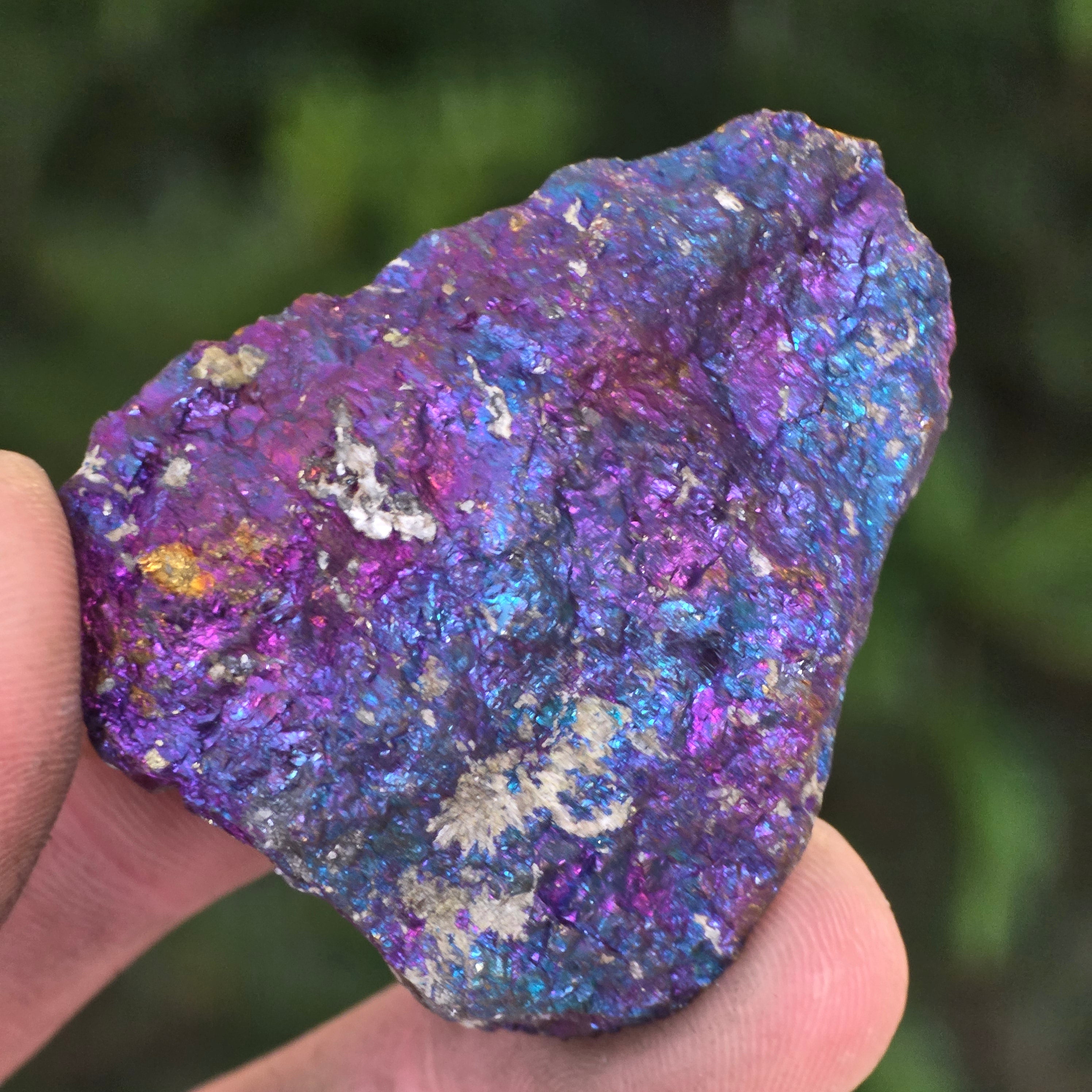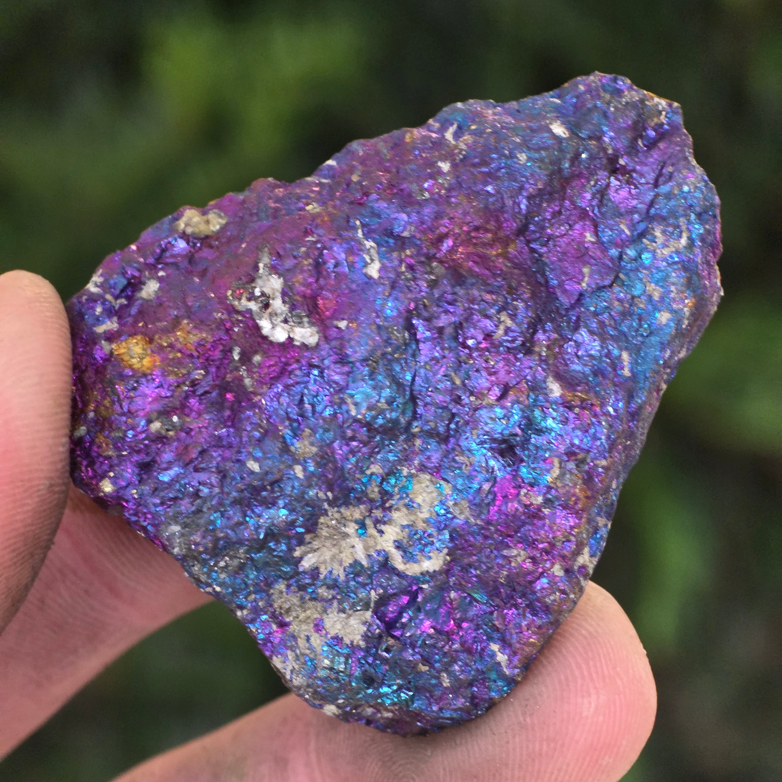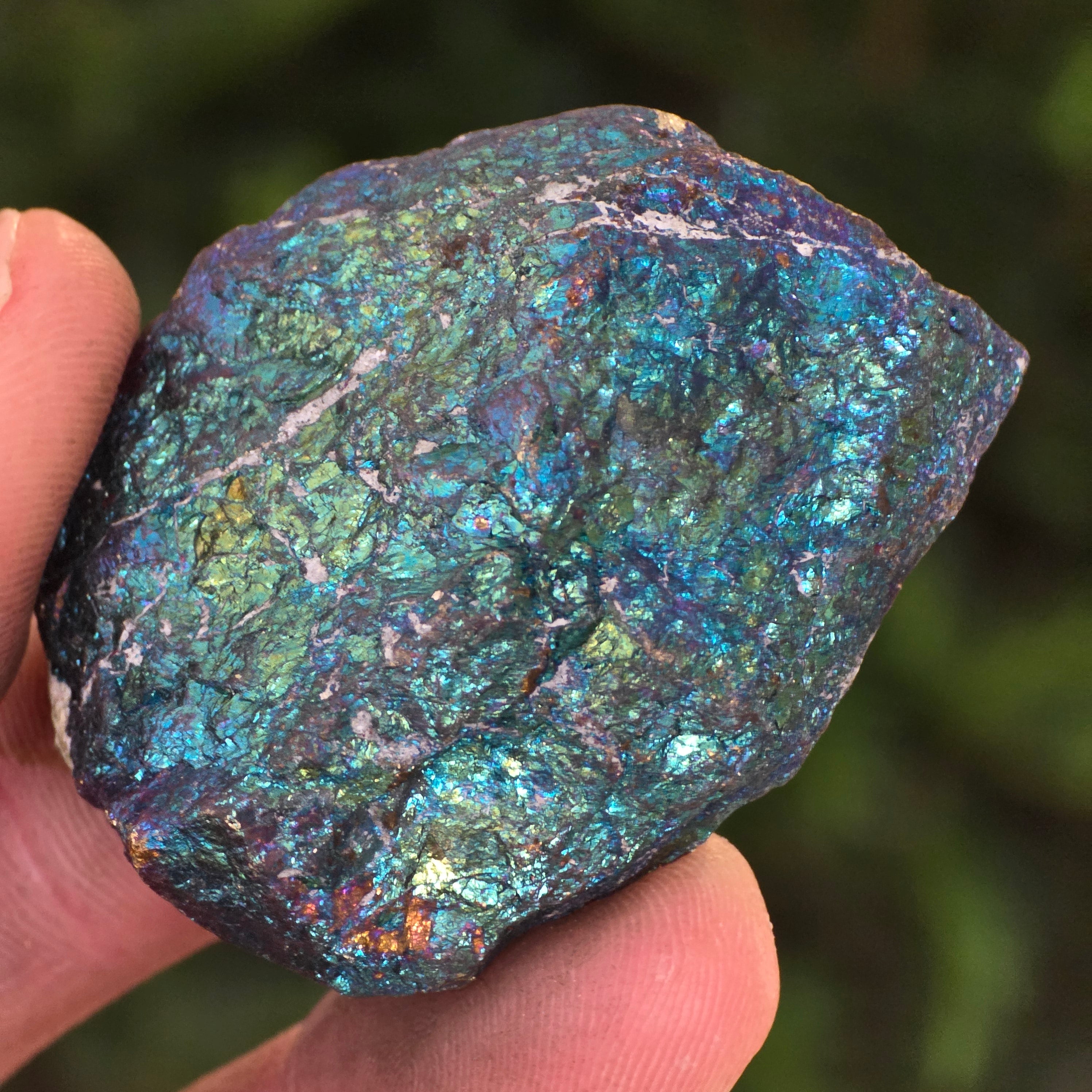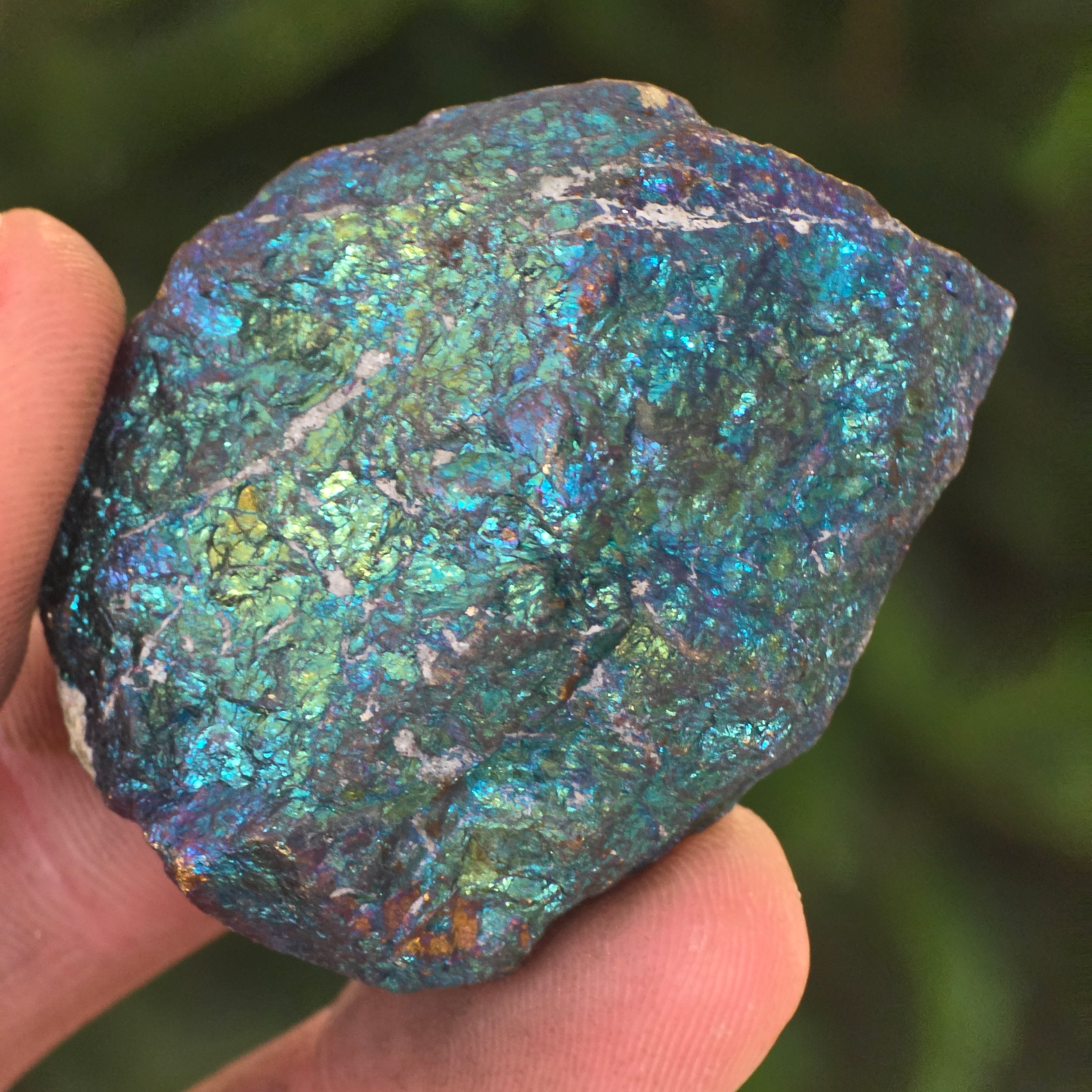 La chalcopyrite bleue, également connue sous le nom de chalcopyrite irisée, est un type de chalcopyrite qui présente des nuances brillantes de bleu, violet, vert ou d'autres couleurs irisées. Cette irisation est causée par une fine couche d'oxydation à la surface du minéral, un processus naturel qui se produit lorsque la chalcopyrite est exposée à l'air et à l'humidité pendant une longue période.