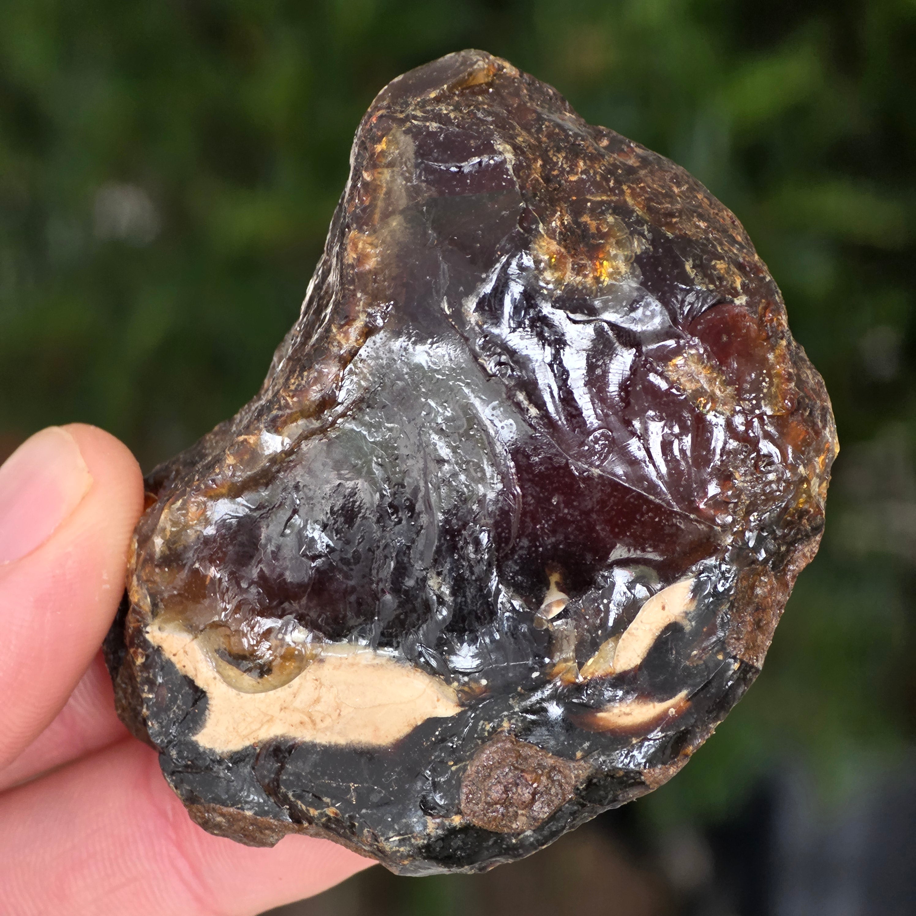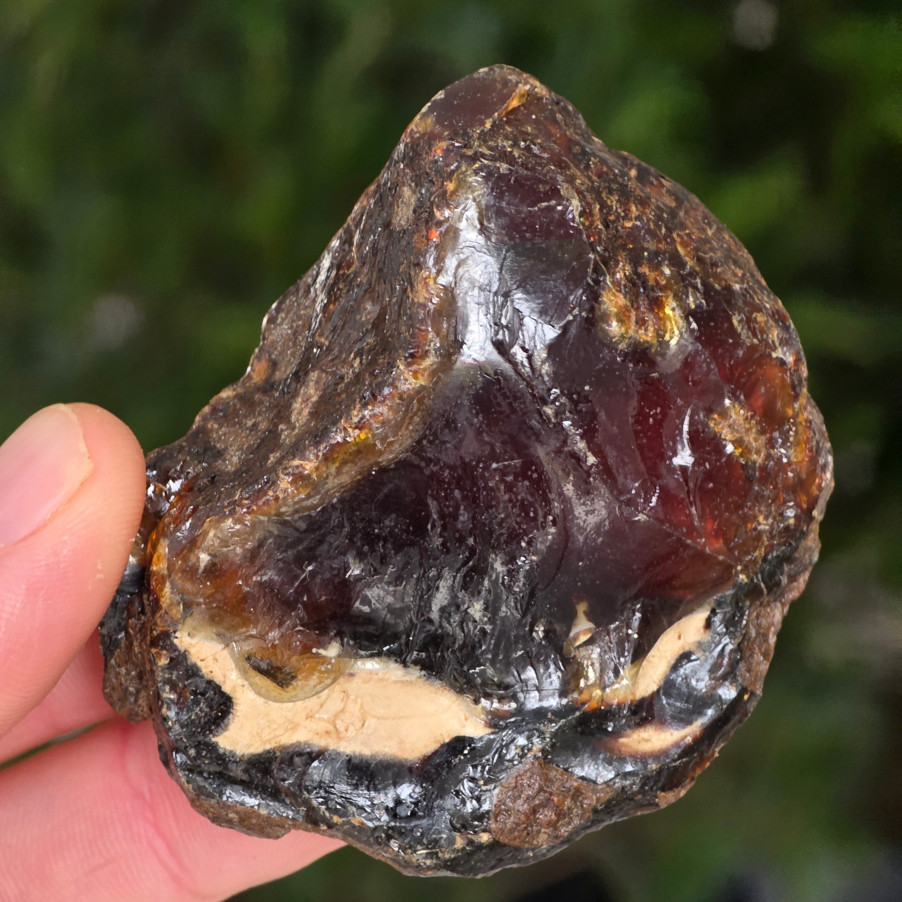 Specimen natural de chihlimbar fosil brut, provenit din regiunea Sumatra, Indonezia – una dintre puținele surse active de chihlimbar din Asia de Sud-Est. Această zonă tropicală este cunoscută pentru solurile sale bogate în sedimente organice și activitate geologică intensă, condiții ideale pentru formarea chihlimbarului.