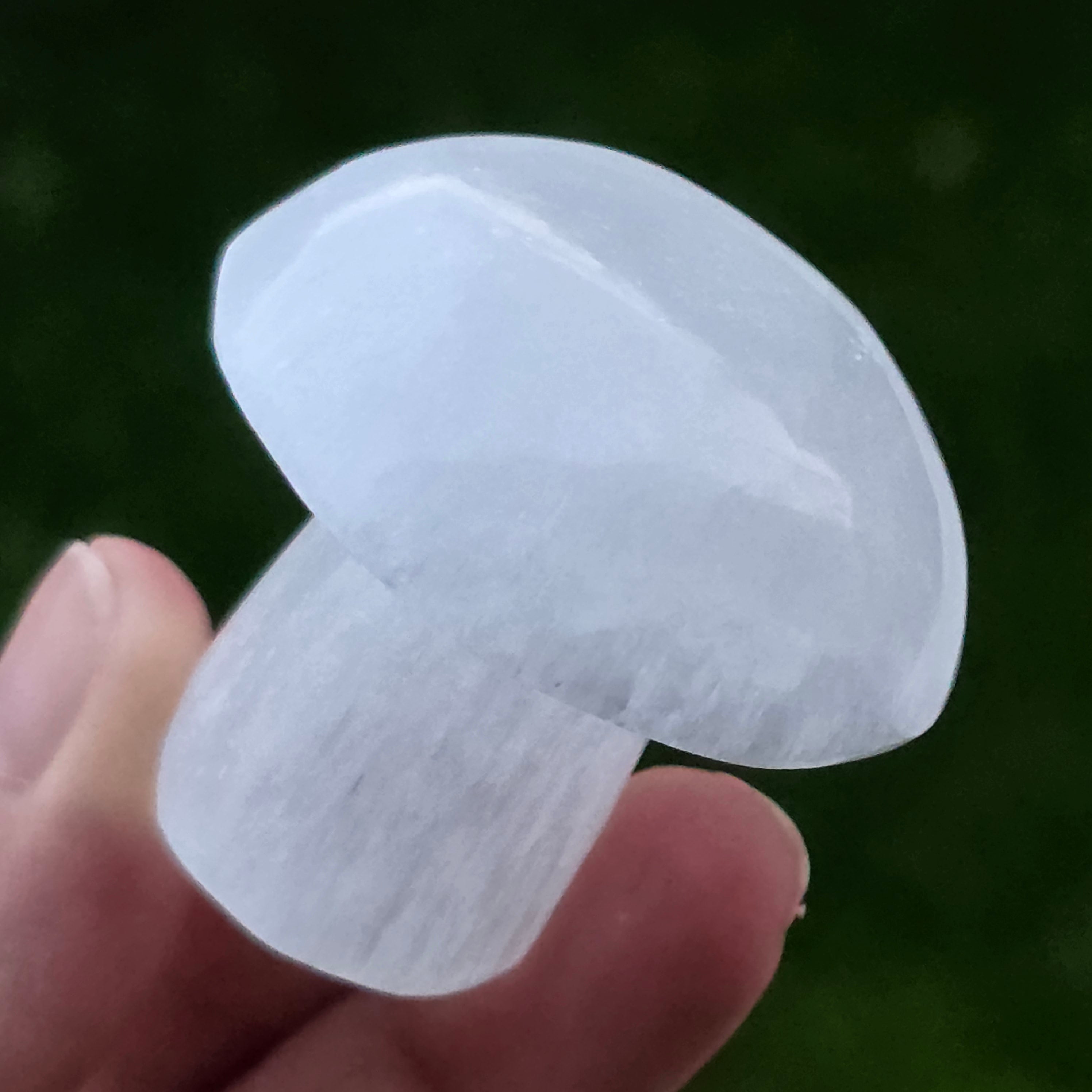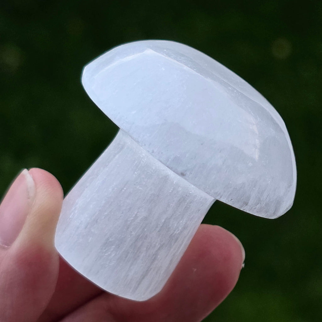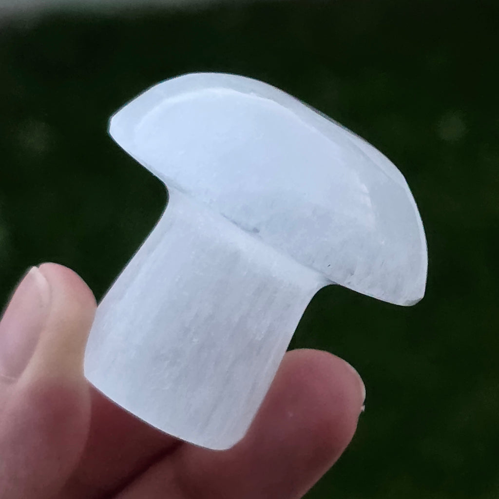 Ciuperca din Selenit este una dintre cele mai delicate și luminoase sculpturi care pot aduce un plus de magie discretă în orice spațiu. Realizată din selenit marocan natural, această piesă se remarcă prin luciul său satin, translucid, care prinde lumina în filamente fine și creează impresia unui obiect sculptat dintr-o rază solidificată.