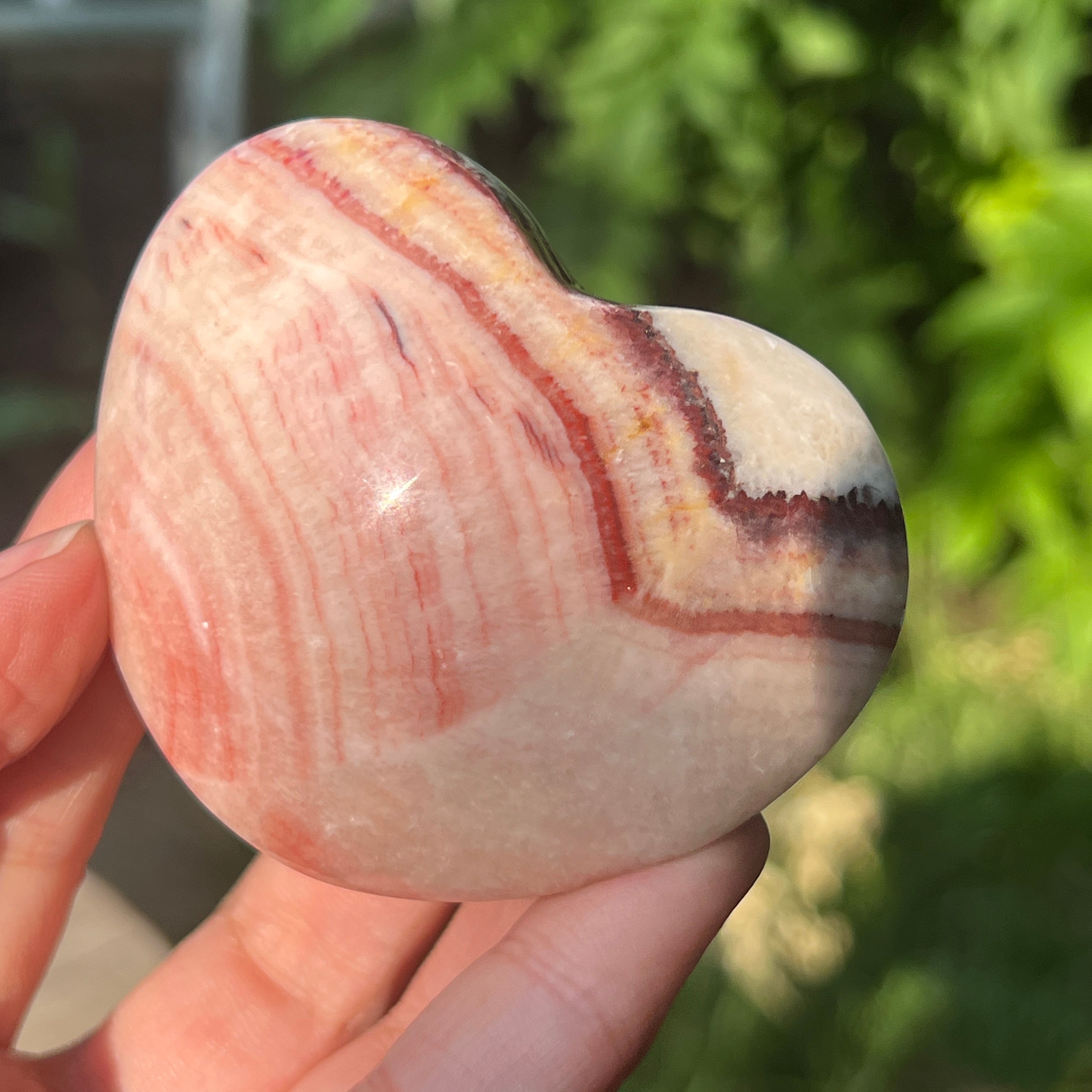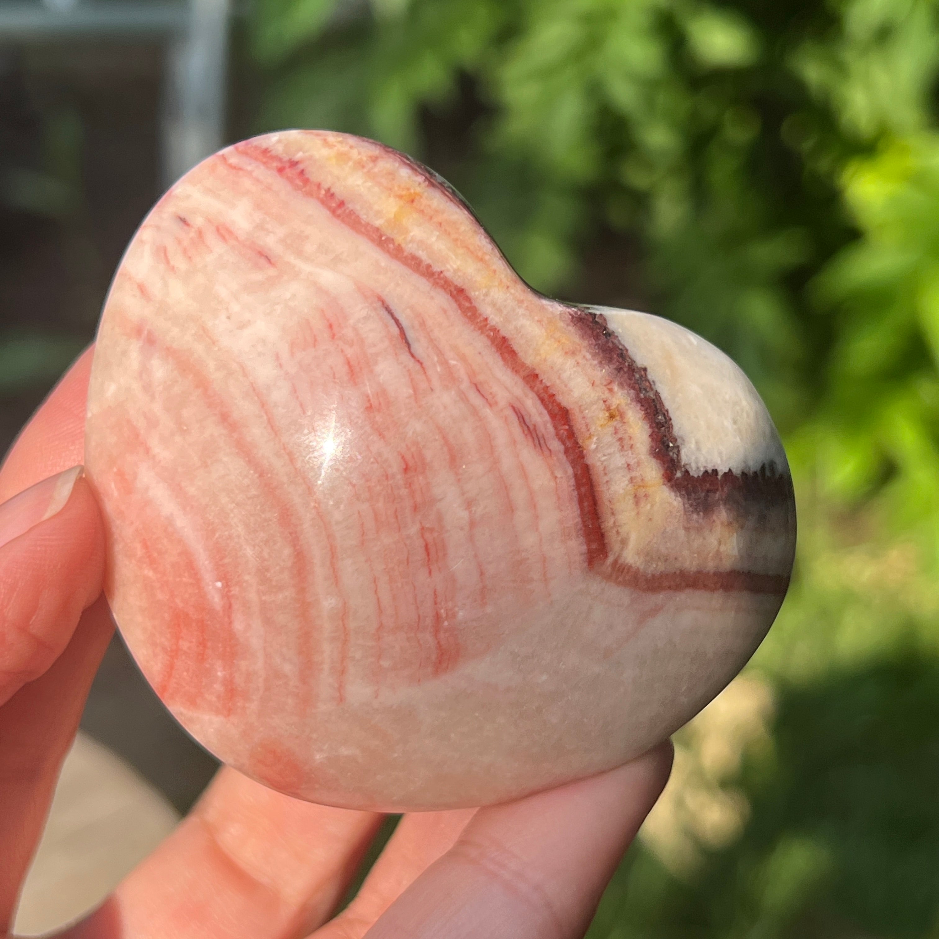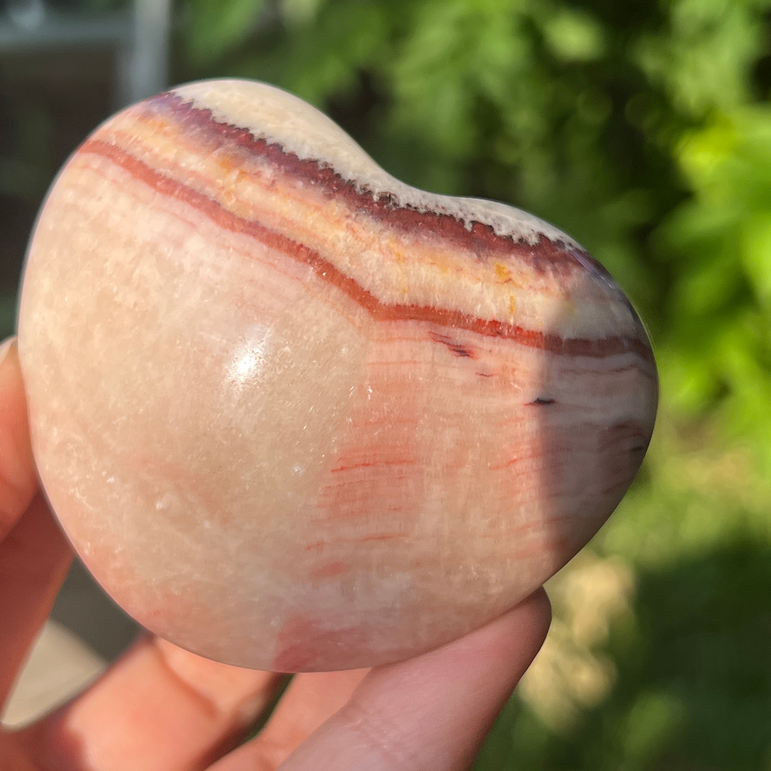 Ce cœur tiré à la main en calcite rose rayé apporte une note chaude et réconfortante dans n'importe quel espace. Les nuances roses douces, combinées à des bandes blanches ou crémeuses, évoquent le gingembre, l'équilibre intérieur et la protection de l'âme.