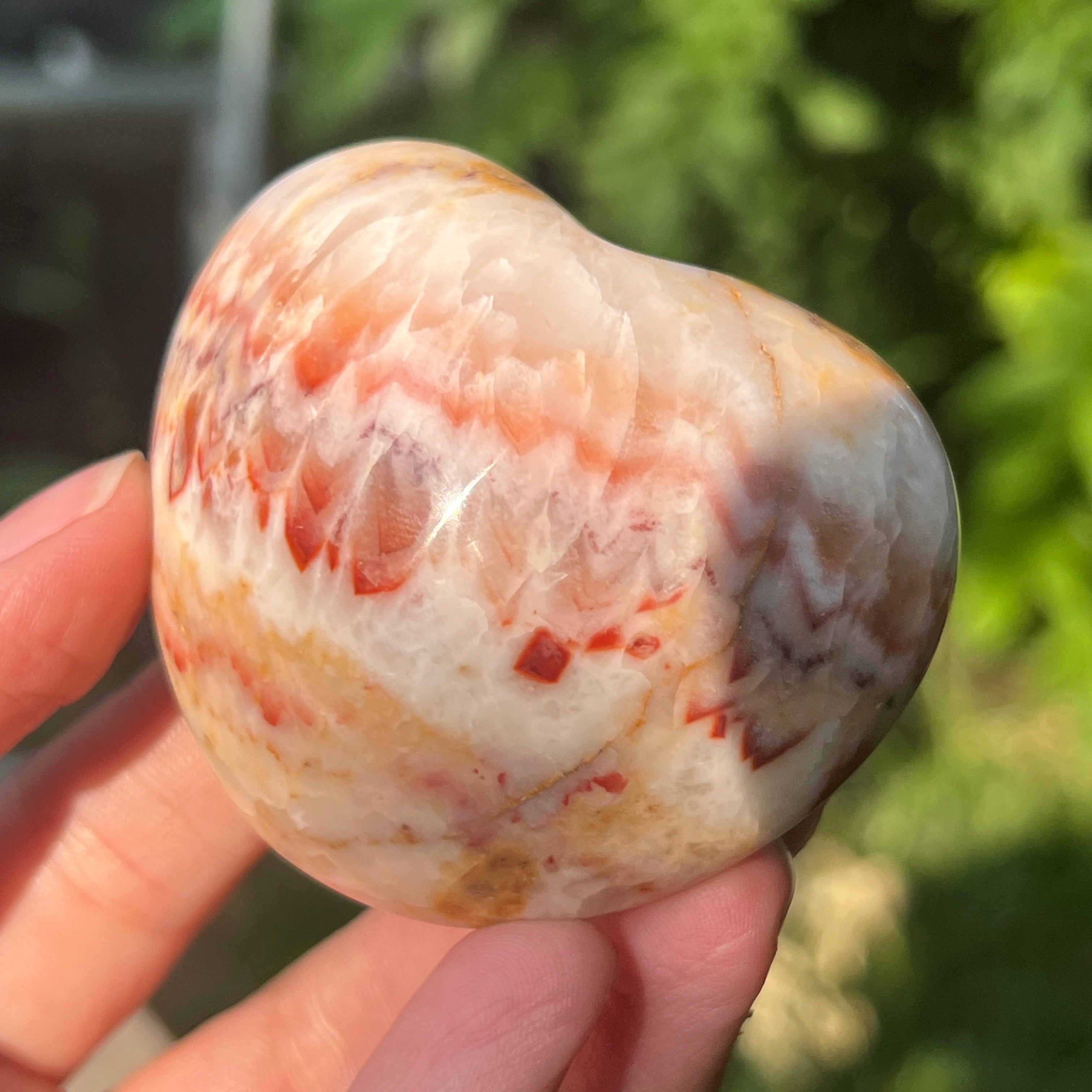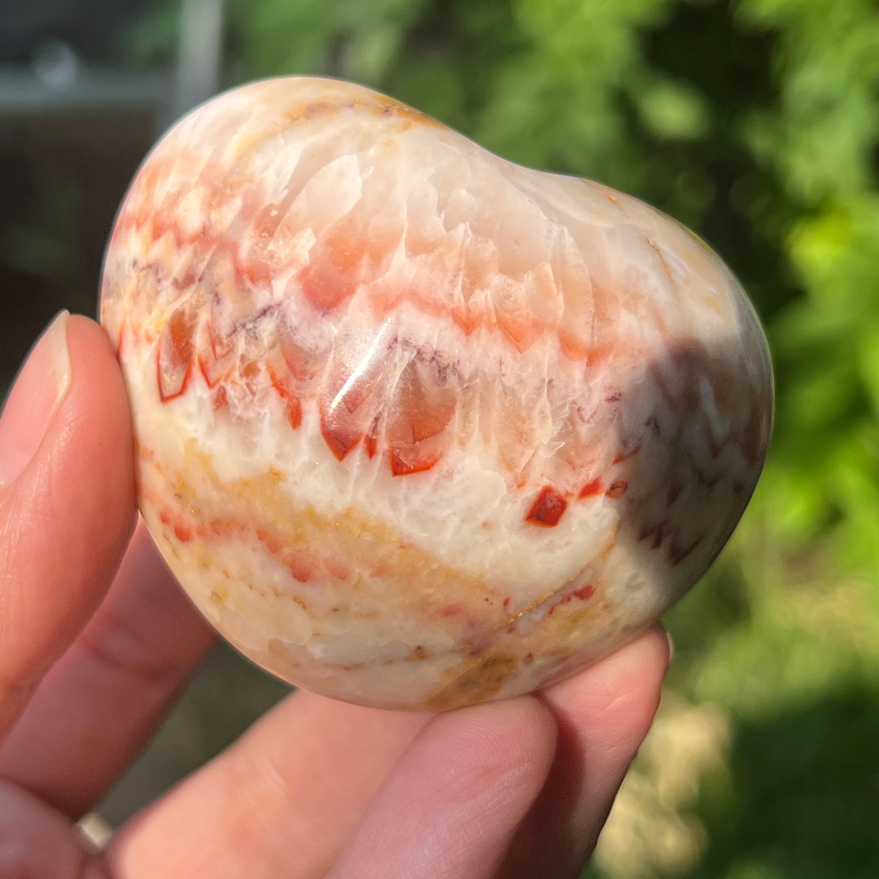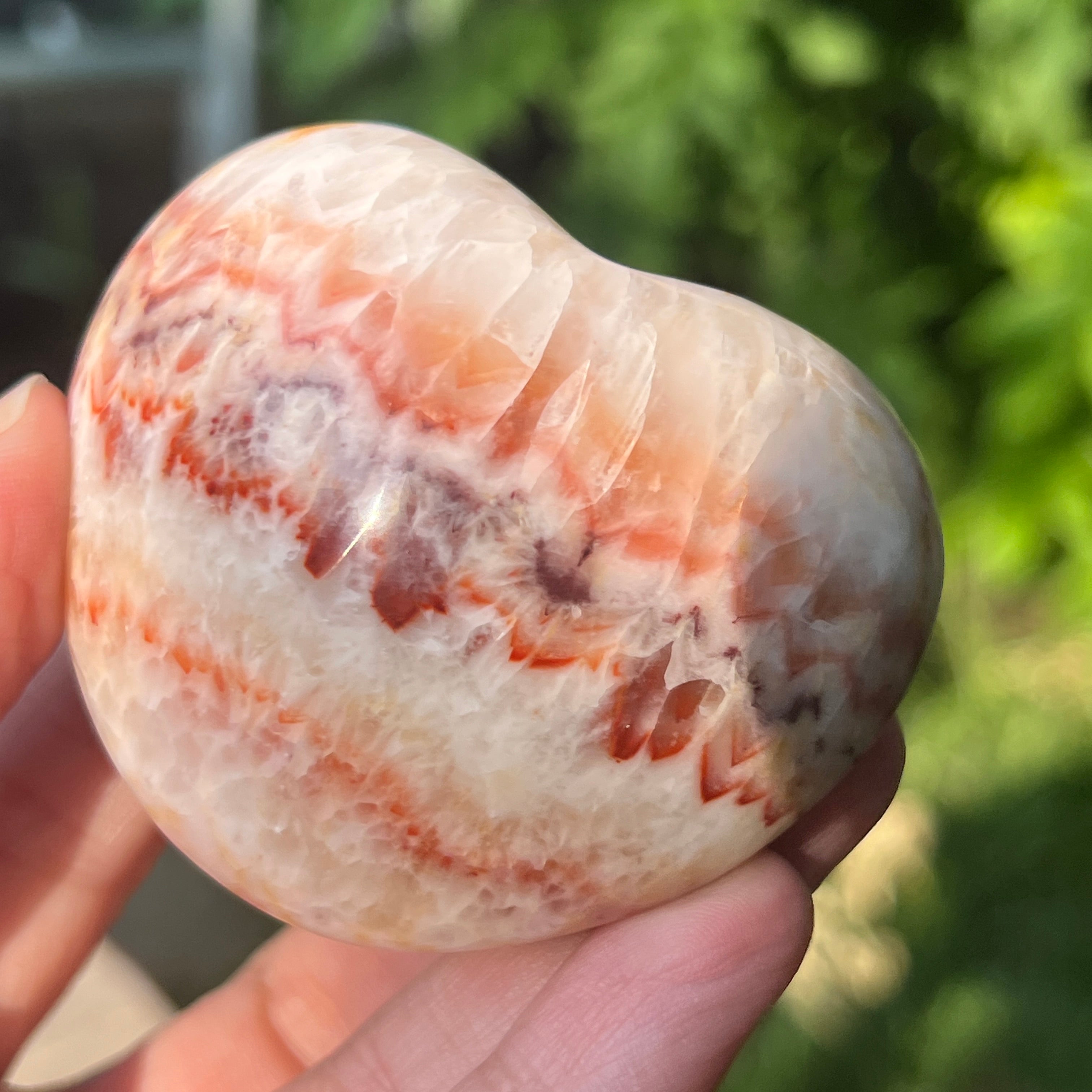 Ce cœur tiré à la main en calcite rose rayé apporte une note chaude et réconfortante dans n'importe quel espace. Les nuances roses douces, combinées à des bandes blanches ou crémeuses, évoquent le gingembre, l'équilibre intérieur et la protection de l'âme.