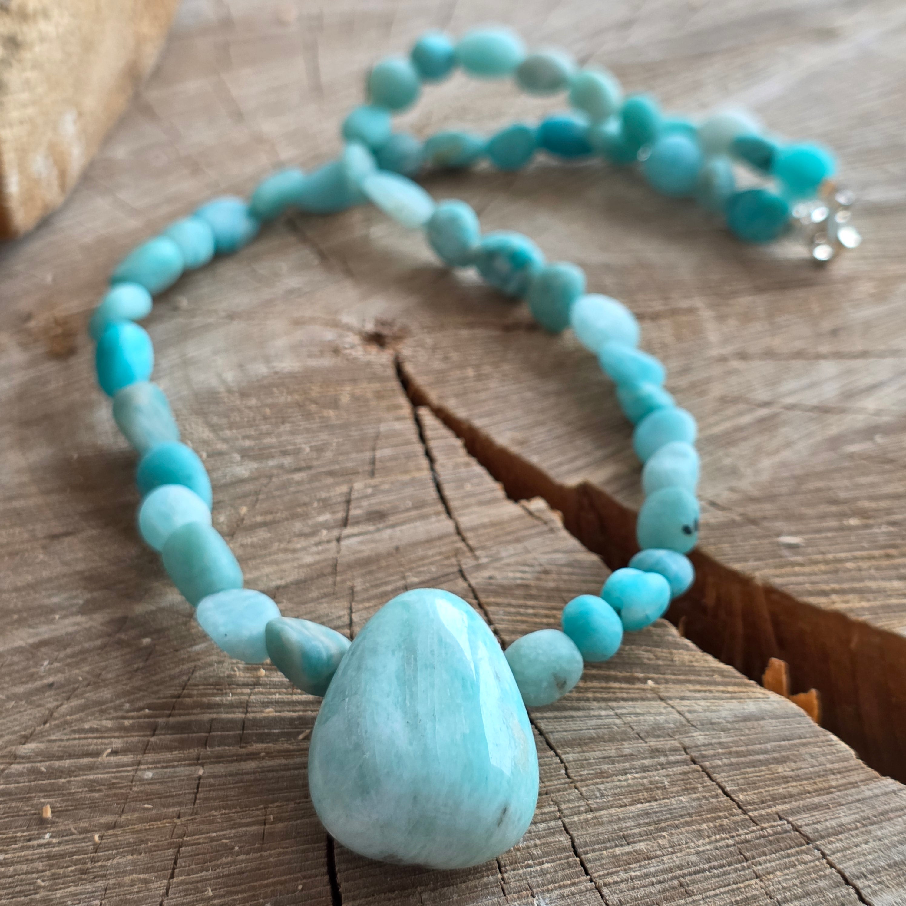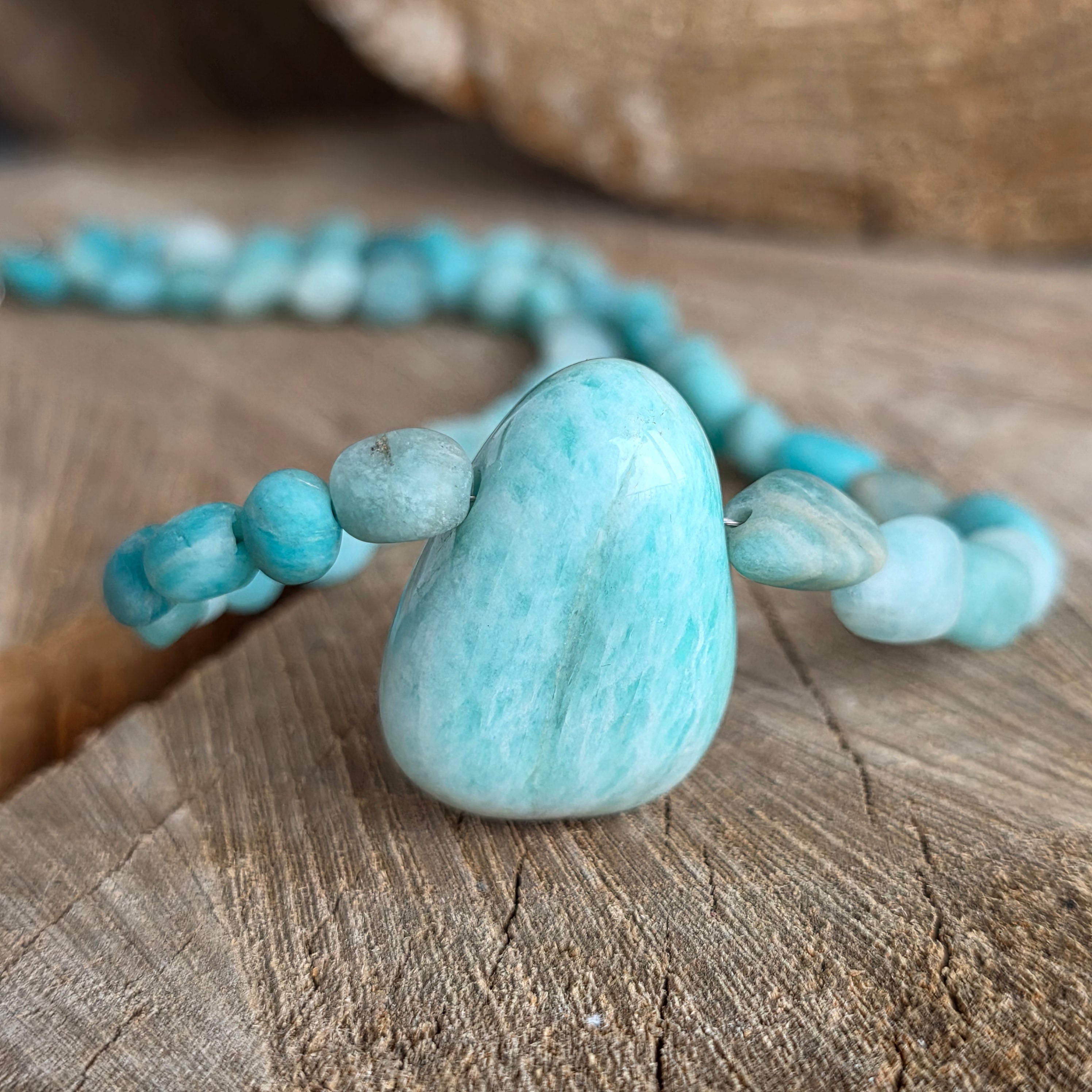 L'Amazonite est connue comme la pierre de la vérité et de l'harmonie intérieure. On dit qu'il ouvre le chakra du cou et du cœur, soutenant une communication sincère et le courage de dire ce qui est authentique. C'est une pierre d'équilibre entre l'émotion et la raison, entre la réceptivité et l'expression.