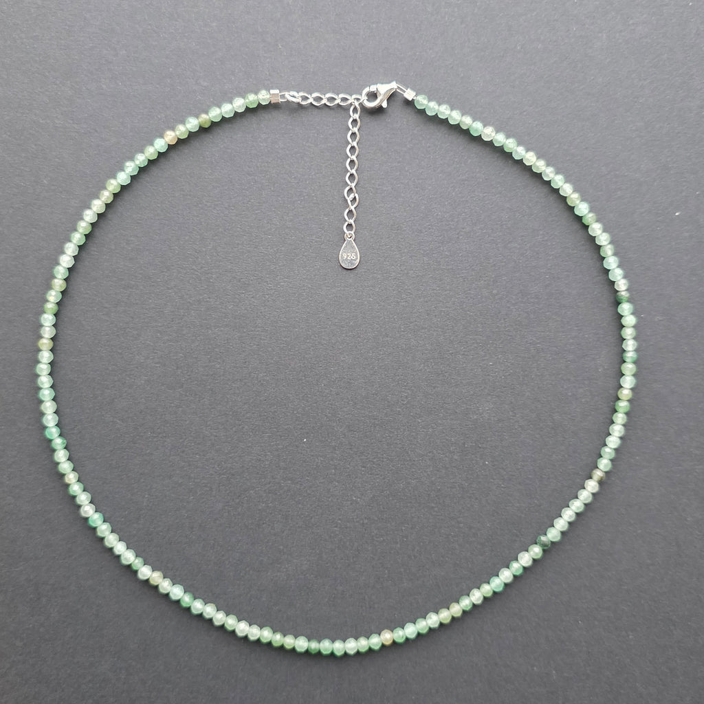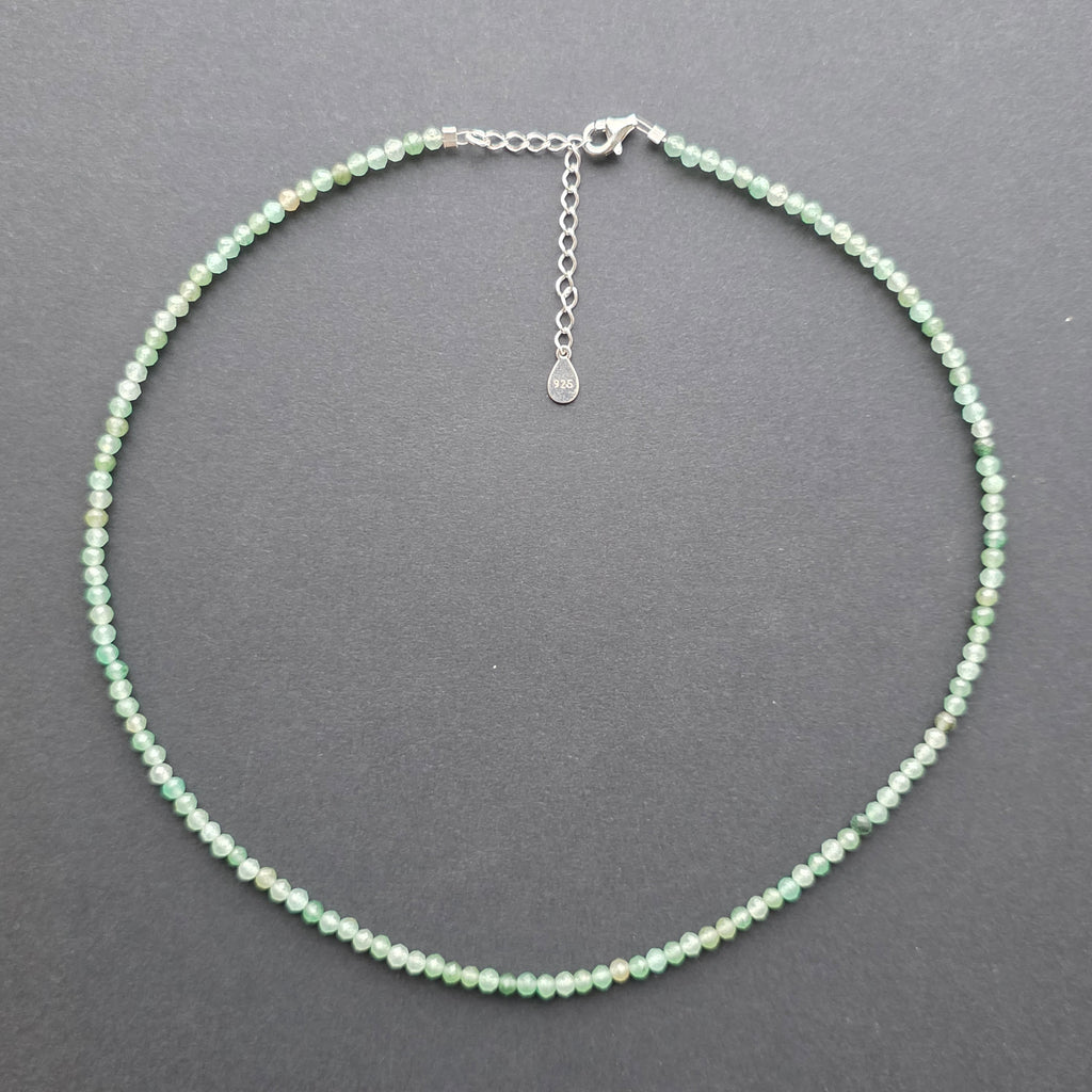 Un colier delicat și luminos, ce pare să păstreze esența unei dimineți senine. Aventurinul verde natural fațetat de 3 mm împrăștie sclipiri subtile la fiecare mișcare, într-un joc elegant de lumini și umbre. Designul său minimalist și finisajul impecabil fac din această bijuterie un accesoriu ideal atât pentru purtare zilnică, cât și pentru ocazii speciale.