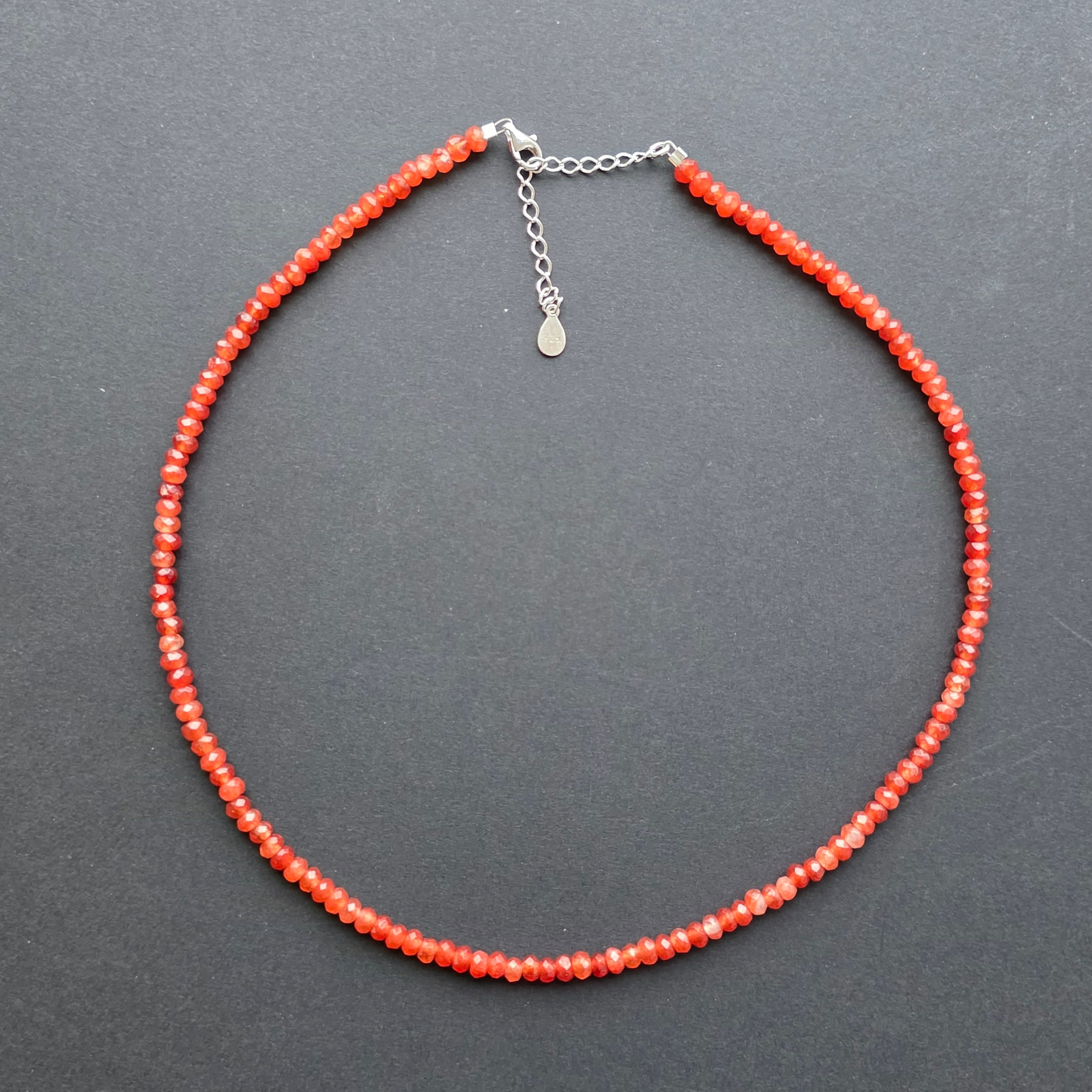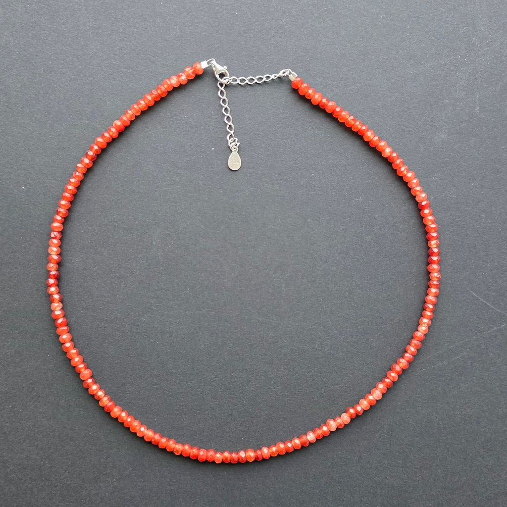 Un colier care radiază vitalitate, pasiune și căldură. Carneolul natural fațetat, tăiat în discuri delicate de 4,5 × 2 mm, poartă strălucirea apusurilor și energia focului interior. Jocul său de nuanțe – de la portocaliu pal la roșu-ambar – creează o vibrație vie și optimistă, un simbol al vieții trăite cu curaj și bucurie.