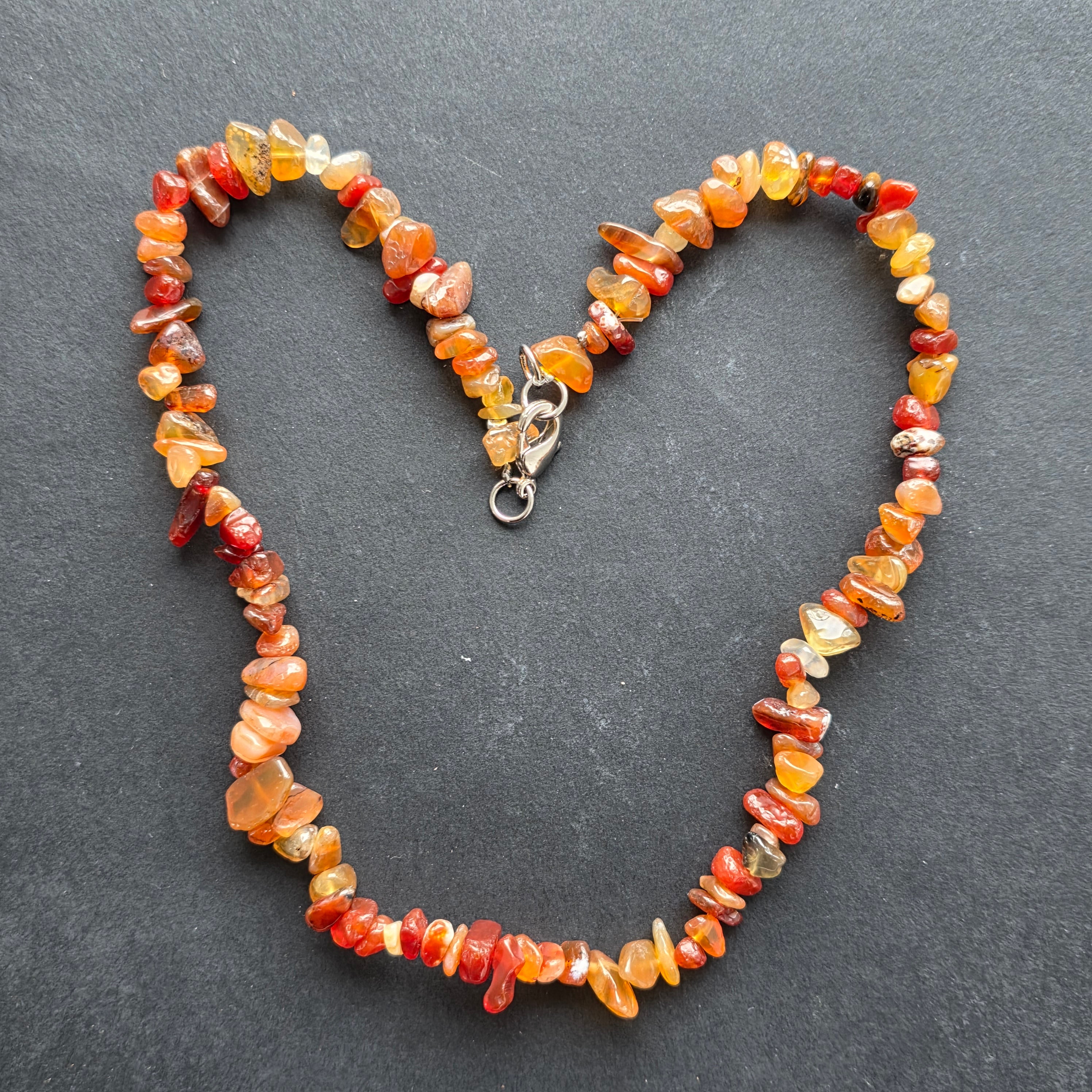 Un colier scurt, vibrant, creat din chipsuri de carneol natural, care poartă strălucirea apusurilor de foc și energia primară a Pământului. Fiecare bucățică de carneol, cu nuanțe de la portocaliu aprins până la roșu cărămiziu translucid, aduce un strop de căldură și curaj celui care îl poartă.