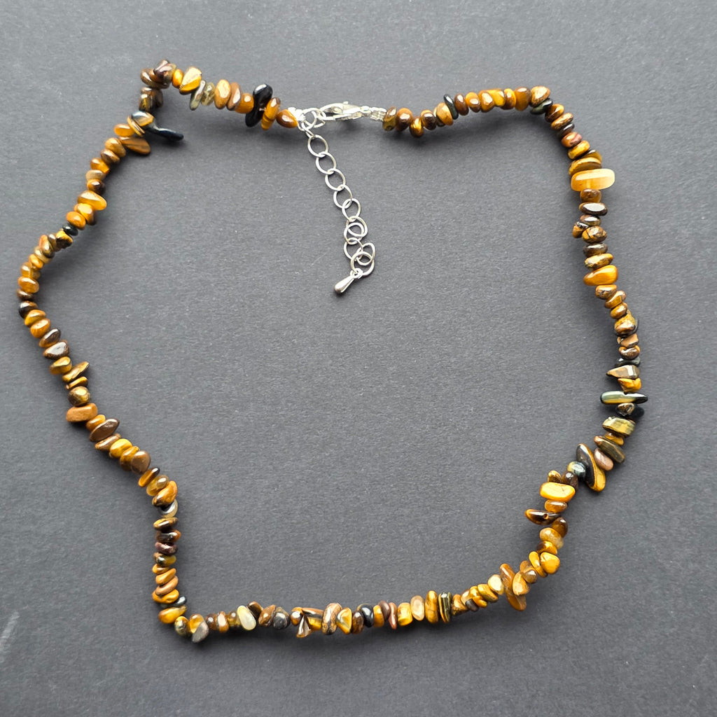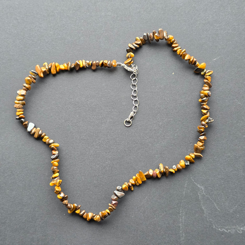 Un colier plin de forță vizuală, creat din chipsuri de ochi de tigru natural – unul dintre cele mai îndrăgite cristale datorită efectului optic cat’s eye și nuanțelor sale calde, auriu-maronii. Fiecare bucățică de piatră surprinde lumina în mod diferit, creând o vibrație vie, dinamică, cu reflexe ce se mișcă odată cu purtătorul.