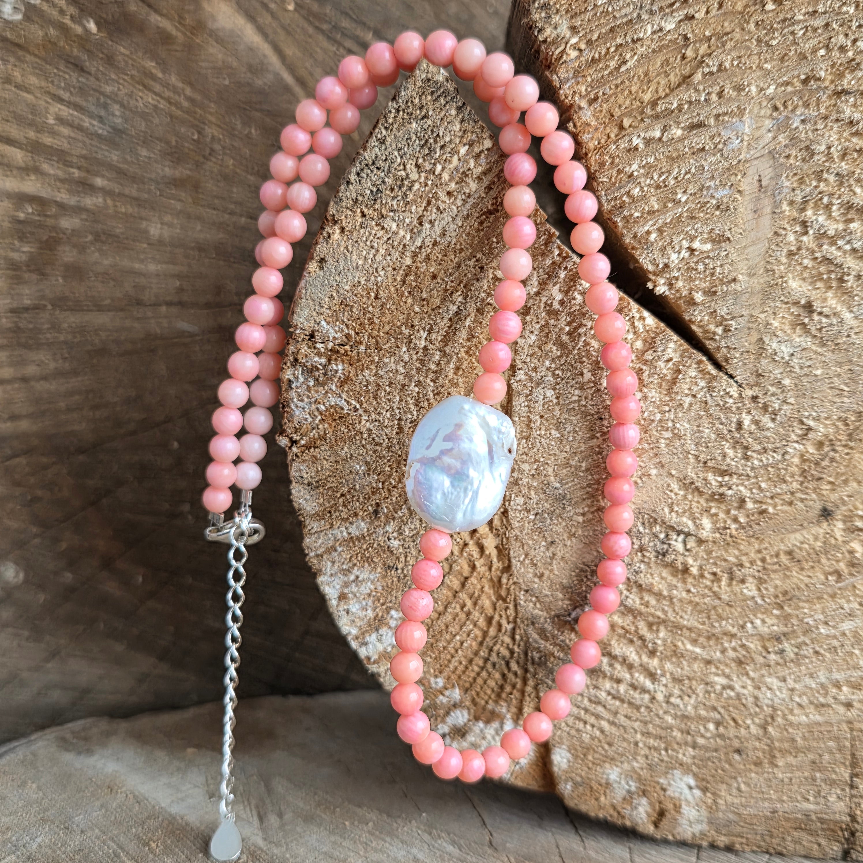 Matériels: Corail rose naturel (sphères 4 mm), perle naturel rectangulaire (environ 2 cm), argent 925