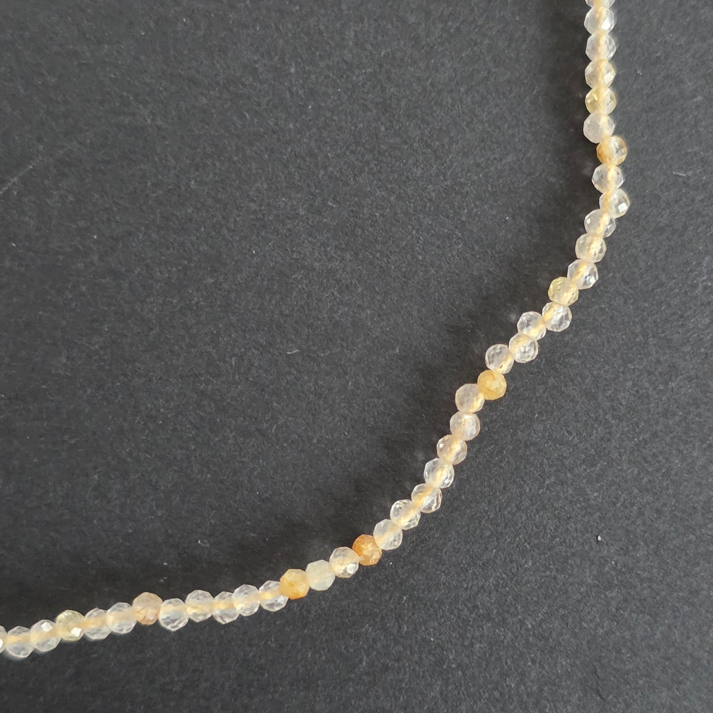 Un colier delicat și solar, apreciat pentru strălucirea sa caldă și lumina blândă pe care o reflectă. Nuanțele pastelate de galben, translucid și subtil irizate, oferă colierului un aspect pur, luminos, aproape eteric. Fiecare sferă fațetată creează un joc discret de reflexii, transformând piesa într-un accesoriu elegant, perfect pentru cei care iubesc bijuteriile fine și naturale.