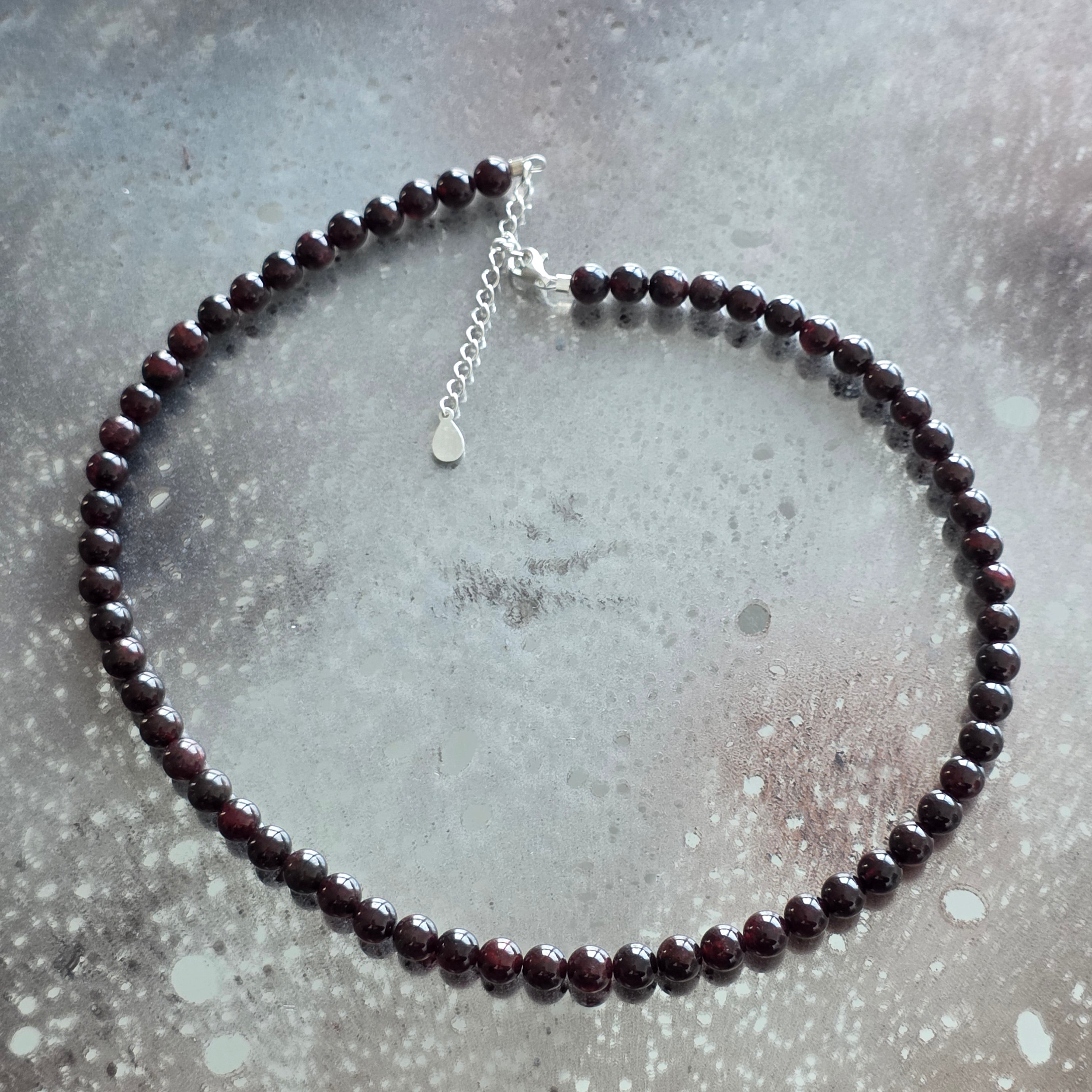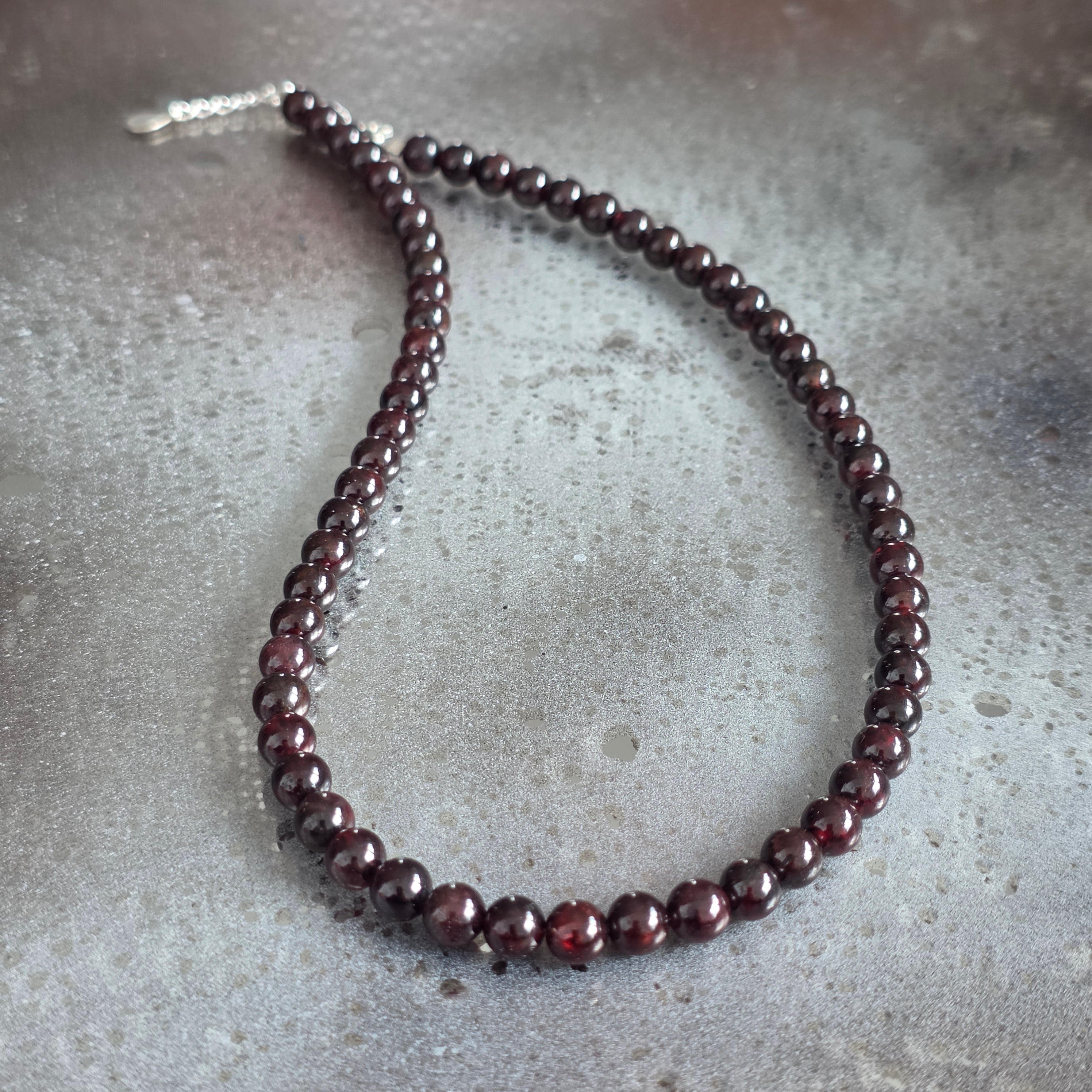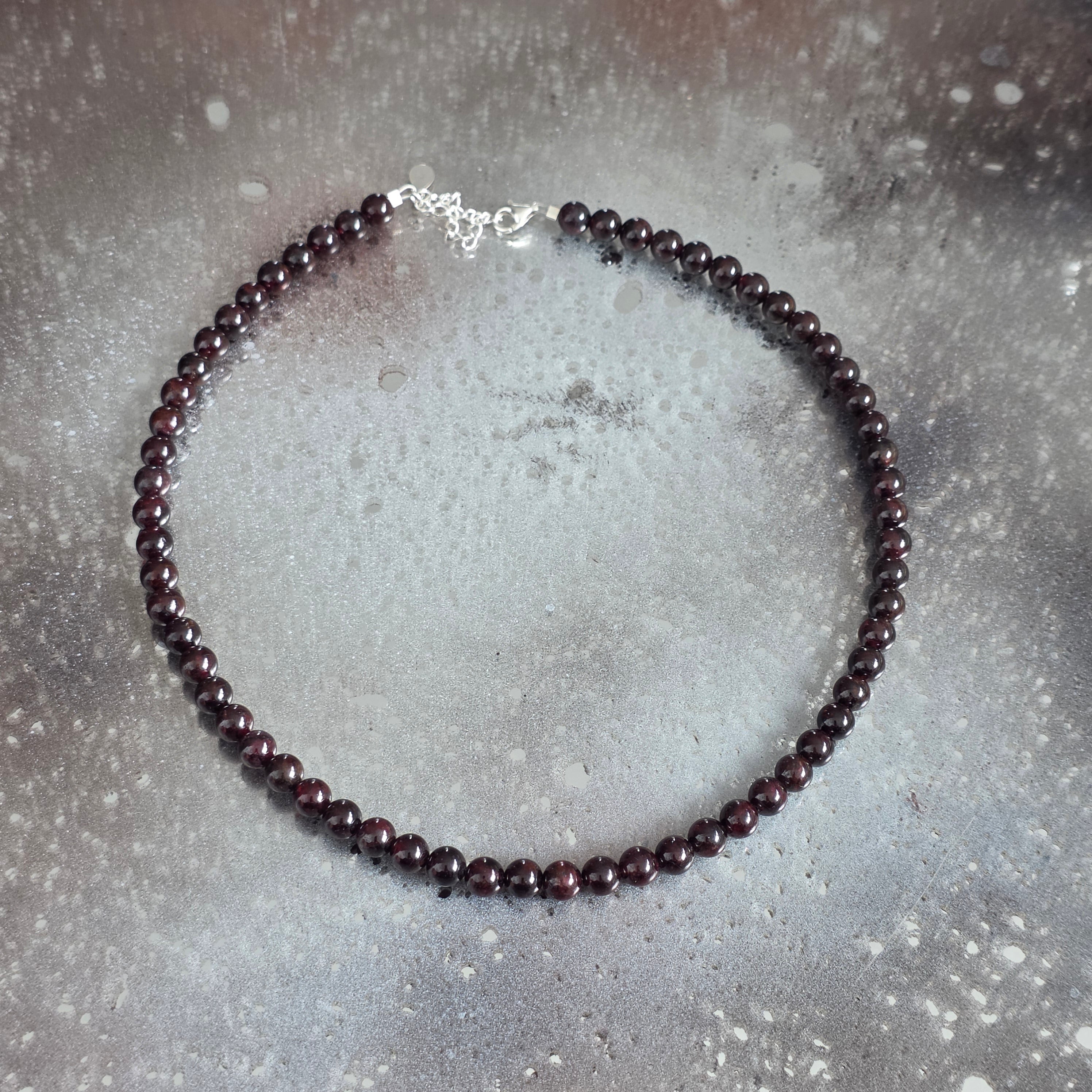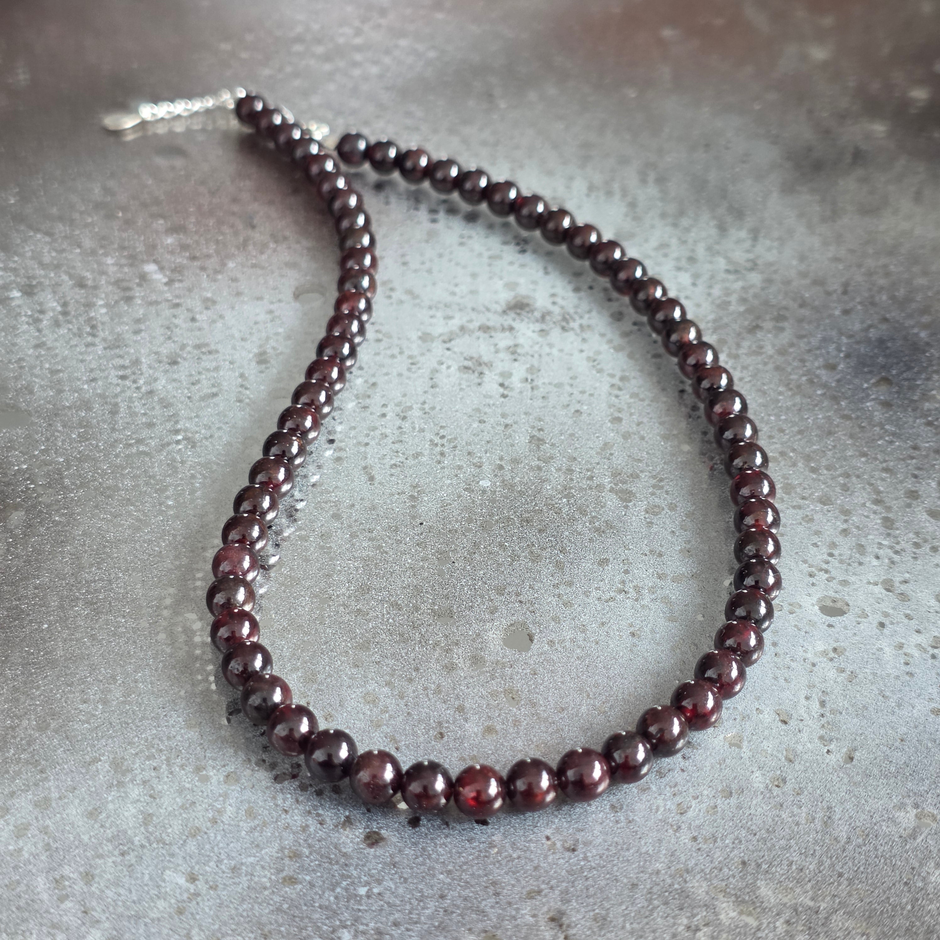 Un collier qui capture l'essence de la vitalité et de l'élégance naturelle. Le grenat naturel de 6 mm, avec ses nuances rouge foncé, possède un éclat discret, comme un cœur qui bat silencieusement au cœur de la terre. La simplicité des sphères lisses offre un aspect classique et intemporel, mettant en valeur la beauté authentique de la pierre.