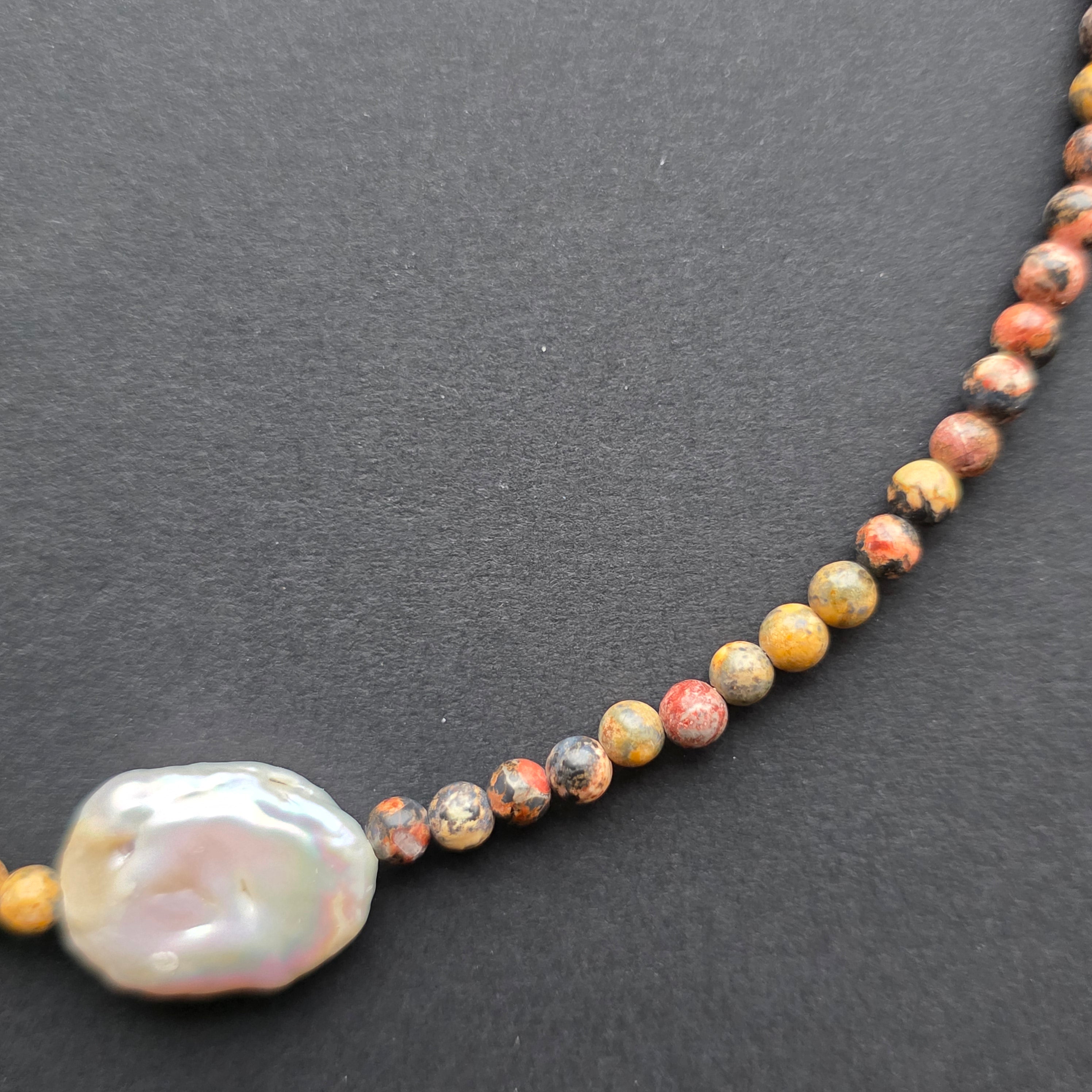 Un colier care poartă amprenta pământului și energia elementară a stabilității. Jaspul leopard natural de 4 mm dezvăluie modele organice, asemenea petelor fine de pe blana unui animal sălbatic, amintind de legătura profundă dintre om și natură. În centrul bijuteriei, o perlă naturală dreptunghiulară de 2 cm aduce o notă de lumină și echilibru, precum o rază albă într-un peisaj de piatră și pământ.