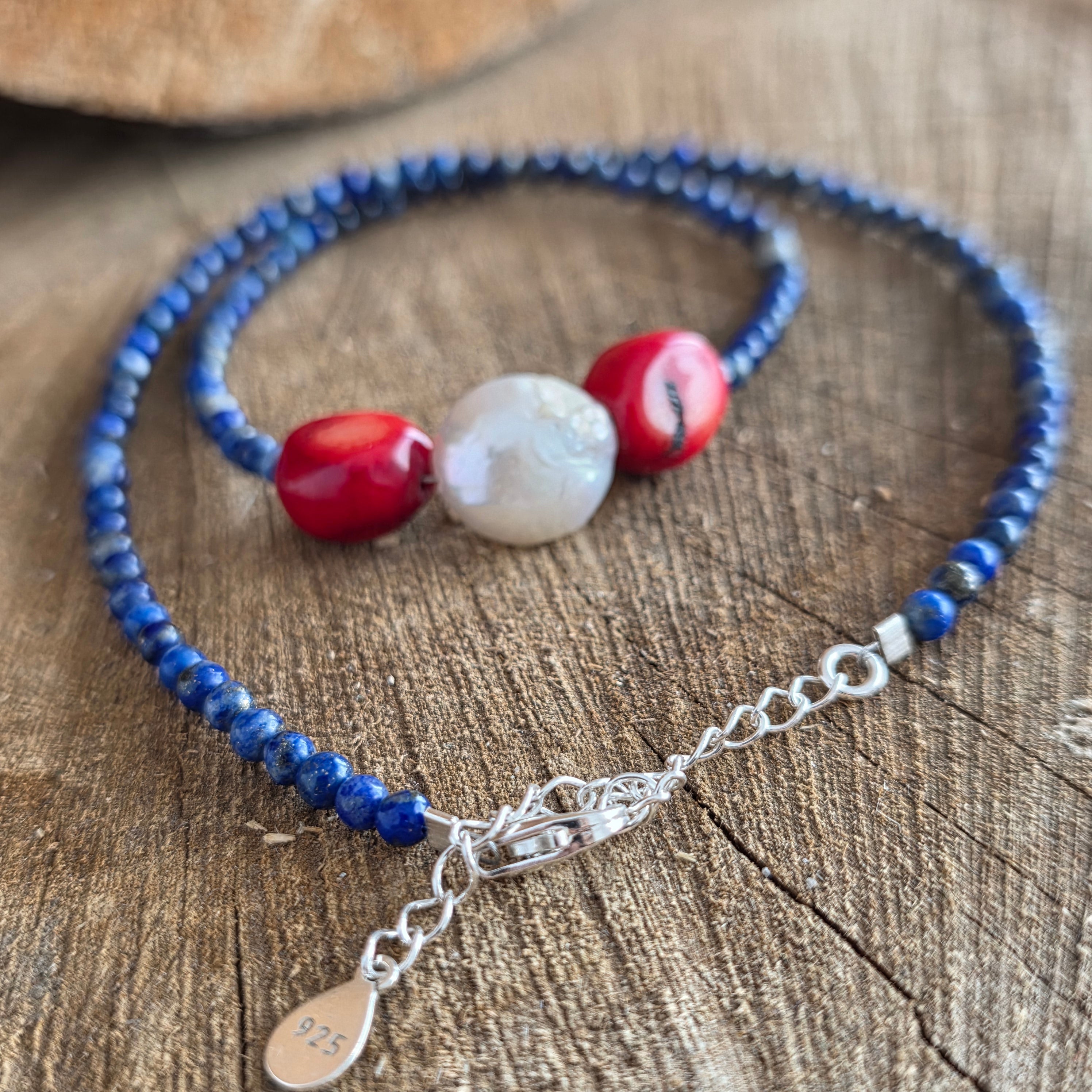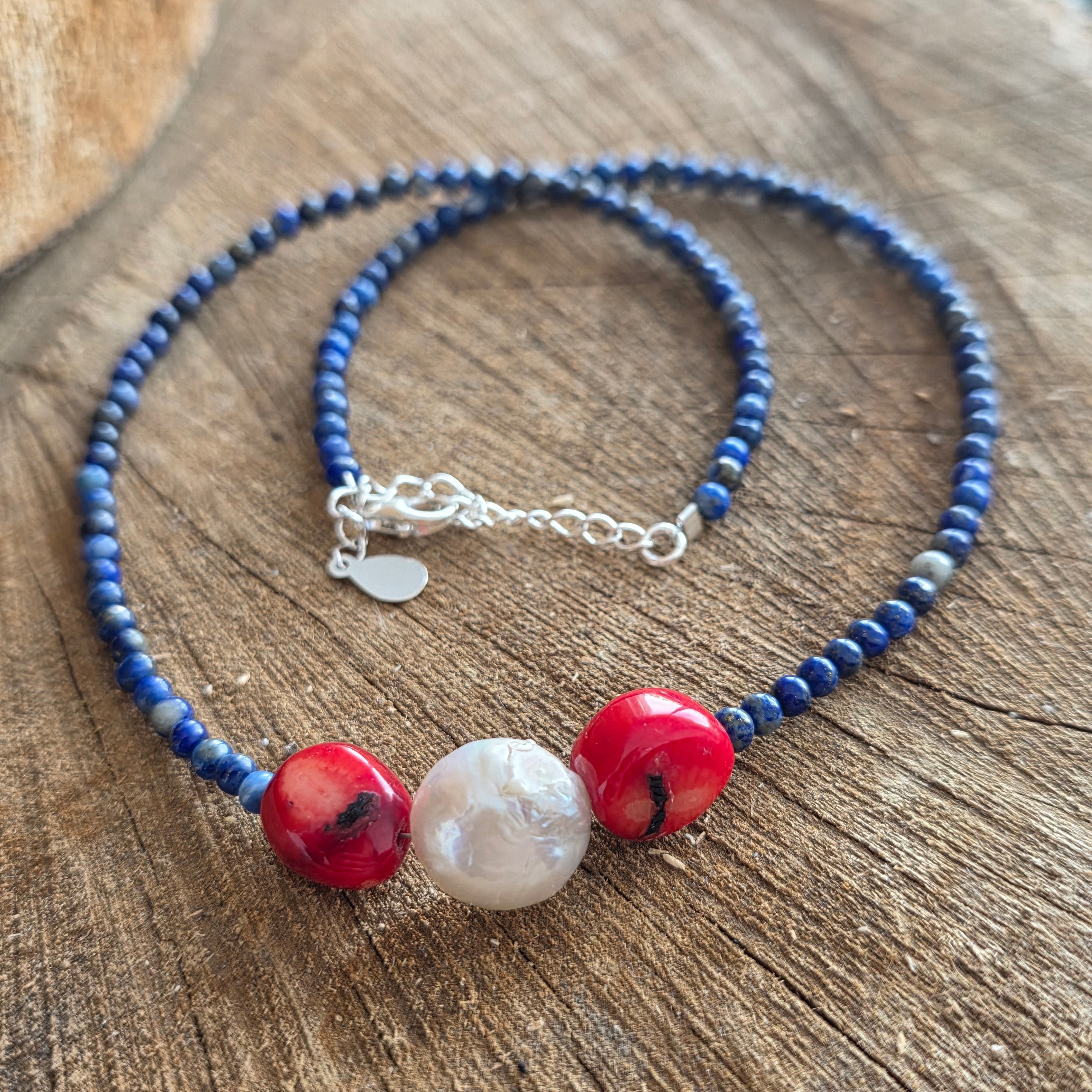 Matériels: Lapis lazuli peint (6 mm sphères), corail rouge (1 cm), perle naturel rectangulaire (2 cm), argent 925