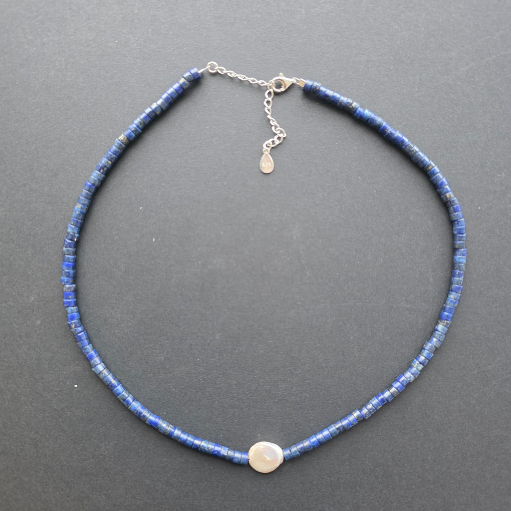 Un colier ce aduce împreună cerul și marea, într-un echilibru perfect între profunzime și puritate. Lapis lazuli-ul natural, tăiat în discuri de 4 mm, strălucește într-un albastru intens presărat cu reflexe aurii de pirită, evocând noaptea senină a Orientului antic. În centrul compoziției, o perlă naturală de 1 cm adaugă un accent de lumină calmă, ca o spumă albă peste valurile albastre.