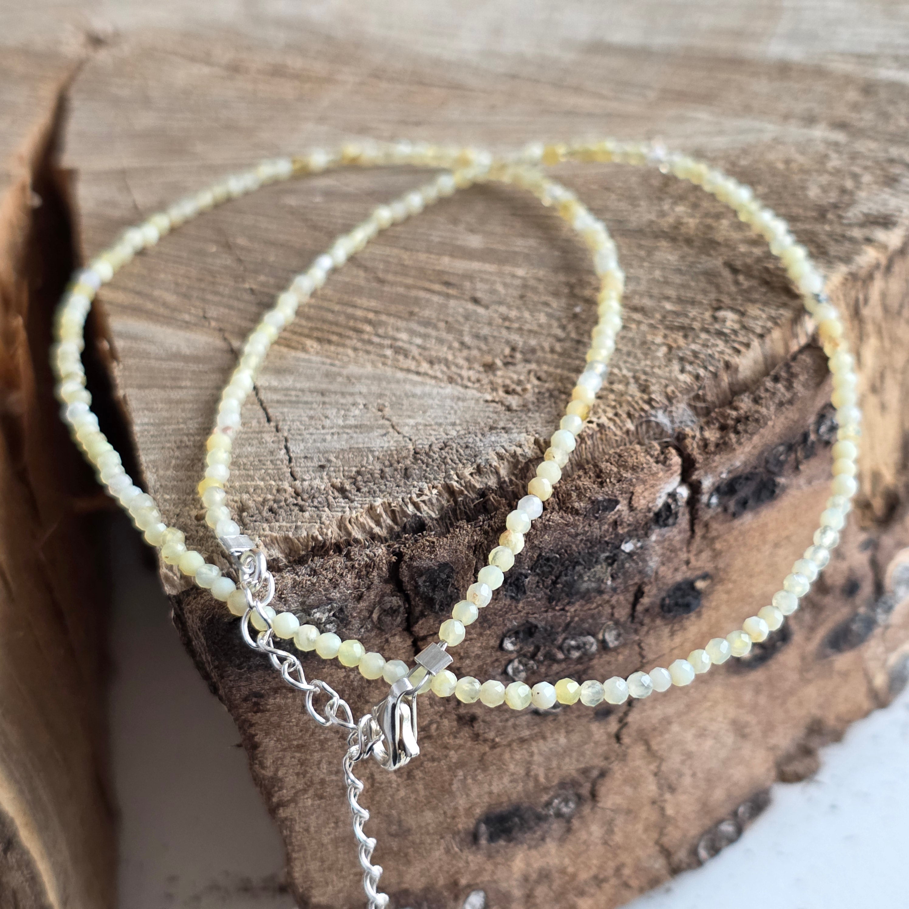 Le fil est composé de sphères de facette par 2,5 mm Opale jaune, des perles fines et translucides, avec une lueur douce qui semble venir de l'intérieur de la pierre. Ce n'est pas une couleur forte, mais diffuse, comme le miel dilué dans le thé chaud, comme l'aura d'une matinée silencieuse. Les réflexes opalescents, presque imperceptibles, ajoutent une vibration subtile de mystère et d'élégance.