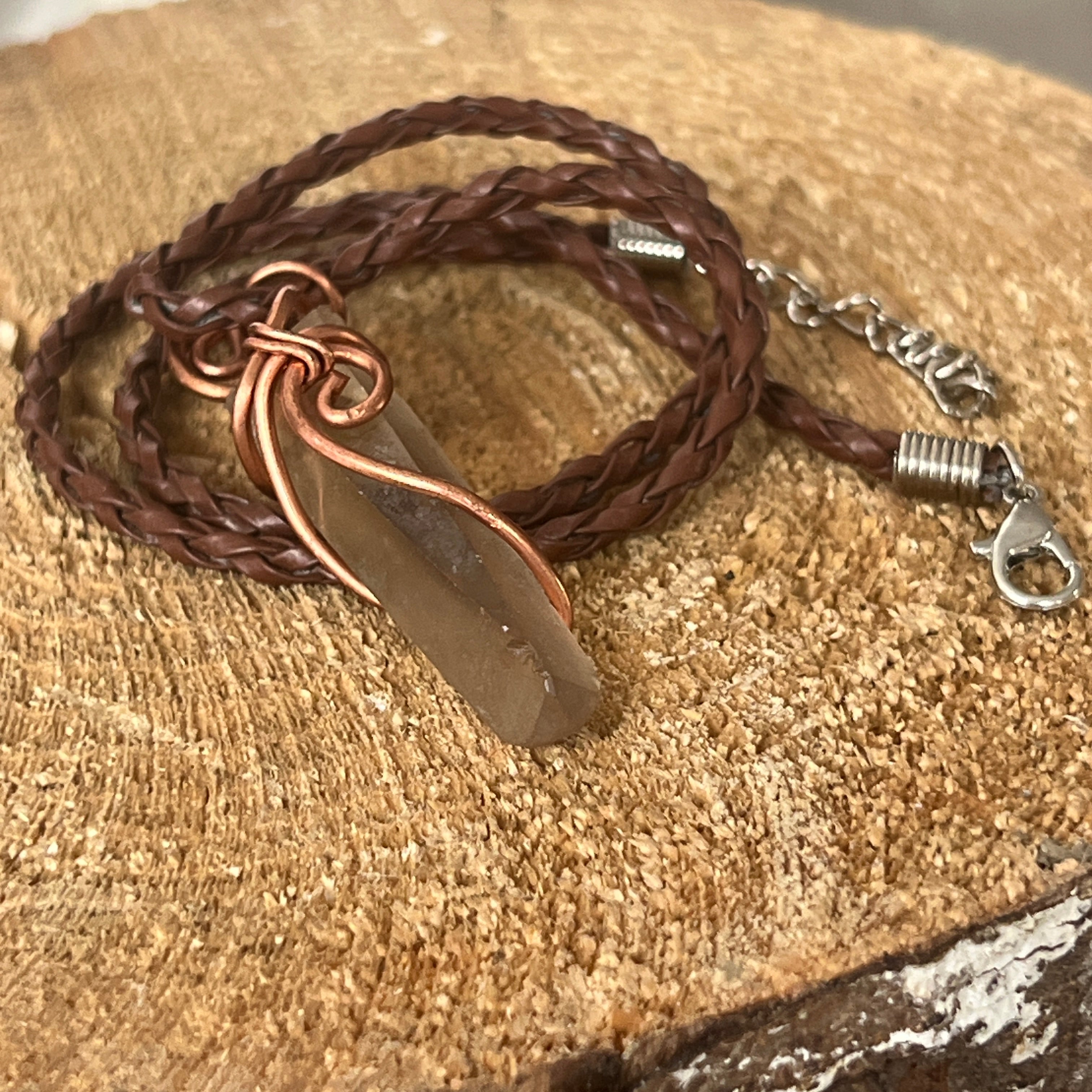Acest colier unicat aduce la viață magia Africii printr-un pandantiv de cuart fumuriu natural, provenit din Zimbabwe. Piatra, prinsă într-o montură artistică din cupru răsucit manual, își dezvăluie nuanțele profunde, de la gri translucid până la brun cald, care par să surprindă esența fumului ce se ridică ușor din focul purificator.