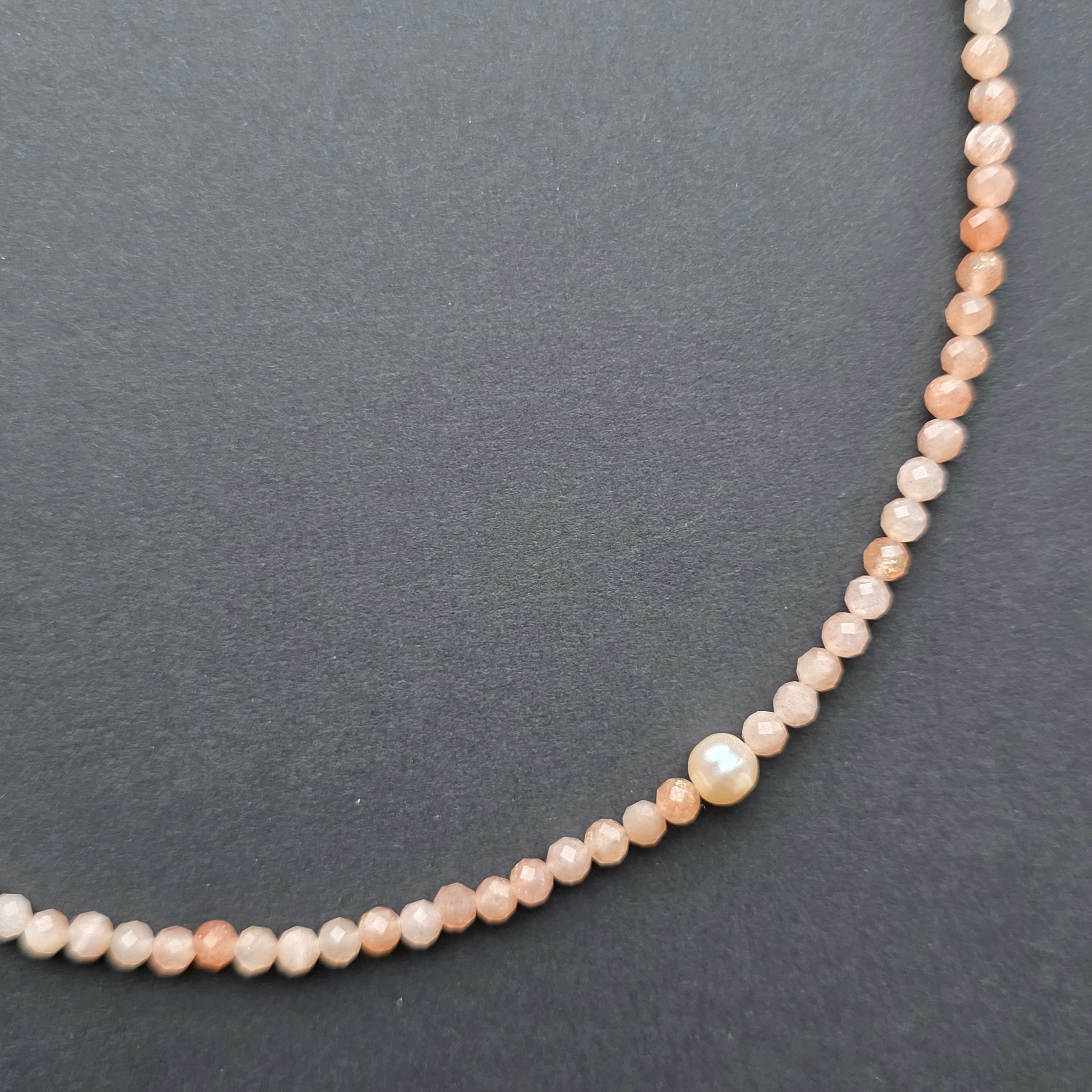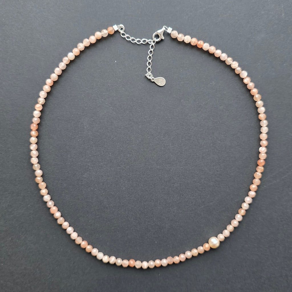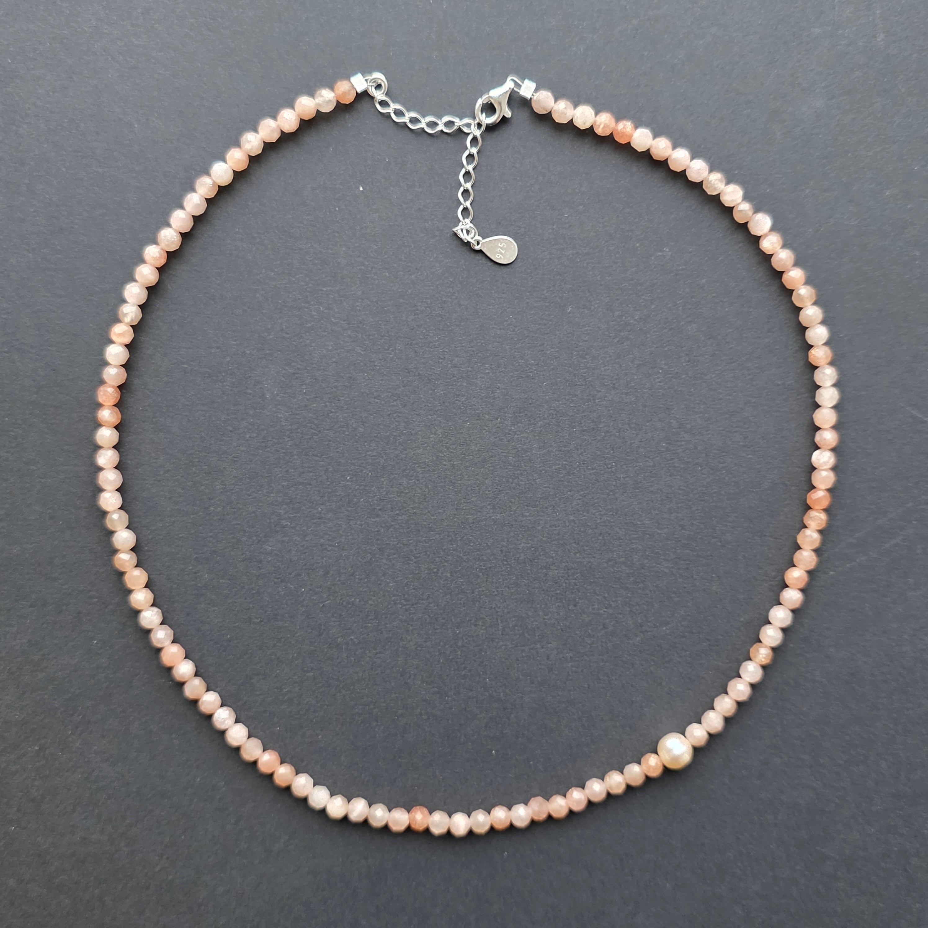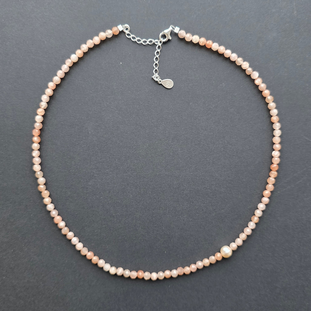 Un colier care poartă în el lumina zilelor senine și bucuria începuturilor. Piatra soarelui naturală fațetată de 4 mm strălucește în reflexe aurii și portocalii, asemenea razelor care ating valurile dimineții. Accentele de perle naturale rotunde de 6 mm adaugă o notă de echilibru și eleganță, transformând bijuteria într-o simfonie de căldură și lumină.