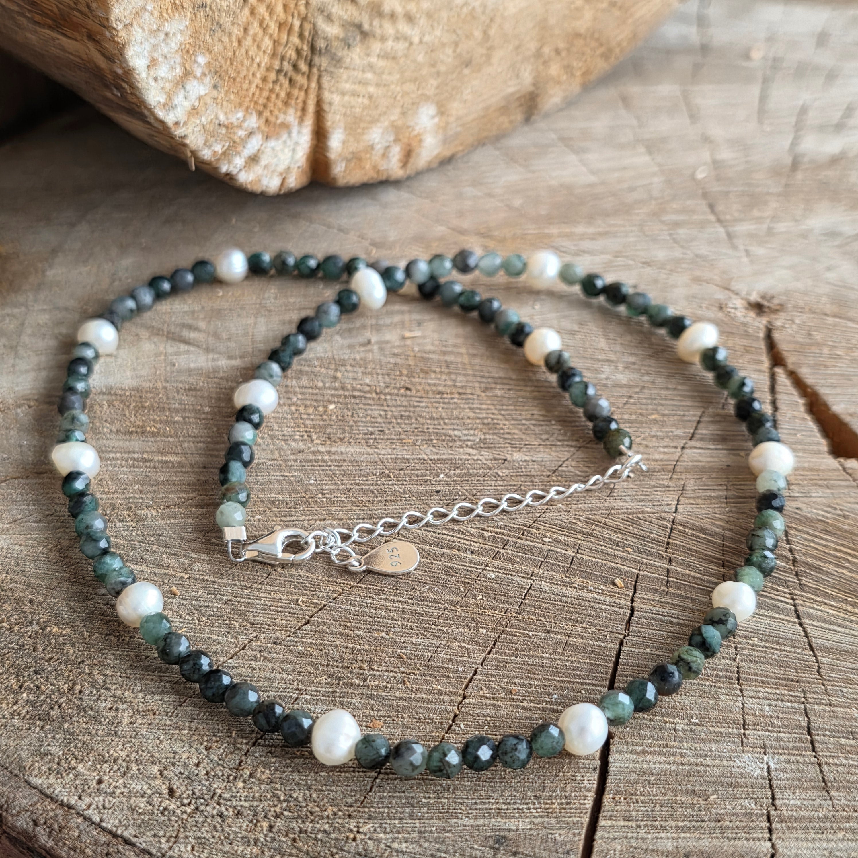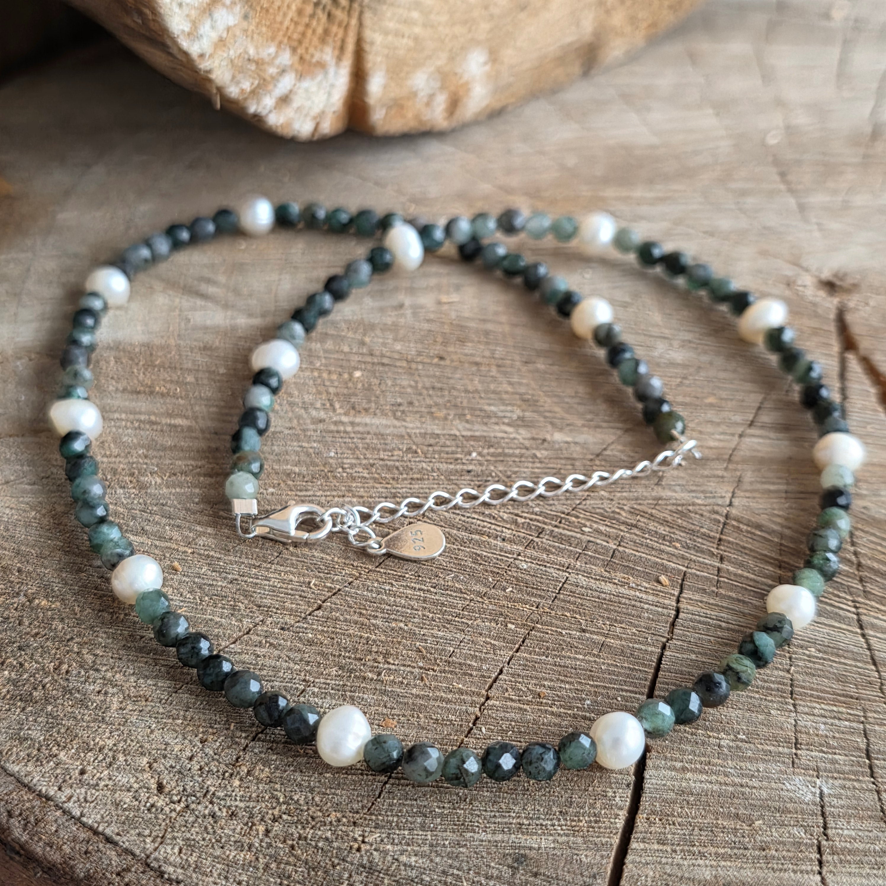 Materiale: smarald fațetat 3-4 mm,14 perle 5 mm, argint 925