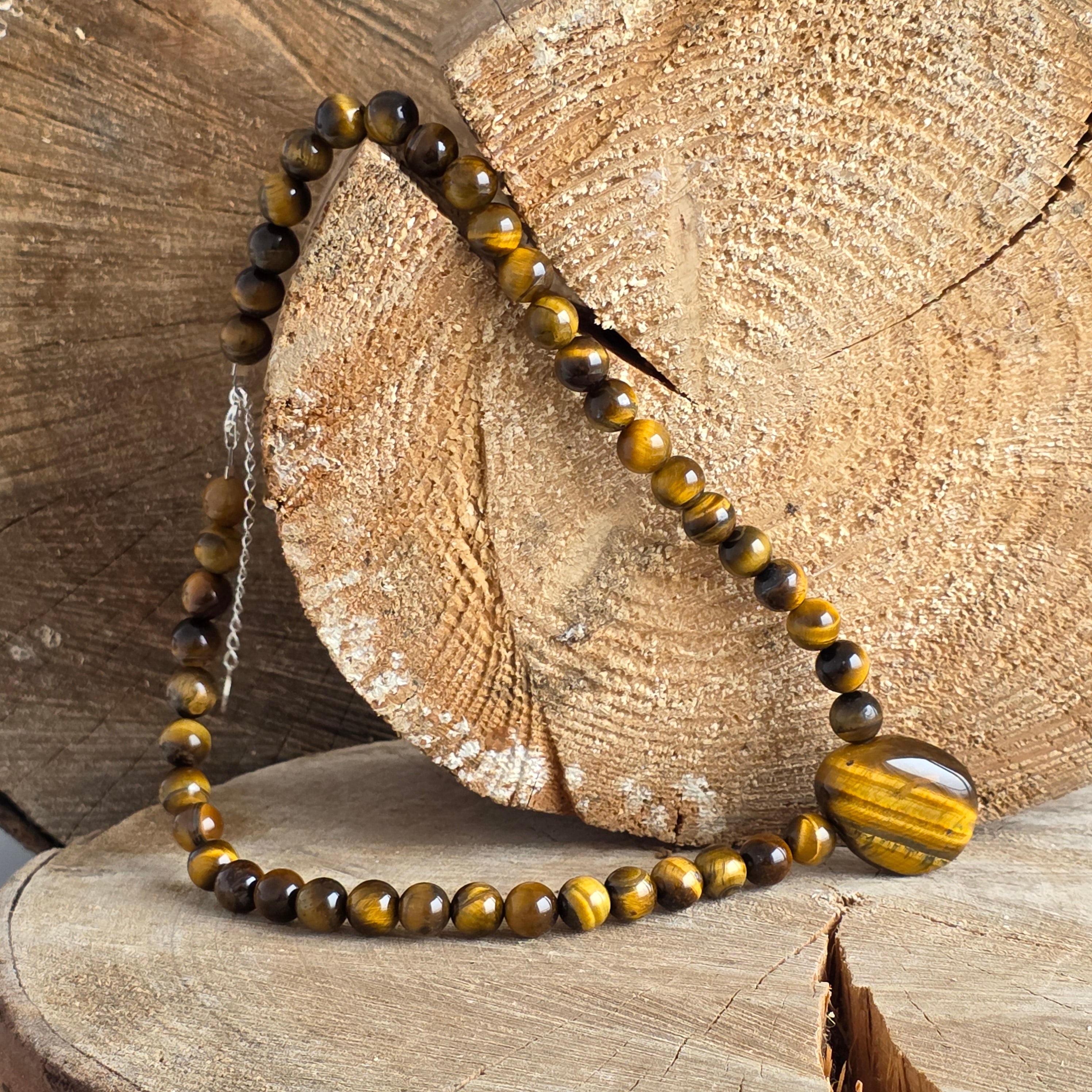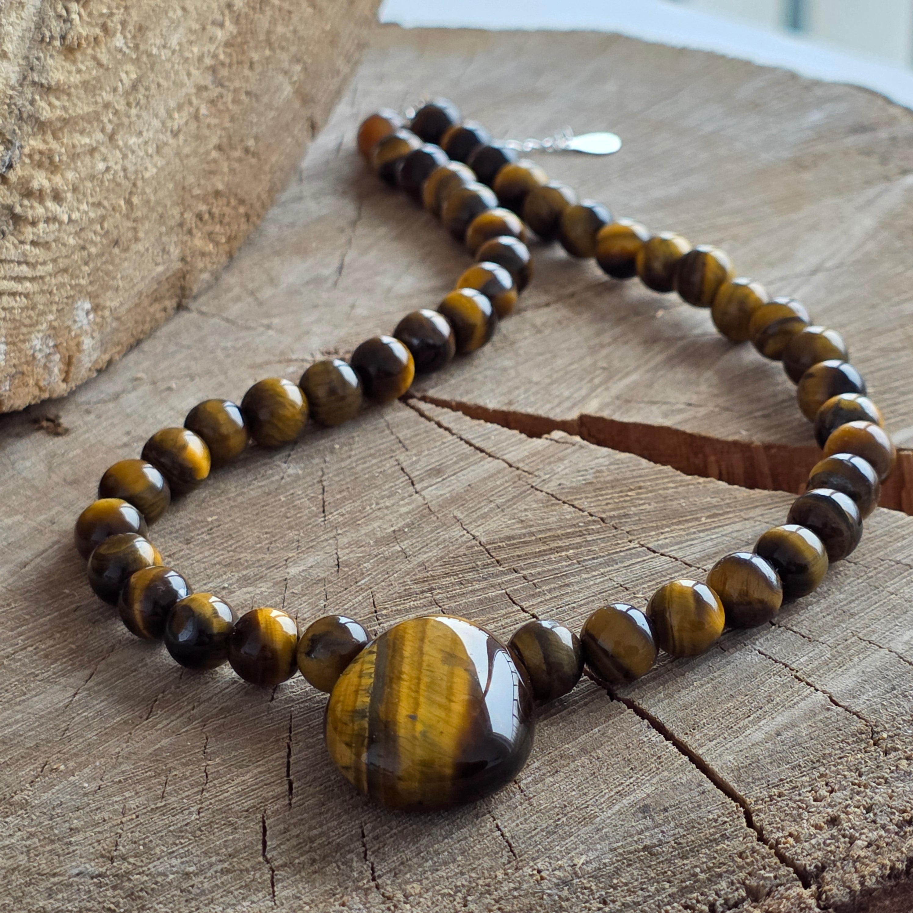 Un collier avec des lueur chauds et une protection ancestrale - créé à partir de sphères d'œil de tigre de 8 mm, avec des nuances dorées et brunâtres qui dansent comme des rayons de soleil à travers la forêt. Chaque pierre semble respirer la puissance silencieuse, la stabilité et l'instinct éveillé.