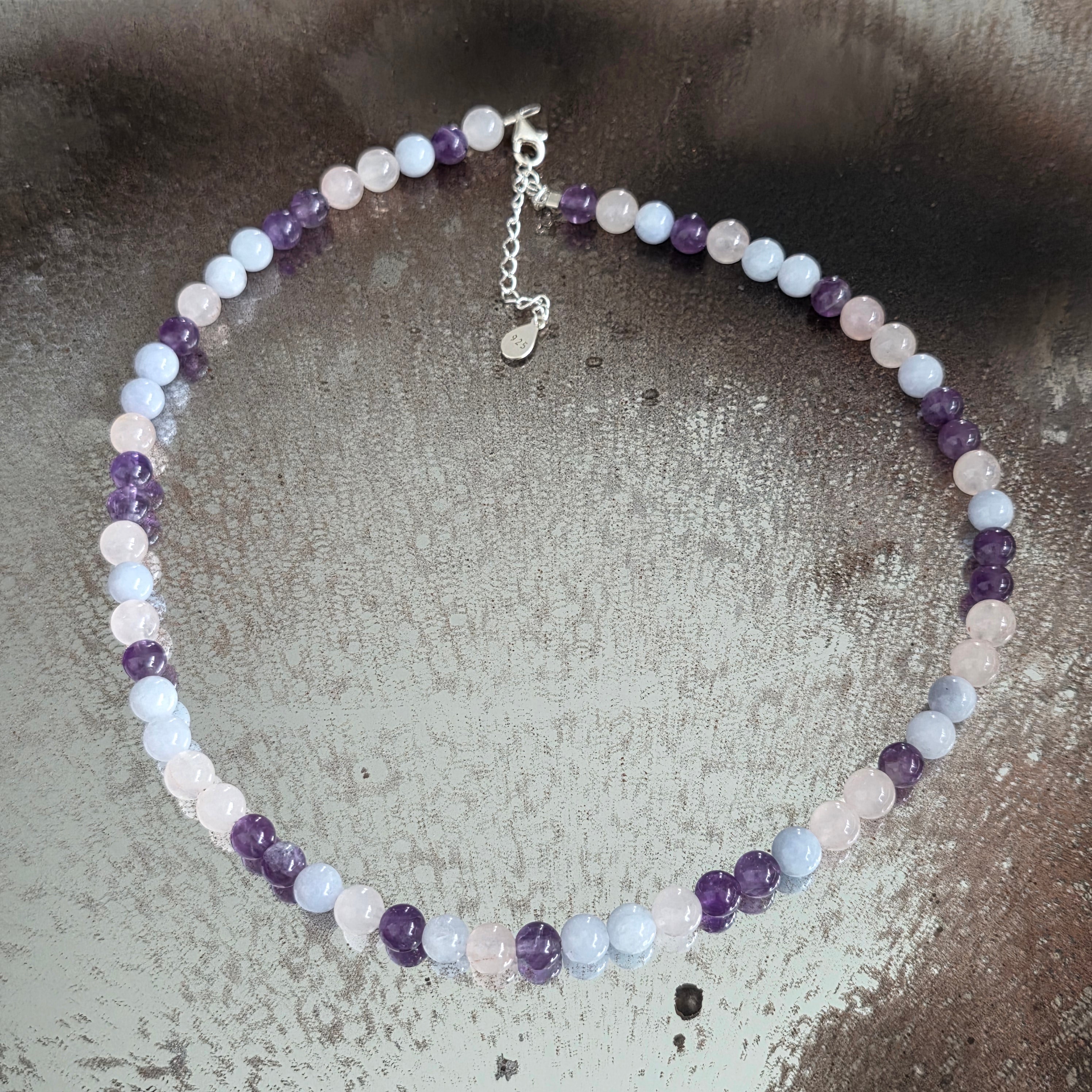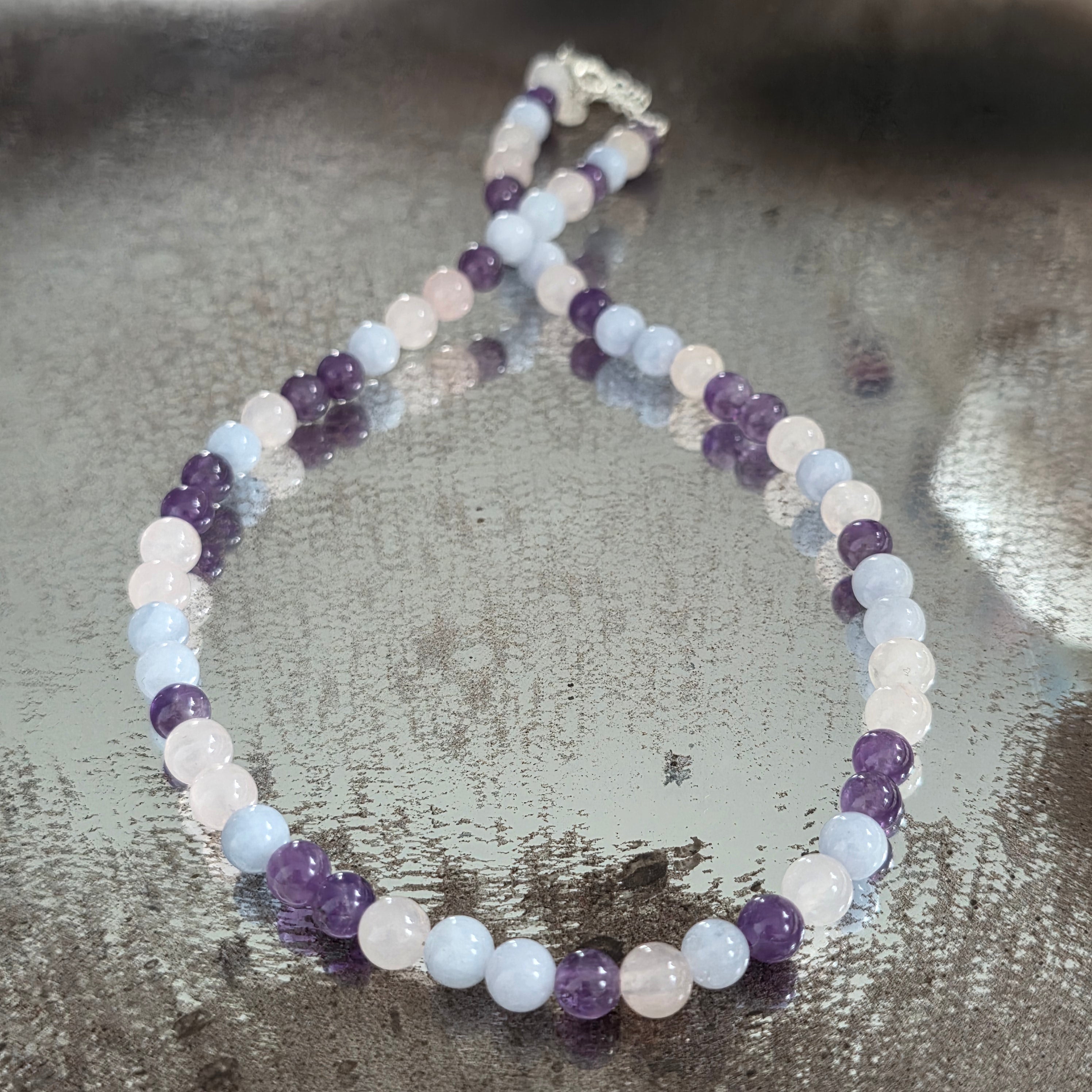 Matériaux : perles d'améthyste naturelle 6 mm, perles de quartz rose naturel 6 mm, perles d'aigue-marine naturelle 6 mm, argent 925