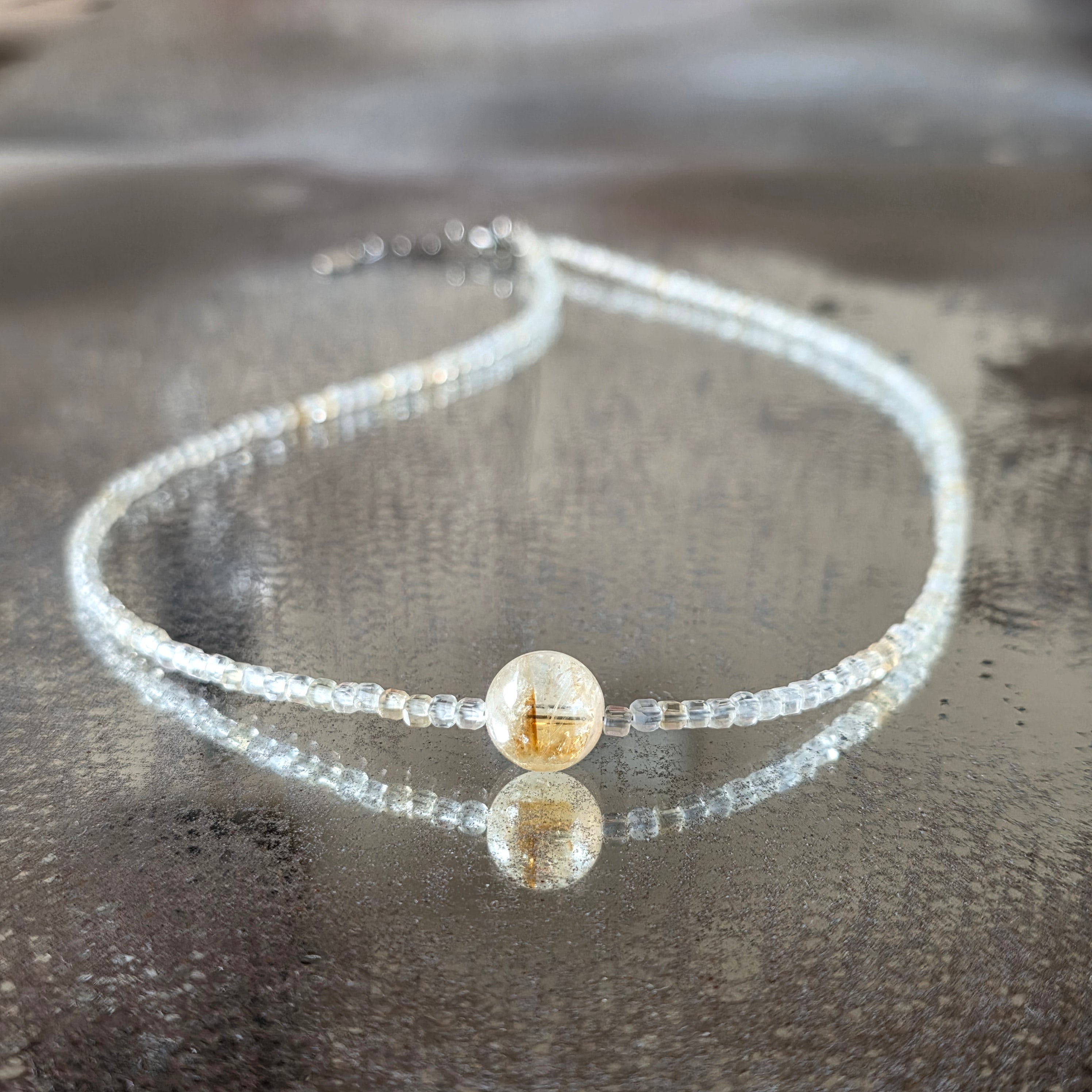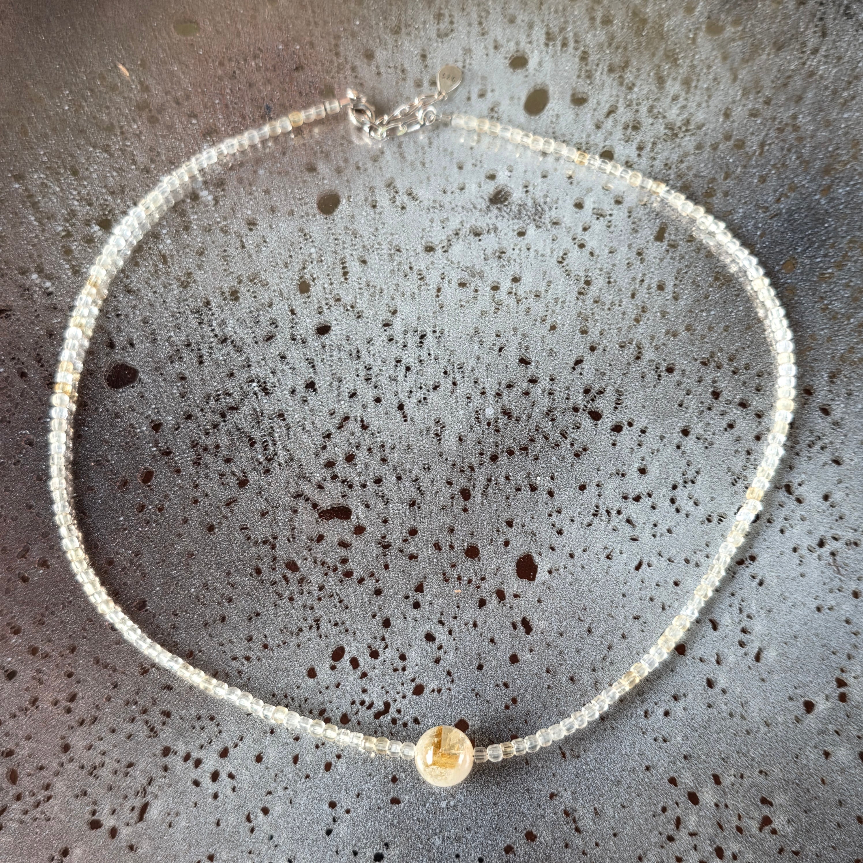 Un collier solaire, fin et rempli de lumière chaude. Réalisé en citrine facettée de 3 mm, chaque perle capte la lumière comme un rayon de soleil, reflétant optimisme et vitalité. Au centre du bijou se trouve une sphère de citrine de 10 mm, ronde et radieuse, comme un soleil intérieur qui pulse sérénité et douce puissance.