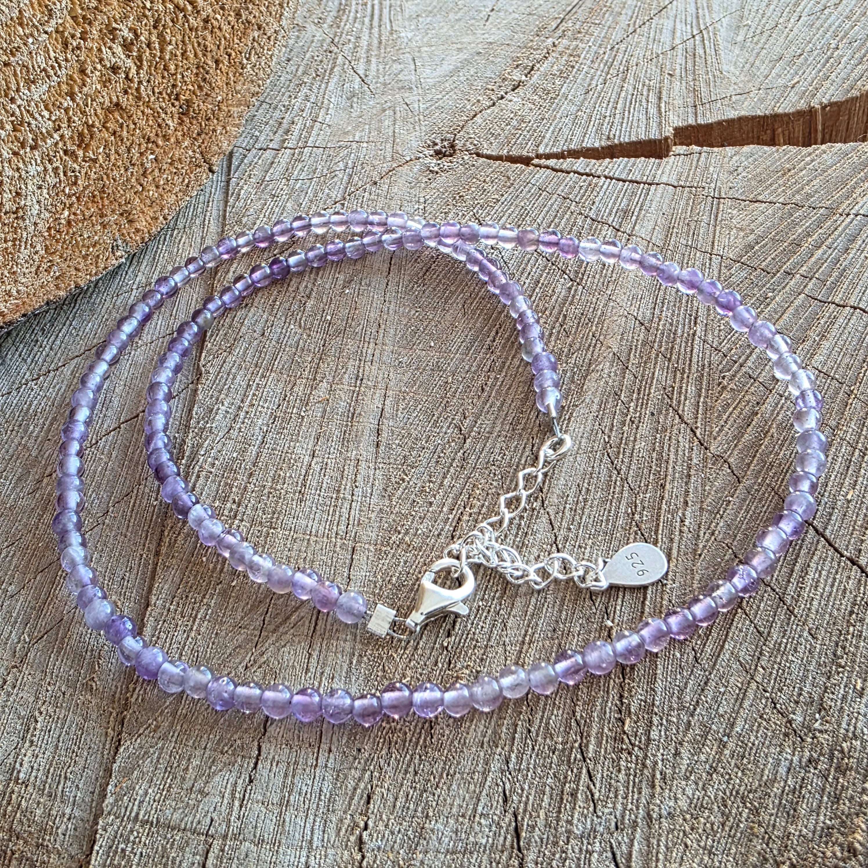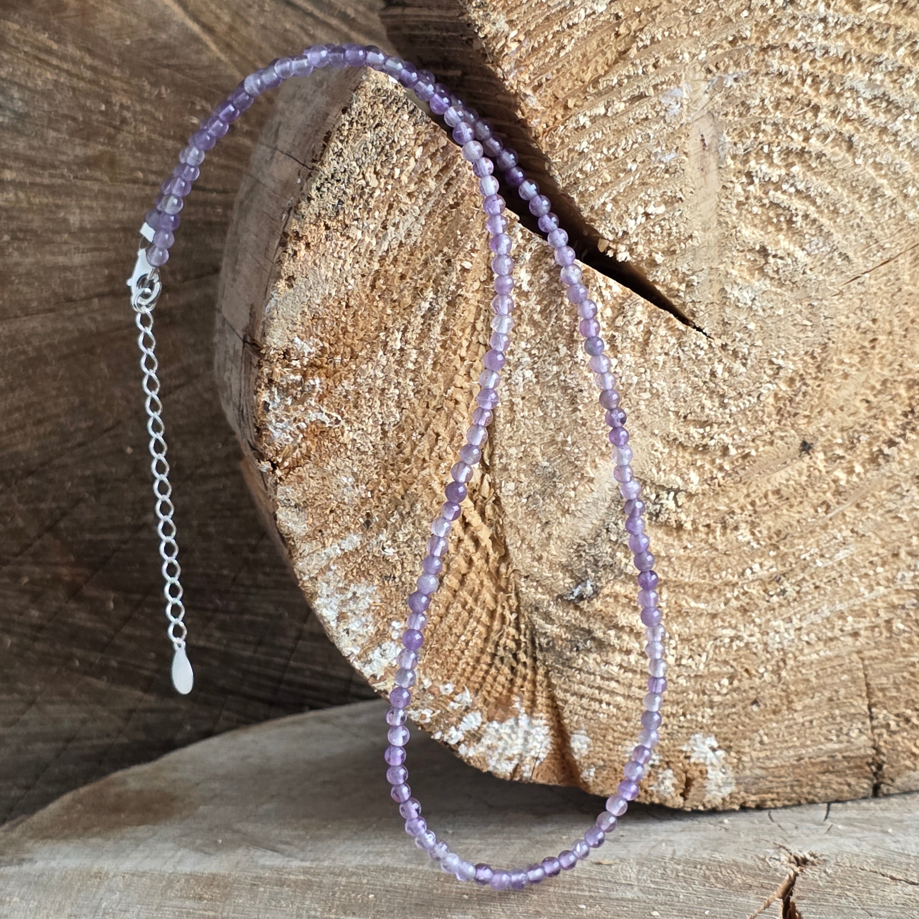 Un collier délicat avec une ambiance calme de pureté et d'élégance naturelles. De fines perles d'améthyste naturelle de 3 mm reposent harmonieusement sur le décolleté, reflétant la lumière dans une lueur douce, presque éthérée.