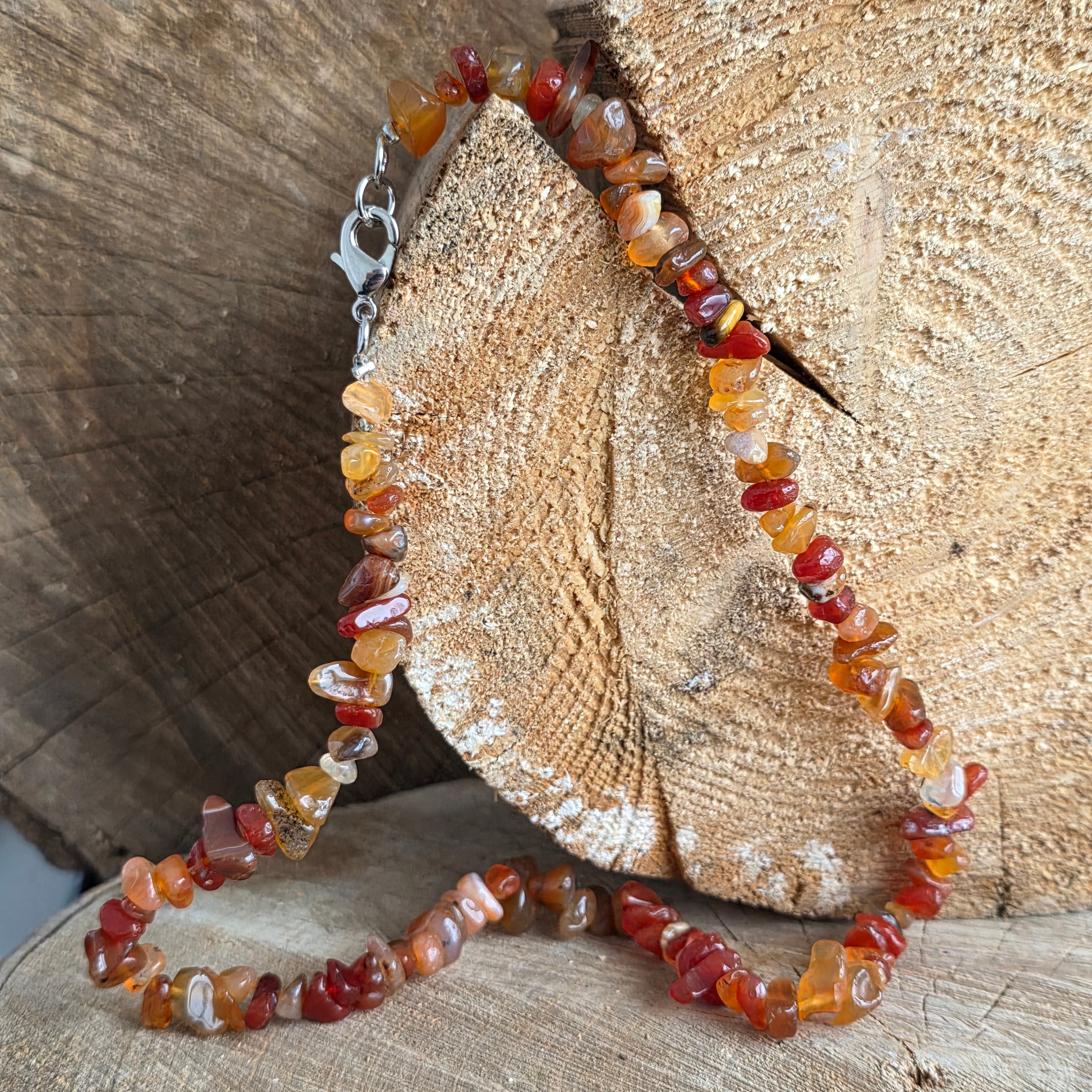 Un collier court et vibrant créé à partir de chips de cornaline naturelle, qui porte la lueur des couchers de soleil enflammés et l'énergie primaire de la Terre. Chaque morceau de cornaline, aux teintes allant de l'orange vif au rouge brique translucide, apporte une touche de chaleur et de courage à celui qui le porte.