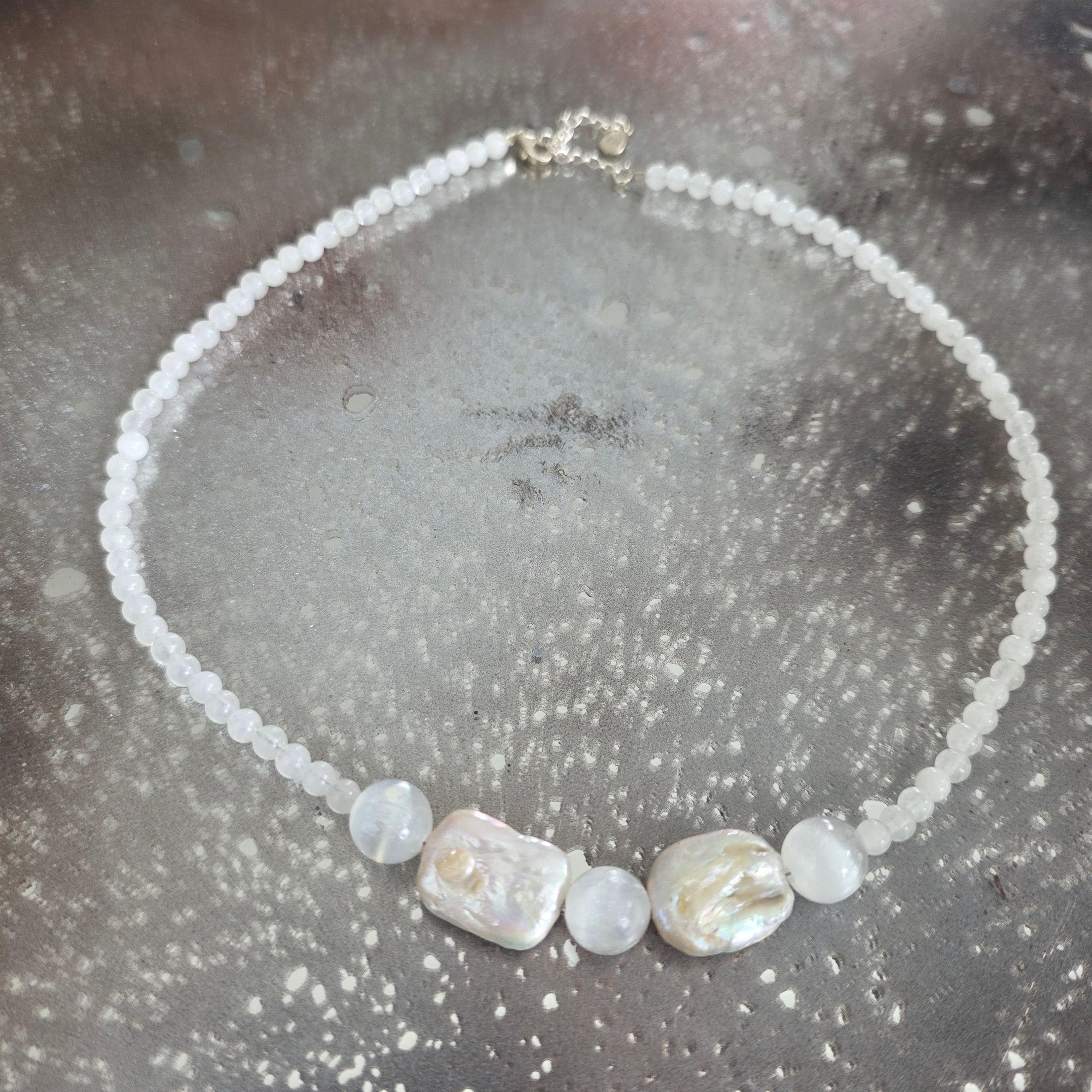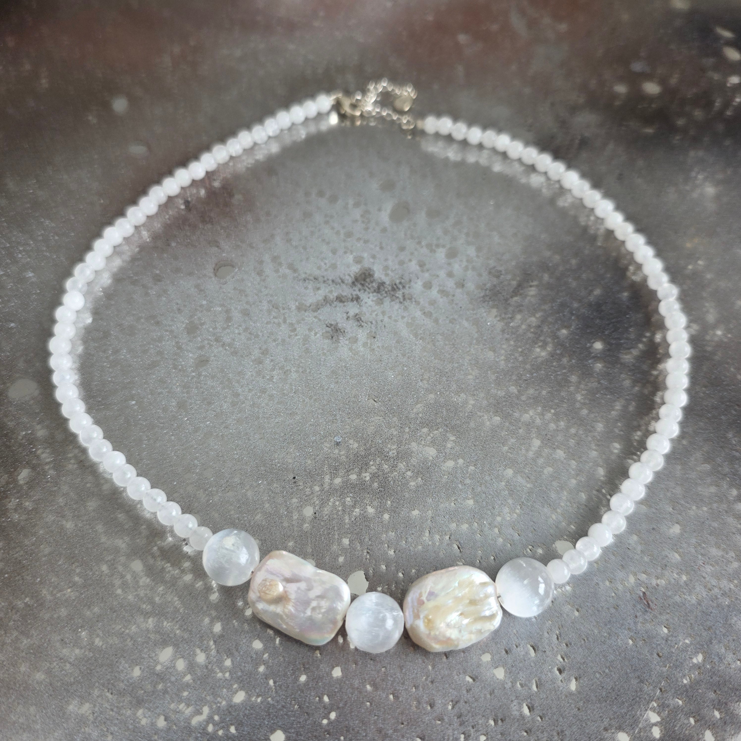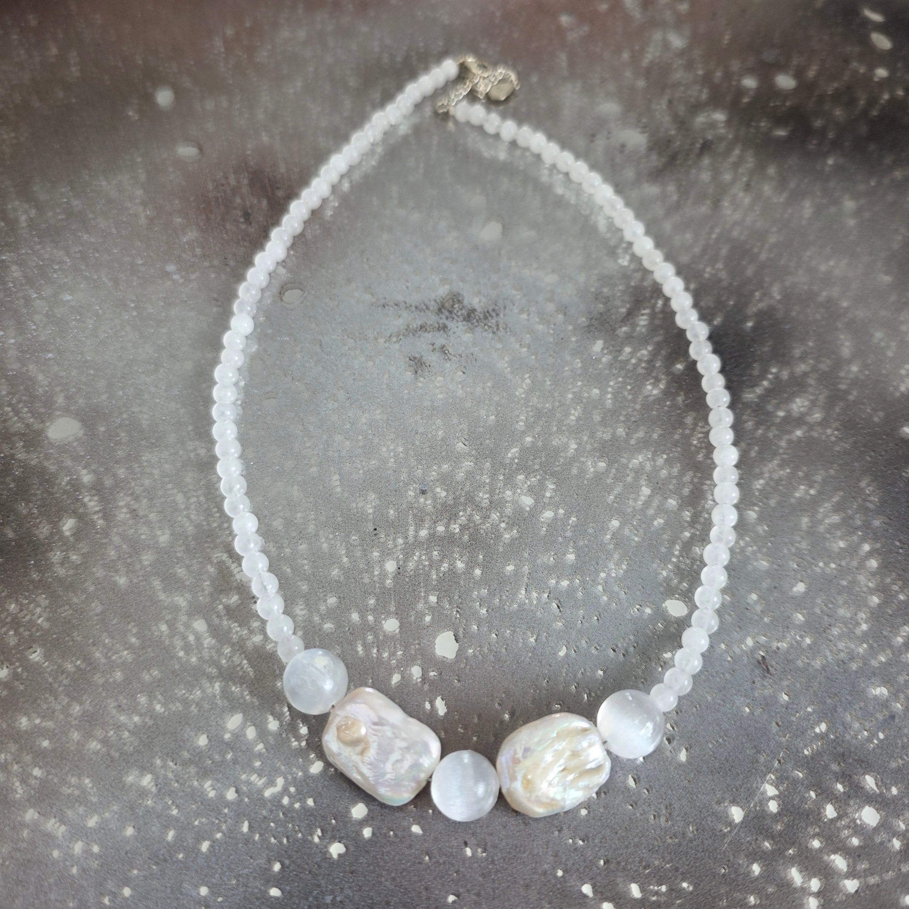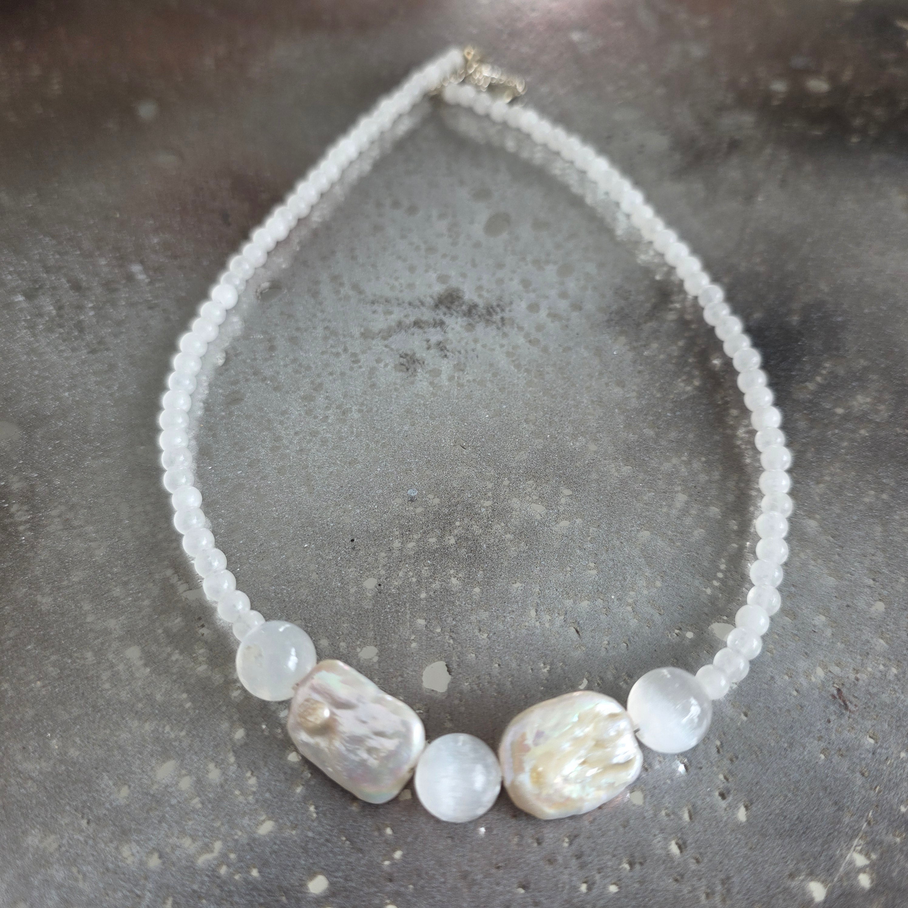 Au centre, le collier devient un véritable statement subtil, grâce aux 3 perles de sélénite de 10 mm, disposées symétriquement et encadrées par deux perles naturelles de forme rectangulaire, d'environ 2 cm. La sélénite apporte clarté et lumière, tandis que les perles, avec leur éclat irrégulier, ajoutent une touche de féminité intemporelle et de délicatesse organique.