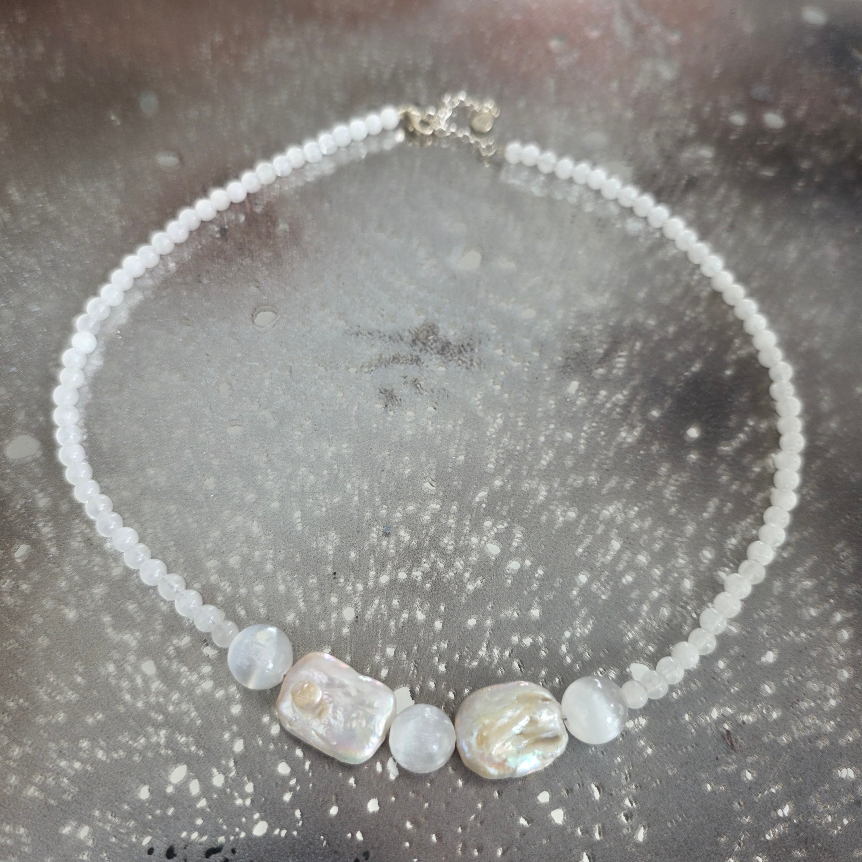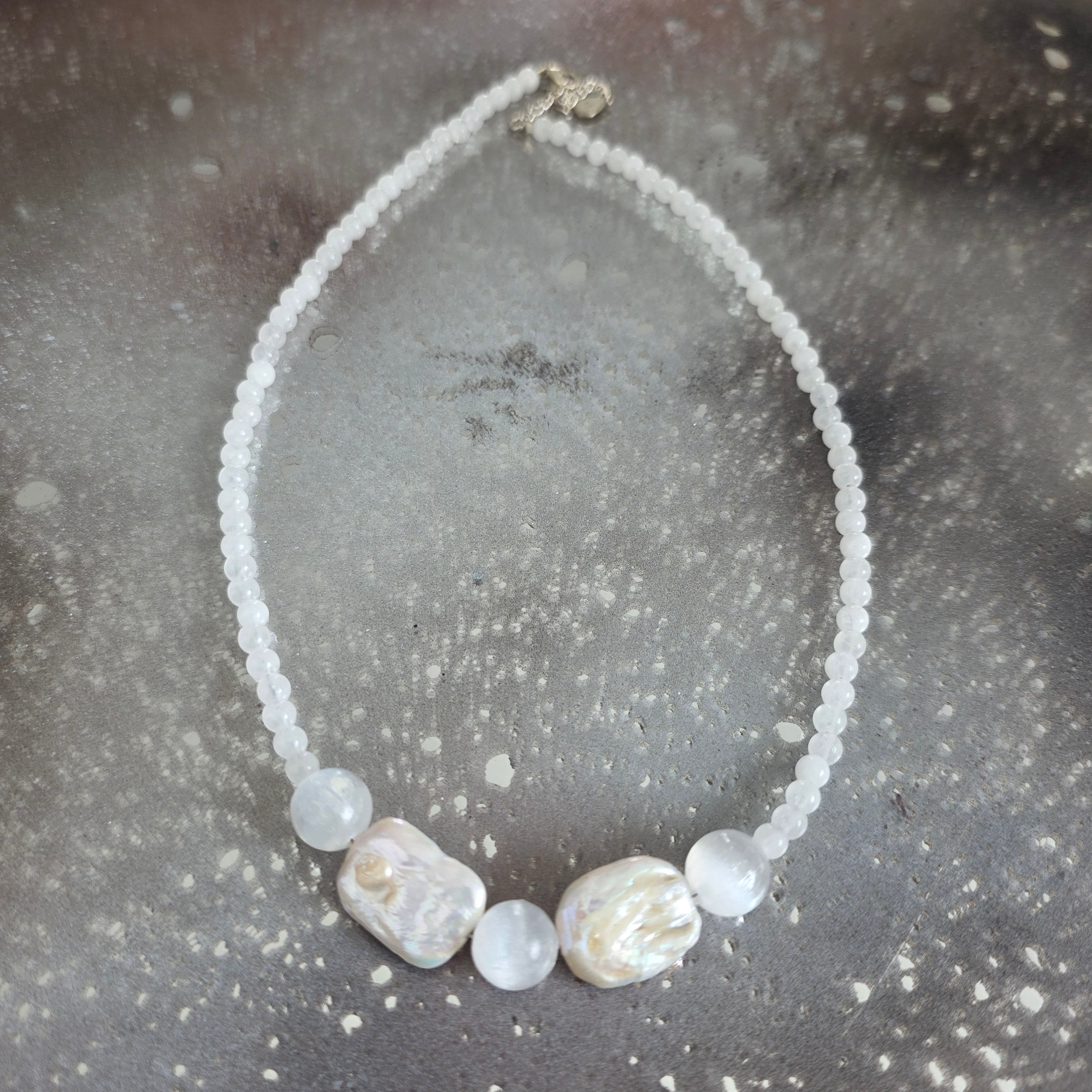 Description - Collier de jade blanc, sélénite et perle pusion # 96